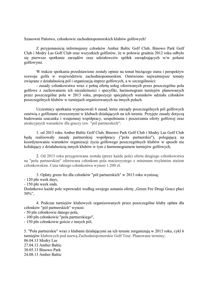 Z przyjemnością informujemy członków Amber Baltic Golf Club, Binowo Park Golf