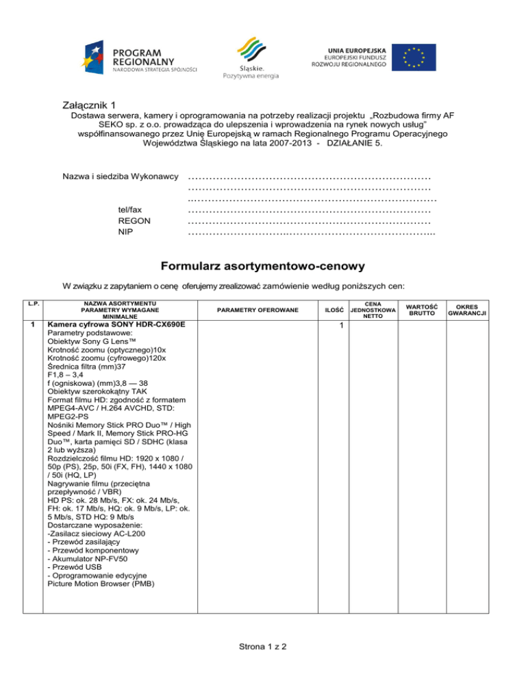 Załącznik 1 Dostawa serwera, kamery i oprogramowania na potrzeby realizacji projektu „Rozbudowa firmy AF SEKO sp. z o.o. prowadząca do ulepszenia i wprowadzenia na rynek nowych usług” współfinansowanego przez Unię Europejską w ramach Regionalnego Programu Operacyjnego Województwa Śląskiego na lata 2007-2013 - DZIAŁANIE 5. Nazwa i siedziba Wykonawcy tel/fax REGON NIP …………………………………………………………… …………………………………………………………… ..…………………………………………………………… …………………………………………………………… …………………………………………………………… ………………………..…………………………………... Formularz asortymentowo-cenowy W związku z zapytaniem o cenę oferujemy zrealizować zamówienie według poniższych cen: L.P. 1 NAZWA ASORTYMENTU PARAMETRY WYMAGANE MINIMALNE PARAMETRY OFEROWANE Kamera cyfrowa SONY HDR-CX690E Parametry podstawowe: Obiektyw Sony G Lens™ Krotność zoomu (optycznego)10x Krotność zoomu (cyfrowego)120x Średnica filtra (mm)37 F1,8 – 3,4 f (ogniskowa) (mm)3,8 — 38 Obiektyw szerokokątny TAK Format filmu HD: zgodność z formatem MPEG4-AVC / H.264 AVCHD, STD: MPEG2-PS Nośniki Memory Stick PRO Duo™ / High Speed / Mark II, Memory Stick PRO-HG Duo™, karta pamięci SD / SDHC (klasa 2 lub wyższa) Rozdzielczość filmu HD: 1920 x 1080 / 50p (PS), 25p, 50i (FX, FH), 1440 x 1080 / 50i (HQ, LP) Nagrywanie filmu (przeciętna przepływność / VBR) HD PS: ok. 28 Mb/s, FX: ok. 24 Mb/s, FH: ok. 17 Mb/s, HQ: ok. 9 Mb/s, LP: ok. 5 Mb/s, STD HQ: 9 Mb/s Dostarczane wyposażenie: -Zasilacz sieciowy AC-L200 - Przewód zasilający - Przewód komponentowy - Akumulator NP-FV50 - Przewód USB - Oprogramowanie edycyjne Picture Motion Browser (PMB) ILOŚĆ 1 Strona 1 z 2 CENA JEDNOSTKOWA NETTO WARTOŚĆ BRUTTO OKRES GWARANCJI 2 3 4 Serwer PowerEdge T610 ( z dwoma dyskami) z Windows Serwer 2003R2 Standard Edition Parametry serwera: Procesor: Intel Xeon X5650,6C,2.66GHz,12M Cache,6.40GT/s,95W Pamięć: 16GB Memory for 1 CPU, DDR3, 1066MHz (4x4GB Dual Ranked LV RDIMMs), Możliwość podłączenia macierzy Raid: C2 - RAID 1 for SAS 6iR or PERC 6i Controller, 2 HDDs 480801 [780-11108] Pierwsza karta kontrolera RAID lub SCSI: PERC 6/i, Integrated RAID Controller, 2x4 Connectors, PCIe, 256MB Cache 205565 [405-10923] Dysk twardy: 2x 1TB, SATA, 3.5-in, 7.2K RPM Hard Drive (Hot Plug) 205585 [400-16075] Zasilacz: High Output Power Supply, Redundant (2PSU), 870W, Performance BIOS Setting 205626 Przewód zasilający: 2x European Power Cord, 220V 209558 Karty zarządzające do serwera: iDRAC6 Express Server Management Card 205619 [565-10113] Karty sieciowe: Broadcom NetXtreme II 5709 Dual Port 1GbE NIC with TOE, PCIe-4 186357 Obsługa funkcji TOE (TCP/IP Offload Engine): Embedded Broadcom Gigabit Ethernet LOM with 2P TOE 77384 [541-10013] Urządzenia optyczne: 16X DVD+/-RW Drive with SATA Cable 319391 [429-14699] GC646MPP001 GlobalCare dla Logic Developer - PLC Professional - 5 szt. licencji pojedynczych GC646VSCEMK GlobalCare dla View Development dla QuickPanel CE 1 1 2 SUMA: SUMARYCZNA WARTOŚĆ BRUTTO: .......................................... PLN słownie…………………………………………………………………………………………………………………………………………… WARUNKI DOSTAWY: 1. Termin dostawy: do 31.03.2012 2. Płatność: przelew do 21 dni od daty otrzymania towaru i faktury. Miejscowość……………..……data………….. ………………………………………………………………….. Podpis osoby uprawnionej Strona 2 z 2