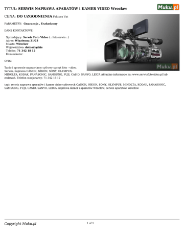 TYTUŁ: SERWIS NAPRAWA APARATÓW i KAMER VIDEO Wrocław CENA: DO UZGODNIENIA Faktura Vat PARAMETRY: Gwarancja , Uszkodzony DANE KONTAKTOWE: Sprzedający: Serwis Foto Video (.: fotoserwis :.) Adres: Więzienna 21/23 Miasto: Wrocław Województwo: dolnośląskie Telefon: 71 342 18 12 Komunikator: OPIS: Tanio i sprawnie naprawiamy cyfrowy sprzęt foto - video. Serwis, naprawa CANON, NIKON, SONY, OLYMPUS, MINOLTA, KODAK, PANASONIC, SAMSUNG, FUJI, CASIO, SANYO, LEICA Aktualne informacje na: www.serwisfotovideo.pl lub zadzwoń. Telefon stacjonarny: 71 342 18 12 tagi: serwis naprawa aparatów i kamer video cyfrowych CANON, NIKON, SONY, OLYMPUS, MINOLTA, KODAK, PANASONIC, SAMSUNG, FUJI, CASIO, SANYO, LEICA. naprawa kamer i aparatów Wrocław, serwis aparatów Wrocław Copyright Muku.pl 1 of 1
