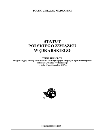 POLSKI ZWIĄZEK WĘDKARSKI STATUT POLSKIEGO ZWIĄZKU WĘDKARSKIEGO TEKST JEDNOLITY uwzględniający zmiany uchwalone na Nadzwyczajnym Krajowym Zjeździe Delegatów Polskiego Związku Wędkarskiego w dniu 19 października 2007 r. PAŹDZIERNIK 2007 r. 1 ROZDZIAŁ I Postanowienia ogólne §1 Polski Związek Wędkarski, w skrócie PZW, zwany dalej Związkiem, jest dobrowolnym, samorządnym stowarzyszeniem miłośników wędkarstwa i sportu wędkarskiego, kontynuatorem tradycji zorganizowanego wędkarstwa w Polsce. §2 1. Podstawą prawną działania Związku jest: a) Ustawa z dnia 7 kwietnia 1989 r. - Prawo o stowarzyszeniach (Dz. U. Nr 20, poz. 104 z 1989 r. z późniejszymi zmianami); b) Ustawa z dnia 29 lipca 2005 r. o sporcie kwalifikowanym (Dz. U. Nr 155, poz. 1298 z 2005 r. z późniejszymi zmianami); c) Ustawa z dnia 18 stycznia 1996 r. o kulturze fizycznej (Dz. U. Nr 89, poz. 889 z 1996 r. z późniejszymi zmianami); d) Ustawa z dnia 24 kwietnia 2003 r. o działalności poŜytku publicznego i o wolontariacie (Dz. U. Nr 96, poz. 873 z 2003 r. z późniejszymi zmianami); e) Statut Polskiego Związku Wędkarskiego. 2. Związek posiada osobowość prawną. 3. Związek jest organizacją uprawnioną do realizacji zadań polskich związków sportowych w zakresie kwalifikowanego sportu wędkarskiego. §3 1. Terenem działalności Związku jest obszar Rzeczypospolitej Polskiej, a siedzibą władz i organów naczelnych jest m.st. Warszawa. 2. Strukturę organizacyjną Związku tworzą koła i okręgi, jako jednostki terenowe Związku. 3. Osobowość prawną mogą posiadać okręgi, jako terenowe jednostki organizacyjne. 4. Okręg moŜe być organizacją poŜytku publicznego w rozumieniu ustawy określonej w § 2 ust. 1 lit. d. 5. Związek moŜe być członkiem międzynarodowych organizacji wędkarskich. 1. 2. 3. 4. 5. §4 Związek uŜywa godła i barw, a władze i organy Związku pieczęci określającej ich nazwę. Wzór godła i barw ustala, na wniosek Zarządu Głównego, Krajowy Zjazd Delegatów. Godło Związku podlega ochronie prawnej. Wzór pieczęci Związku ustala Zarząd Główny. Związek obchodzi w dniu 19 marca święto wędkarstwa polskiego – Dzień Wędkarza. §5 1. Związek opiera działalność na pracy społecznej swych członków, a do prowadzenia spraw moŜe tworzyć biura i jednostki gospodarcze oraz zatrudniać pracowników. 2. Do dokonywania za Związek czynności z zakresu prawa pracy upowaŜnieni są odpowiednio: dyrektor biura Zarządu Głównego i dyrektorzy biur zarządów okręgów. 3. Czynności z zakresu prawa pracy w stosunku do dyrektora biura wykonuje prezes odpowiedniego zarządu w trybie określonym w § 30 pkt 24 i § 46 pkt 25. 2 ROZDZIAŁ II Cele i środki działania Związku §6 Celem Związku jest organizowanie i promowanie wędkarstwa, rekreacji, sportu wędkarskiego, uŜytkowanie i ochrona wód, działanie na rzecz ochrony przyrody i kształtowanie etyki wędkarskiej. §7 Cele Związku realizowane są poprzez: 1) reprezentowanie interesów Związku w kraju i za granicą; 2) współpracę z krajowymi, międzynarodowymi i zagranicznymi organizacjami wędkarskimi; 3) współpracę z organizacjami i instytucjami proekologicznymi; 4) współdziałanie z podmiotami powołanymi do ochrony przyrody, ekosystemów wodnych, zwalczania kłusownictwa rybackiego i innych szkód w środowisku wodnym; 5) współdziałanie z ośrodkami naukowo-badawczymi, między innymi w zakresie ochrony ginących gatunków ryb i ich restytucji; 6) nabywanie i uŜytkowanie wód, prowadzenie racjonalnej gospodarki rybackiej i wędkarskiej; 7) prowadzenie ośrodków zarybieniowych; 8) prowadzenie działalności gospodarczej z przeznaczeniem dochodów na działalność statutową; 9) prowadzenie schronisk i przystani oraz innych obiektów słuŜących uprawianiu wędkarstwa i rekreacji; 10) upowszechnianie sportu wędkarskiego, organizowanie zawodów wędkarskich w kraju oraz uczestnictwo w takich zawodach za granicą; 11) organizowanie rekreacyjnych imprez wędkarskich; 12) organizowanie współzawodnictwa sportowego opartego o zasady obowiązujące w polskich związkach sportowych; 13) wyłanianie kadry narodowej w dyscyplinach kwalifikowanego sportu wędkarskiego; 14) popularyzowanie idei wędkarstwa i działalności PZW wśród dzieci i młodzieŜy oraz prowadzenie pracy oświatowo-wychowawczej w tym zakresie; 15) edukację wędkarską i turystykę; 16) resocjalizację, zwalczanie nałogów i patologii społecznych oraz pracę ze środowiskami zagroŜonymi wychowawczo; 17) prowadzenie egzaminów na kartę wędkarską; 18) prowadzenie działalności wydawniczej; 19) działania na rzecz osób niepełnosprawnych; 20) podejmowanie innych przedsięwzięć i pozyskiwanie środków słuŜących do realizacji celów Związku. ROZDZIAŁ III Członkowie Związku, ich prawa i obowiązki §8 Związek zrzesza członków: 1) zwyczajnych, 2) uczestników, 3) wspierających. 3 1. 2. 3. 4. §9 Członkiem zwyczajnym Związku moŜe być osoba fizyczna, która ukończyła 16 lat, zna i uznaje Statut Związku oraz wniosła wymagane składki. Członkiem uczestnikiem Związku moŜe być osoba fizyczna w wieku poniŜej 16 lat, za zgodą przedstawiciela ustawowego. Członkiem wspierającym moŜe być osoba fizyczna lub prawna, która wspomaga materialnie Związek. Członkiem Związku moŜe być cudzoziemiec. § 10 1. O przyjęciu do Związku członków zwyczajnych i członków uczestników decyduje zarząd koła. 2. O przyjęciu do Związku członków wspierających decyduje zarząd jednostki organizacyjnej Związku, do której wpłynęła deklaracja. 3. Ewidencję członków prowadzi zarząd koła. § 11 1. Przyjęcia do Związku odmawia się osobie, która w ciągu ostatnich 2 lat była karana za naruszenie prawa z zakresu rybactwa i ochrony przyrody lub była wydalona ze Związku prawomocnym orzeczeniem sądu koleŜeńskiego. 2. Od decyzji zarządu koła odmawiającej przyjęcia do Związku, przysługu