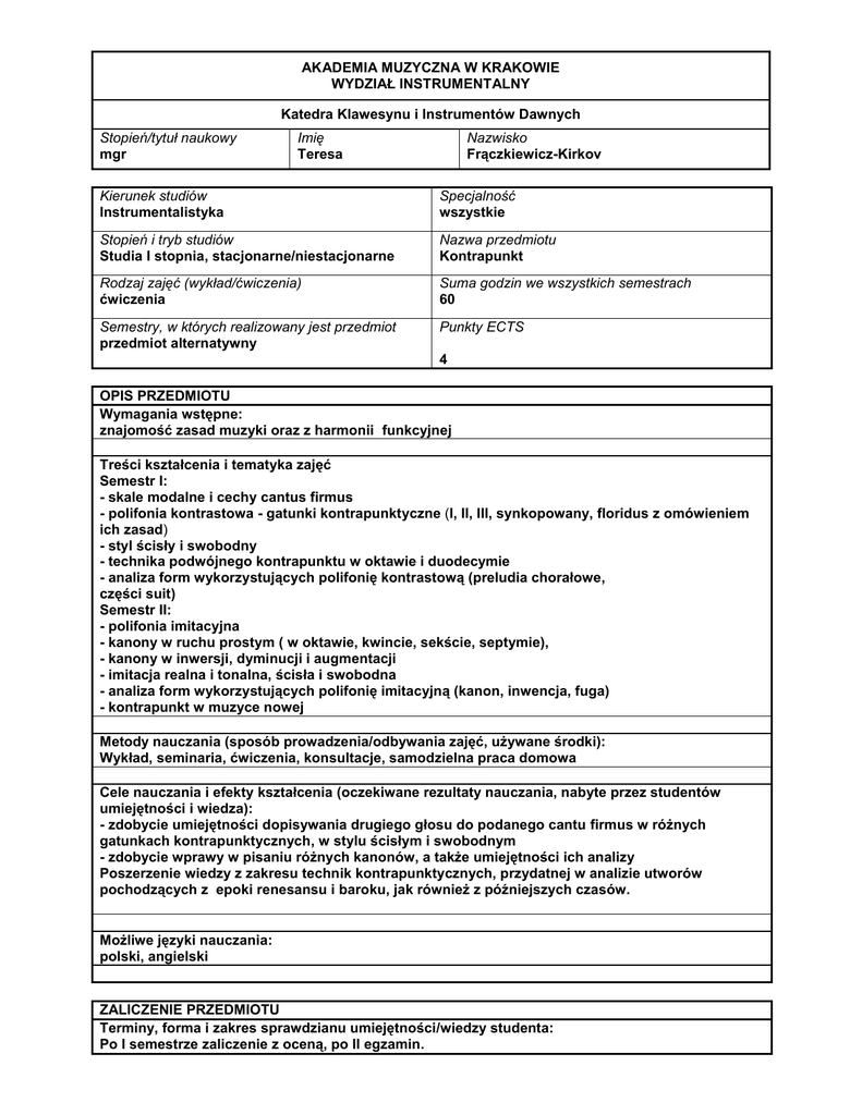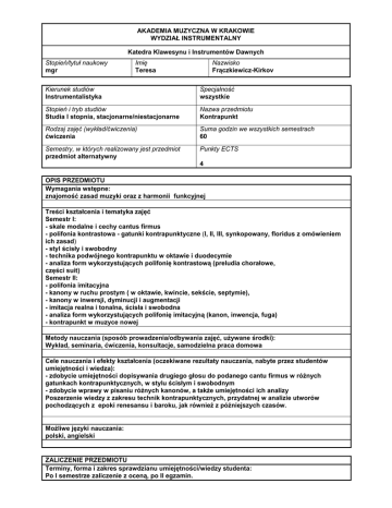 AKADEMIA MUZYCZNA W KRAKOWIE WYDZIAŁ INSTRUMENTALNY Katedra Klawesynu i Instrumentów Dawnych Stopień/tytuł naukowy mgr Imię Teresa Nazwisko Frączkiewicz-Kirkov Kierunek studiów Instrumentalistyka Specjalność wszystkie Stopień i tryb studiów Studia I stopnia, stacjonarne/niestacjonarne Nazwa przedmiotu Kontrapunkt Rodzaj zajęć (wykład/ćwiczenia) ćwiczenia Suma godzin we wszystkich semestrach 60 Semestry, w których realizowany jest przedmiot przedmiot alternatywny Punkty ECTS 4 OPIS PRZEDMIOTU Wymagania wstępne: znajomość zasad muzyki oraz z harmonii funkcyjnej Treści kształcenia i tematyka zajęć Semestr I: - skale modalne i cechy cantus firmus - polifonia kontrastowa - gatunki kontrapunktyczne (I, II, III, synkopowany, floridus z omówieniem ich zasad) - styl ścisły i swobodny - technika podwójnego kontrapunktu w oktawie i duodecymie - analiza form wykorzystujących polifonię kontrastową (preludia chorałowe, części suit) Semestr II: - polifonia imitacyjna - kanony w ruchu prostym ( w oktawie, kwincie, sekście, septymie), - kanony w inwersji, dyminucji i augmentacji - imitacja realna i tonalna, ścisła i swobodna - analiza form wykorzystujących polifonię imitacyjną (kanon, inwencja, fuga) - kontrapunkt w muzyce nowej Metody nauczania (sposób prowadzenia/odbywania zajęć, używane środki): Wykład, seminaria, ćwiczenia, konsultacje, samodzielna praca domowa Cele nauczania i efekty kształcenia (oczekiwane rezultaty nauczania, nabyte przez studentów umiejętności i wiedza): - zdobycie umiejętności dopisywania drugiego głosu do podanego cantu firmus w różnych gatunkach kontrapunktycznych, w stylu ścisłym i swobodnym - zdobycie wprawy w pisaniu różnych kanonów, a także umiejętności ich analizy Poszerzenie wiedzy z zakresu technik kontrapunktycznych, przydatnej w analizie utworów pochodzących z epoki renesansu i baroku, jak również z późniejszych czasów. Możliwe języki nauczania: polski, angielski ZALICZENIE PRZEDMIOTU Terminy, forma i zakres sprawdzianu umiejętności/wiedzy studenta: Po I semestrze zaliczenie z oceną, po II egzamin. Udział procentowy w ocenie końcowej Sposoby oceny pracy studenta: ocena ciągła (bieżące przygotowanie do zajęć i aktywność) śródsemestralne kolokwia pisemne/ustne po I semestrze 45 % Analiza pisemna wybranego utworu 50% końcowe zaliczenie pisemne/ustne/praktyczne egzamin pisemny egzamin ustny po II semestrze: prezentacja floridusu, kanonu w kwincie i inwencji 2-gł, a także oraz odpowiedź egzamin praktyczny: kontrola obecności 95% w obu semestrach 5% praca końcowa semestralna/roczna inne (wymienić) Ogółem Literatura obowiązkowa: H. Feicht Polifonia renesansu, PWM Kraków 1976 J. Gawlas Kontrapunkt, podstawowe zasady K. Sikorski Kontrapunkt cz. I i II, PWM Kraków 1953 Materiały własne Literatura uzupełniająca: J. S. Bach Inwencje 2-gł i 3-gł. J. S. Bach Kunst der Fuge J. S. Bach Preludia chorałowe J. S. Bach Suity francuskie i Suity angielskie J. S. Bach DWK t I i II 100 % 1979