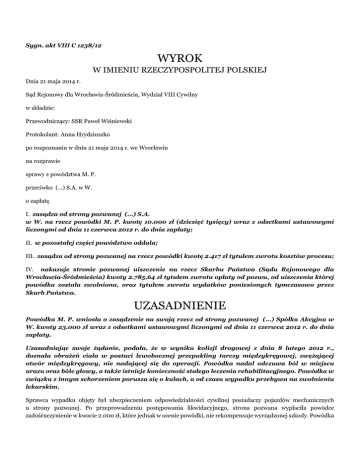 Sygn. akt VIII C 1238/12 WYROK W IMIENIU RZECZYPOSPOLITEJ POLSKIEJ Dnia 21 maja 2014 r. Sąd Rejonowy dla Wrocławia-Śródmieścia, Wydział VIII Cywilny w składzie: Przewodniczący: SSR Paweł Wiśniewski Protokolant: Anna Hrydziuszko po rozpoznaniu w dniu 21 maja 2014 r. we Wrocławiu na rozprawie sprawy z powództwa M. P. przeciwko (...) S.A. w W. o zapłatę I. zasądza od strony pozwanej (...) S.A. w W. na rzecz powódki M. P. kwotę 10.000 zł (dziesięć tysięcy) wraz z odsetkami ustawowymi liczonymi od dnia 11 czerwca 2012 r. do dnia zapłaty; II. w pozostałej części powództwo oddala; III. zasądza od strony pozwanej na rzecz powódki kwotę 2.417 zł tytułem zwrotu kosztów procesu; IV. nakazuje stronie pozwanej uiszczenie na rzecz Skarbu Państwa (Sądu Rejonowego dla Wrocławia-Śródmieścia) kwoty 2.785,64 zł tytułem zwrotu opłaty od pozwu, od uiszczenia której powódka została zwolniona, oraz tytułem zwrotu wydatków poniesionych tymczasowo przez Skarb Państwa. UZASADNIENIE Powódka M. P. wniosła o zasądzenie na swoją rzecz od strony pozwanej (...) Spółka Akcyjna w W. kwoty 23.000 zł wraz z odsetkami ustawowymi liczonymi od dnia 11 czerwca 2012 r. do dnia zapłaty. Uzasadniając swoje żądanie, podała, że w wyniku kolizji drogowej z dnia 8 lutego 2012 r., doznała obrażeń ciała w postaci lewobocznej przepukliny tarczy międzykręgowej, zwężającej otwór międzykręgowy, nie nadającej się do operacji. Powódka nadal odczuwa ból w miejscu urazu oraz bóle głowy, a także istnieje konieczność stałego leczenia rehabilitacyjnego. Powódka w związku z innym schorzeniem porusza się o kulach, a od czasu wypadku przebywa na zwolnieniu lekarskim. Sprawca wypadku objęty był ubezpieczeniem odpowiedzialności cywilnej posiadaczy pojazdów mechanicznych u strony pozwanej. Po przeprowadzeniu postępowania likwidacyjnego, strona pozwana wypłaciła powódce zadośćuczynienie w kwocie 2.000 zł, które jednak w ocenie powódki, nie rekompensuje wyrządzonej szkody. Powódka pismem z dnia 23 maja 2012 r. wezwała stronę pozwaną do zapłaty uzupełniającego zadośćuczynienia w wysokości 23.000 zł. Strona pozwana odmówiła, dlatego też, powódka zażądał zasądzenia na jej rzecz powyższej sumy tytułem dalszego zadośćuczynienia. W odpowiedzi na pozew strona pozwana wniosła o oddalenie powództwa. Nie kwestionując swej odpowiedzialności za skutki wypadku powódka co do zasady, podniosła, że wypłacona powódce kwota 2.000 zł tytułem zadośćuczynienia jest odpowiednia w stosunku do doznanych przez nią obrażeń, w szczególności do ustalonego trwałego uszczerbku na zdrowiu w wysokości 1%, a także stopnia i czasu trwania cierpienia fizycznego i psychicznego. Między stronami procesu bezsporne było, że: - w dniu 8 lutego 2012 r. we W. powódka, kierując samochodem, uczestniczyła w kolizji drogowej, której sprawcą był kierowca innego samochodu, - sprawca zdarzenia był objęty ubezpieczeniem odpowiedzialności cywilnej posiadaczy pojazdów mechanicznych u strony pozwanej. Sąd ustalił ponadto następujący stan faktyczny: W dniu zdarzenia powódka zgłosiła się do Szpitalnego Oddziału Ratunkowego w Wojewódzkim Szpitalu (...) we W. gdzie stwierdzono u niej spłycenie fizjologicznej lordozy szyjnej i zalecono jej noszenie kołnierza ortopedycznego przez okres 4 tygodni, stosowanie leku przeciwbólowego K. oraz skierowano ją na dalsze badania specjalistyczne. W dniu 23 marca 2012 r. powódka poddała się badaniu MR kręgosłupa szyjnego, w wyniku którego wykryto u niej lewoboczną przepuklinę tarczy międzykręgowej C4/5 uciskającą worek oponowy od strony lewej i nieznacznie zwężającą lewy otwór międzykręgowy. Powódka po wypadku przebywała na zwolnieniu lekarskim. Dwukrotnie odbyła leczenie rehabilitacyjne oraz przebywała w sanatorium. Dowód : - karta informacyjna ze Szpitalnego oddziału ratunkowego, k. 13, - skierowanie na zabiegi fizjoterapeutyczne z 8 marca 2012 r., k. 14, - wyniki badania MR kręgosłupa z 28 marca 2012 r., k.15, - skierowanie na zabiegi fizjoterapeutyczne z 19 czerwca 2012 r., k. 18, - zeznania świadka I. P. z 8 maja 2013 r., k. 115-116, - zeznania świadka Z. J. z 8 maja 2013 r., k. 116- 117, - przesłuchanie powódki z 8 maja 2013 r., k. 117-118, - opinia pisemna biegłych sądowych z zakresu neurochirurgii H. A. oraz z zakresu chirurgii i ortopedii M. J., k. 119-121. Wypadek do chwili obecnej skutkuje u powódki bólami i zawrotami głowy oraz dolegliwościami bólowymi kręgosłupa szyjnego z ograniczeniem ruchomości biernej i czynnej, parastezjami kończyny górnej lewej, szczególnie w zakresie unerwienia przez nerw łokciowy (palców IV-V) ze znacznym ograniczeniem ruchomości biernej i czynnej w stawie ramiennym. Dolegliwości nasilają się przy jeździe samochodem, zmianach pogodowych oraz dłuższym siedzeniu w jednej pozycji. W przyszłości w wskazane będzie leczenie usprawniające, a w razie nasilenia dolegliwości bólowych przyjmowanie leków przeciwbólowych oraz (...). Łączny uszczerbek na zdrowiu powódki wywołany zdarzeniem z dnia 8 lutego 2012 r. wynosi 5%, obejmując długotrwały uszczerbek związany z zespołem nerwicy pourazowej z bólami i zwrotami głowy (1 %) oraz zespołem bólowym szyjnym pourazowym, z zaznaczonym ograniczeniem ruchomości odcinka kręgosłupa i rwą barkoworamienną lewostronną (4 %). Dowód: - opinia pisemna biegłych sądowych z zakresu neurochirurgii H. A. oraz z zakresu chirurgii i ortopedii M. J., k. 119-121, W związku z wypadkiem powódka nie doznała natomiast uszczerbku na zdrowiu psychicznym. Dowód: - opinia pisemna biegłego sądowego z zakresu psychiatry T. G., k. 149-152. W okresie 4 tygodni po wypadku powódka nosiła kołnierz ortopedyczny, a do tej pory ma trudności z poruszaniem szyją, odczuwa ból i drętwienie palców ręki lewej. Powódka cierpiała również na chroniczny ból głowy bezpośrednio po wypa