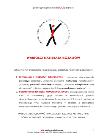 praktyczne szkolenia dla ludzi biznesu WARTOŚCI NABIERAJĄ KSZTAŁTÓW Szkolenie VIA przechodzą / przebiegają / przelatują na dwóch poziomach: 1. PRZEKONAŃ I WARTOŚCI BIZNESOWYCH ( „chcemy zdecydowanie zwiększyć sprzedaż”, „chcemy zwiększyć motywację handlowców”, „chcemy poprawić atmosferę w dziale”, „chcemy zainspirować ludzi do rozwoju”, „chcemy wyposażyć ich w narzędzia przywódcze”… ) 2. KONKRETNYCH NARZĘDZI KOMUNIKACYJNYCH ( posługiwanie się Ramą Celu w komunikacji, język faktów w komunikacji, pytania skoncentrowane na rozwiązaniach, podawanie informacji zwrotnej w metodologii NVC, wyraźne mówienie = dbałość o samogłoski, utrzymywanie kontaktu wzrokowego, pytania osadzające w intencji… ) WARTO UMIEĆ BUDOWAĆ TRWAŁE MOSTY ŁĄCZĄCE ABSTRAKCYJNE, GÓRNOLOTNE IDEE Z REALNYMI, NAMACALNYMI DZIAŁANIAMI. VIA szkolenia dla biznesu Tomasz Szokal-Egierd 661 333 380 [email protected] 1 praktyczne szkolenia dla ludzi biznesu PRAKTYCZNE SZKOLENIA HANDLOWE Aktywna sprzedaż w warunkach stresu i silnej konkurencji. Telemarketing inny niż irytująca większość. Sztuka pracy z oporem, obiekcją, sprzeciwem. Nieszablonowa prezentacja handlowa przed grupą. Skuteczna sprzedaż na wysokiej motywacji wewnętrznej. Negocjacje handlowe. Sztuka przekonywania ludzi do wspólnych racji. PRAKTYCZNE SZKOLENIA MENEDŻERSKIE Zaawansowane techniki przywódcze. Angażowanie i motywowanie ludzi do działania. Skuteczne zarządzanie zespołem handlowym. Trudne rozmowy i zapobieganie konfliktom. Komunikacja zorientowana na rozwiązania. Energia i motywacja menedżera. Techniki pracy z oporem, obiekcją, sprzeciwem. Coaching jako doskonała metoda prowadzenia ludzi w rozwoju. PRAKTYCZNE SZKOLENIA DLA WSZYSTKICH Energia i motywacja do działania. Asertywność jako konieczność w biznesie. Świadome zarządzanie sobą w czasie. Komunikacja i działanie zorientowane na cel. Techniki pracy ze stresem, zmęczeniem, emocjami. Radzenie sobie z syndromem wypalenia zawodowego. Sztuka prezentacji przed większą grupą. Higiena pracy głosem i emisja głosu. VIA szkolenia dla biznesu Tomasz Szokal-Egierd 661 333 380 [email protected] 2 praktyczne szkolenia dla ludzi biznesu ZACZYNAM OD KOŃCA – Z WIZJĄ MIERZALNEGO EFEKTU Można to ująć innymi słowami – umiem zamieniać kompetencje miękkie ( abstrakt ) w kompetencje twarde, widoczne, namacalne, realne ( konkretne narzędzia ). Zwroty po szkoleniu: „Było na pełnym zaangażowaniu, inspirująco i z poczuciem humoru” dopełniam żelaznymi konkretami: „Czego się konkretnie dowiedziałeś / nauczyłeś?” „Jak, kiedy, z kim będziesz konkretne narzędzie rozwijał?” „Po co warto to narzędzie stosować?” UPARCIE DOSTARCZAM REALNE WYNIKI Takie zwroty po szkoleniach uważam za najbardziej wartościowe: Potrafię prowadzić rozmowy bardziej otwarcie, udaje mi się uzyskać więcej informacji o potrzebach klienta. Kilka dni po szkoleniu podpisałem duży kontrakt. Zadawanie pytań przyniosło efekty, szczególnie w przypadku, gdy osoby, które ze mną rozmawiają, mają jakieś obiekcje, Pytania delikatne po co zamiast dlaczego wprowadzały rozmowę na bardzo dobre tory. Mam Twoje materiały cały czas I muszę Ci napisać, że zdanie „w czym Twój komentarz ma mi pomóc?” załatwiło osobę, która mnie wkurzała od dłuższego czasu. Podpisałam umowę z Panem „punkt honoru". Dziękuję za wskazówki. Przypomniałam sobie, co zaniedbałam w kole wartości, co stale spychałam na „ potem”. A to „potem” może nigdy nie nadejść, więc po prostu zaczynam działać w tym obszarze. Jestem pod dużym wrażenie Twojej łatwości wydobywania ze słów dużej motywacji. Zrobiłam eksperyment w życiu prywatnym, zadając pytanie „ Co Twoje słowa mają mi dać?” Po drugiej stronie było duże zaskoczenie, zanim uzyskałam odpowiedź I potwierdziłam, jak trudno w codzienności umieć obserwować, a nie oceniać…. VIA szkolenia dla biznesu Tomasz Szokal-Egierd 661 333 380 [email protected] 3 praktyczne szkolenia dla ludzi biznesu TRENERSKIE BIO Jestem praktykiem biznesu i praktykiem trenerem, absolwentem Centrum Szkoleń i Psychoedukacji Instytutu Psychologii Zdrowia PTP, Trenerem Biznesu z licznymi certyfikatami (m.in. Trenera NLP). Od 19 lat w aktywnej i praktycznej sprzedaży (w segmencie B2C, jak i B2B), a od 11 lat w szkoleniach doświadczam, jak ekscytujący i zmienny jest obszar komunikacji między ludźmi, jak coś, co było aktualne wczoraj, dzisiaj poszukuje nowej rację bytu. Zdecydowane stawiam na praktyczną użyteczność życiową ćwiczonych na szkoleniach narzędzi, mechanizmów… Wielokrotnie bywałem na warsztatach znaczących postaci świata szkoleń: Christiny Hall, Roberta Diltsa, Stephena Gilligana, Hermanna Mullera-Walbrodta, Franka Farelly’ego. Tłumaczyłem zapisy pracy Miltona Ericksona i Richarda Bandlera. Przetłumaczyłem książkę „Terapia prowokatywna” Franka Farelly’ego. W wolnych i szybkich chwilach bawię się językiem – najczęściej własnym, czyli polskim. Choć przyjmuję również bliskie obce. KLIENCI Ringier Axel Springer Polska Sp. z o.o., Fresenius Kabi Polska Sp. z o.o., NCAB Group Polska Sp. z o.o., BILETOMAT.PL, Cargill Polska Sp. z o.o., Narodowy Bank Polski, Dossche Sp. z o. o., Tyco Electronics Polska Sp. z o.o., Besam Polska Sp. z o.o., Sopro Polska Sp. z o.o., ING Bank Śląski S.A., ING Usługi Finansowe S.A, PZU Życie S.A., Bank Przemysłowo-Handlowy S.A., Bank Pekao S.A., Unilever Polska Sp. z o.o., Nutricia Polska Sp. z o.o., SCA Hygiene Products Sp. z o.o., Allianz Polska Services Sp. z o.o., Osram Polska Sp. z o.o., Securitas Polska Sp. z o.o., Budimex Nieruchomości Sp. z o.o., Gladstone Polska Sp. z o.o., Tchibo Coffee Service Polska Sp. z o.o., Agencja Open, Carlson Wagonlit Polska Sp. z o.o., e-Center CWT Polska Sp. z o.o., Brand Support Sp. z o.o., Wydawnictwo Bauer Sp. kom., E.P. Creatives, The ClearingHouse