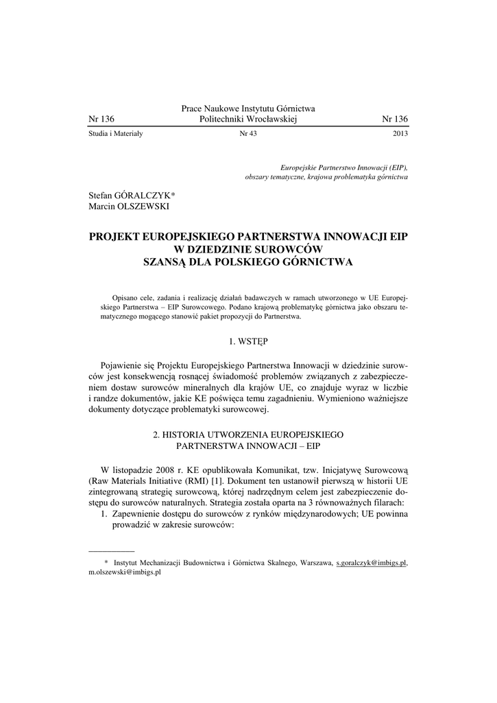 Prace Naukowe Instytutu Górnictwa Politechniki Wrocławskiej Nr 136 Nr 43 Studia i Materiały Nr 136 2013 Europejskie Partnerstwo Innowacji (EIP), obszary tematyczne, krajowa problematyka górnictwa Stefan GÓRALCZYK* Marcin OLSZEWSKI PROJEKT EUROPEJSKIEGO PARTNERSTWA INNOWACJI EIP W DZIEDZINIE SUROWCÓW SZANSĄ DLA POLSKIEGO GÓRNICTWA Opisano cele, zadania i realizację działań badawczych w ramach utworzonego w UE Europejskiego Partnerstwa – EIP Surowcowego. Podano krajową problematykę górnictwa jako obszaru tematycznego mogącego stanowić pakiet propozycji do Partnerstwa. 1. WSTĘP Pojawienie się Projektu Europejskiego Partnerstwa Innowacji w dziedzinie surowców jest konsekwencją rosnącej świadomość problemów związanych z zabezpieczeniem dostaw surowców mineralnych dla krajów UE, co znajduje wyraz w liczbie i randze dokumentów, jakie KE poświęca temu zagadnieniu. Wymieniono ważniejsze dokumenty dotyczące problematyki surowcowej. 2. HISTORIA UTWORZENIA EUROPEJSKIEGO PARTNERSTWA INNOWACJI – EIP W listopadzie 2008 r. KE opublikowała Komunikat, tzw. Inicjatywę Surowcową (Raw Materials Initiative (RMI) [1]. Dokument ten ustanowił pierwszą w historii UE zintegrowaną strategię surowcową, której nadrzędnym celem jest zabezpieczenie dostępu do surowców naturalnych. Strategia została oparta na 3 równoważnych filarach: 1. Zapewnienie dostępu do surowców z rynków międzynarodowych; UE powinna prowadzić w zakresie surowców: __________ * Instytut Mechanizacji Budownictwa i Górnictwa Skalnego, Warszawa, [email protected], [email protected] 62 – aktywną politykę w celu zabezpieczenia dostępu do surowców obejmująca skuteczniejszą koordynację i spójność pomiędzy różnymi dziedzinami polityki zewnętrznej (stosunki zagraniczne, handel i rozwój), – politykę handlową i regulacyjną w celu zwiększenia dostępu do pierwotnych i wtórnych surowców na rynkach światowych. 2. Określenie właściwych warunków ramowych w obrębie UE w celu promowania zrównoważonego zaopatrzenia ze źródeł europejskich; aby zapewnić stabilne dostawy surowców ze złóż europejskich, ważne jest: – utworzenie właściwych warunków ramowych dla przemysłu wydobywczego głównym wymogiem jest dostęp do gruntów, – ulepszenie bazy wiedzy na temat złóż mineralnych na terytorium UE, – współpraca w ramach krajowych badań geologicznych, – wdrożenie prawodawstwa dotyczącego programu Natura 2000, – opracowanie projektów badawczych, które koncentrują się na wydobyciu i przetwarzaniu surowców i mogą być finansowane w ramach 7 i 8 Programu Ramowego, – kreowanie polityki zatrudnienia wykwalifikowanych kadr dla górnictwa i świadomości społecznej o znaczeniu krajowych surowców dla gospodarki europejskiej. 3. Zwiększenie ogólnej wydajności zasobów recyklingu, oraz promowanie recyklingu w celu zmniejszenia zużycia podstawowych surowców na terenie UE. Dla realizacji powyższych zamierzeń konieczne jest: – efektywne wykorzystywania zasobów i innowacyjnych pod względem ekologii procesów produkcyjnych, w celu zmniejszenia zależności od surowców, oraz zachęcenie do optymalnego wykorzystania ich zasobów i recyklingu; – zwiększenie wykorzystania surowców wtórnych przyczynia się ono do bezpieczeństwa w zakresie zaopatrzenia i efektywności energetycznej. Obecnie wiele produktów wycofanych z eksploatacji nie zostaje wprowadzonych do właściwych kanałów recyklingu, co powoduje nieodwracalną stratę wartościowych surowców wtórnych; – ułatwienie recyklingu surowców wtórnych przez pełne wdrożenie i egzekwowanie przepisów prawnych związanych z recyklingiem, jak również przez włączenie do dyrektywy ramowej w sprawie odpadów nowych przepisów dotyczących tego, kiedy odpady przestają być odpadami. Zgodnie z tą dyrektywą państwa członkowskie będą zobowiązane do osiągnięcia określonych poziomów ponownego wykorzystania i recyklingu metali, papieru, szkła oraz bezpiecznych odpadów pochodzących z budowy i rozbiórki. Kolejnym istotnym dokumentem był opublikowany w lipcu 2010 roku Raport Komisji Europejskiej dotyczący „Kluczowych surowców dla UE” [2]. Raport został napisany przez grupę roboczą powołaną ad hoc, pod przewodnictwem Komisji Euro- 63 pejskiej, składającej się z ekspertów wywodzących się z ministerstw narodowych, instytucji geologicznych i przemysłu. Raport został uznany za ważny krok w kierunku osiągnięcia celu, jakim jest określenie kluczowych surowców, jak to był wskazane w Inicjatywie Surowcowej. Zespół ekspertów, po przeanalizowaniu 41 minerałów i metali przygotował listę 14 surowców, uznanych za istotne dla UE. Są to: antymon, beryl, kobalt, fluoryt, gal, german, grafit, ind, magnez, niob, metale grupy platyny, pierwiastki ziem rzadkich, tantal i wolfram. Prognozy wskazują, że popyt na niektóre z nich mogłyby wzrosnąć wielokrotnie do 2030 roku, w porównaniu do poziomu 2006 roku. W styczniu 2011 r. KE opublikowała Komunikat zatytułowany „Stawianie czoła wyzwaniom związanym z rynkami towarowymi i surowcami” [3]. Komunikat zawiera kwestie wyznaczenia strategicznego celu UE, jakim jest zapewnienie dostępu do surowców mineralnych poprzez cały proces, omówienie scenariuszy rozwojowych dla rynków surowcowych w najbliższej przyszłości oraz określenie wyzwań stojących przed UE. W odróżnieniu od handlu energią elektryczną, obrót surowcami ma zasięg globalny. Jeśli chodzi o ceny i rynki, dzieli się je na takie, których obrót odbywa się na giełdach i takie, które podlegają obrotowi pozagiełdowemu. Wiele kluczowych dla UE surowców, do których należą kobalt, gal, ind i pierwiastki ziem rzadkich, nie jest przedmiotem obrotu giełdy. Rynek tych materiałów jest mniej przejrzysty, a wielkość obrotów jest znacznie niższa w porównaniu z innymi materiałami. Najnowsze trendy wskazują, że popyt na surowce będzie jes