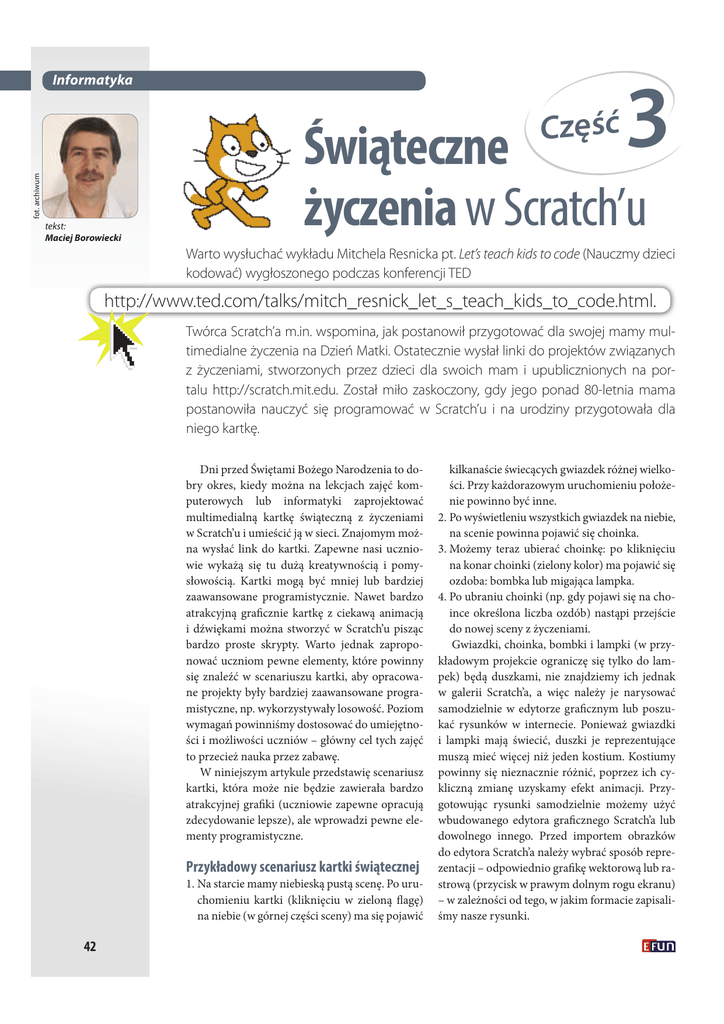 Informatyka 3 Świąteczne życzenia w Scratch’u fot. archiwum Część tekst: Maciej Borowiecki Warto wysłuchać wykładu Mitchela Resnicka pt. Let’s teach kids to code (Nauczmy dzieci kodować) wygłoszonego podczas konferencji TED http://www.ted.com/talks/mitch_resnick_let_s_teach_kids_to_code.html. Twórca Scratch’a m.in. wspomina, jak postanowił przygotować dla swojej mamy multimedialne życzenia na Dzień Matki. Ostatecznie wysłał linki do projektów związanych z życzeniami, stworzonych przez dzieci dla swoich mam i upublicznionych na portalu http://scratch.mit.edu. Został miło zaskoczony, gdy jego ponad 80-letnia mama postanowiła nauczyć się programować w Scratch’u i na urodziny przygotowała dla niego kartkę. Dni przed Świętami Bożego Narodzenia to dobry okres, kiedy można na lekcjach zajęć komputerowych lub informatyki zaprojektować multimedialną kartkę świąteczną z życzeniami w Scratch’u i umieścić ją w sieci. Znajomym można wysłać link do kartki. Zapewne nasi uczniowie wykażą się tu dużą kreatywnością i pomysłowością. Kartki mogą być mniej lub bardziej zaawansowane programistycznie. Nawet bardzo atrakcyjną graficznie kartkę z ciekawą animacją i dźwiękami można stworzyć w Scratch’u pisząc bardzo proste skrypty. Warto jednak zaproponować uczniom pewne elementy, które powinny się znaleźć w scenariuszu kartki, aby opracowane projekty były bardziej zaawansowane programistyczne, np. wykorzystywały losowość. Poziom wymagań powinniśmy dostosować do umiejętności i możliwości uczniów – główny cel tych zajęć to przecież nauka przez zabawę. W niniejszym artykule przedstawię scenariusz kartki, która może nie będzie zawierała bardzo atrakcyjnej grafiki (uczniowie zapewne opracują zdecydowanie lepsze), ale wprowadzi pewne elementy programistyczne. Przykładowy scenariusz kartki świątecznej 1. Na starcie mamy niebieską pustą scenę. Po uruchomieniu kartki (kliknięciu w zieloną flagę) na niebie (w górnej części sceny) ma się pojawić 42 kilkanaście świecących gwiazdek różnej wielkości. Przy każdorazowym uruchomieniu położenie powinno być inne. 2. Po wyświetleniu wszystkich gwiazdek na niebie, na scenie powinna pojawić się choinka. 3. Możemy teraz ubierać choinkę: po kliknięciu na konar choinki (zielony kolor) ma pojawić się ozdoba: bombka lub migająca lampka. 4. Po ubraniu choinki (np. gdy pojawi się na choince określona liczba ozdób) nastąpi przejście do nowej sceny z życzeniami. Gwiazdki, choinka, bombki i lampki (w przykładowym projekcie ograniczę się tylko do lampek) będą duszkami, nie znajdziemy ich jednak w galerii Scratch’a, a więc należy je narysować samodzielnie w edytorze graficznym lub poszukać rysunków w internecie. Ponieważ gwiazdki i lampki mają świecić, duszki je reprezentujące muszą mieć więcej niż jeden kostium. Kostiumy powinny się nieznacznie różnić, poprzez ich cykliczną zmianę uzyskamy efekt animacji. Przygotowując rysunki samodzielnie możemy użyć wbudowanego edytora graficznego Scratch’a lub dowolnego innego. Przed importem obrazków do edytora Scratch’a należy wybrać sposób reprezentacji – odpowiednio grafikę wektorową lub rastrową (przycisk w prawym dolnym rogu ekranu) – w zależności od tego, w jakim formacie zapisaliśmy nasze rysunki. Wyświetlamy choinkę Tworzymy gwiazdki na niebie W poprzednim numerze EFUN został omówiony mechanizm klonowania duszków wprowadzony w wersji 2.0. Wykorzystamy go teraz do utworzenia gwiazdek na niebie. Gwiazda-wzorzec niech będzie niewidocznym duszkiem. Analogicznie, pozostałe dwa duszki, choinka i lampka też niech będą ukryte. Po kliknięciu w zieloną flagę sklonujemy 20 razy gwiazdkę. Każdy klon po utworzeniu powinien się pokazać, wylosować swoje miejsce na scenie (także swoją wielkość) oraz rozpocząć animację (czyli zmianę kostiumu w pętli). Przejdziemy teraz do napisania prostego skryptu dla choinki. Na początku, po utworzeniu duszka choinki (jeszcze przed jej ukryciem), powinniśmy ją ustawić na scenie tak, aby dotykała pniem środka dolnej krawędzi sceny. Choinka ma się pokazać na scenie dopiero wtedy, kiedy gwizdki znajdą się na niebie. Musi o tym wiedzieć, a więc otrzymać stosowny komunikat. Należy w związku z tym nieznacznie zmodyfikować skrypt klonujący gwiazdki oraz zdefiniować dla choinki skrypt odbierający komunikat. Powinna się ona pokazać na ekranie z pewnym opóźnieniem (gwiazdki lecą na swoje pozycje przez sekundę). Ponieważ potem będziemy klikać na choince wieszając lampki, wygodnie będzie przystemplować obrazek choinki na scenie i ponownie ją ukryć. Zapobiegnie to nieplanowanemu przesuwaniu duszka-choinki na scenie. Oznacza to także, że wieszanie lampek na choince będzie realizował skrypt dla sceny, a nie dla duszka-choinki. Zmodyfikowany skrypt gwiazdki: Skrypt choinki: listopad/grudzień 2013 43 Informatyka Ubieramy choinkę Po kliknięciu na scenie sklonujemy duszka-lampkę. W tym skrypcie nie jesteśmy jednak w stanie sprawdzić, na jakim kolorze sceny kliknęliśmy (możemy rozpoznać tylko miejsce po współrzędnych kursora myszy, ale konar choinki ma kształt nieregularny). W związku z tym dalsze czynności wykonamy w skrypcie lampki na zdarzenie kiedy zaczynam jako klon. Wyślemy utworzoną lampkę do pozycji myszy, pokażemy ją i zbadamy, czy wybrany kolor lampki (w przykładzie czerwony) dotyka koloru konaru choinki (koloru zielonego). Jeśli tak, to lampka powinna zacząć migać (wykonujemy pętlę zmieniającą kostium). Jeśli nie, to usuwamy tego duszka-klona. Dzieje się to na tyle szybko, że nie zauważymy, iż powstała lampka poza choinką i została usunięta. Skrypt sceny: nych lampek. Wymaga to modyfikacji już napisanych skryptów. Na początku powinniśmy wyzerować licznik, a po sprawdzeniu, że lampka została powieszona na choince, powiększyć licznik