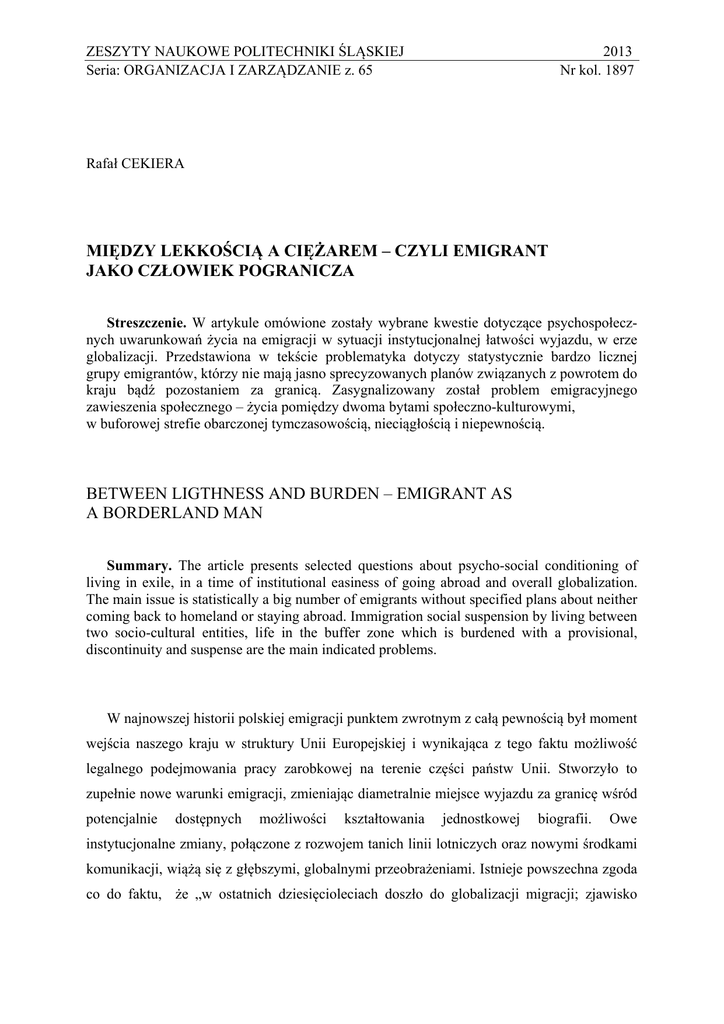 ZESZYTY NAUKOWE POLITECHNIKI ŚLĄSKIEJ Seria: ORGANIZACJA I ZARZĄDZANIE z. 65 2013 Nr kol. 1897 Rafał CEKIERA MIĘDZY LEKKOŚCIĄ A CIĘŻAREM – CZYLI EMIGRANT JAKO CZŁOWIEK POGRANICZA Streszczenie. W artykule omówione zostały wybrane kwestie dotyczące psychospołecznych uwarunkowań życia na emigracji w sytuacji instytucjonalnej łatwości wyjazdu, w erze globalizacji. Przedstawiona w tekście problematyka dotyczy statystycznie bardzo licznej grupy emigrantów, którzy nie mają jasno sprecyzowanych planów związanych z powrotem do kraju bądź pozostaniem za granicą. Zasygnalizowany został problem emigracyjnego zawieszenia społecznego – życia pomiędzy dwoma bytami społeczno-kulturowymi, w buforowej strefie obarczonej tymczasowością, nieciągłością i niepewnością. BETWEEN LIGTHNESS AND BURDEN – EMIGRANT AS A BORDERLAND MAN Summary. The article presents selected questions about psycho-social conditioning of living in exile, in a time of institutional easiness of going abroad and overall globalization. The main issue is statistically a big number of emigrants without specified plans about neither coming back to homeland or staying abroad. Immigration social suspension by living between two socio-cultural entities, life in the buffer zone which is burdened with a provisional, discontinuity and suspense are the main indicated problems. W najnowszej historii polskiej emigracji punktem zwrotnym z całą pewnością był moment wejścia naszego kraju w struktury Unii Europejskiej i wynikająca z tego faktu możliwość legalnego podejmowania pracy zarobkowej na terenie części państw Unii. Stworzyło to zupełnie nowe warunki emigracji, zmieniając diametralnie miejsce wyjazdu za granicę wśród potencjalnie dostępnych możliwości kształtowania jednostkowej biografii. Owe instytucjonalne zmiany, połączone z rozwojem tanich linii lotniczych oraz nowymi środkami komunikacji, wiążą się z głębszymi, globalnymi przeobrażeniami. Istnieje powszechna zgoda co do faktu, że „w ostatnich dziesięcioleciach doszło do globalizacji migracji; zjawisko 72 R. Cekiera emigracji i imigracji dotyczy obecnie takiej liczby krajów, jak nigdy przedtem, przemieszcza się większa ilość osób, i to zdecydowanie szybciej niż w przeszłości.”1 Czynnikiem specyficznie polskim w momencie wejścia naszego kraju w struktury unijne był wysoki poziom bezrobocia – szczególnie wśród osób młodych. Wszystko to razem stało się potężnym bodźcem emigracjogennym, który spowodował wielką falę wyjazdów za granicę po 2004 roku. Jakkolwiek liczba emigrantów z Polski sukcesywnie wzrasta od 1988 roku, to jednak emigracja postakcesyjna nie jest prostą kontynuacją tego trendu.2 Z niewielką tylko dozą przesady można stwierdzić, że dla osób kończących studia wyższe (szczególnie na kierunkach humanistycznych) w latach 2004 czy 2005 wyjazd z kraju był opcją uznawaną za najbardziej oczywistą, której wyboru nie trzeba było tłumaczyć. Odwrotnie, to chęć pozostania w kraju wymagała uzasadnienia i racjonalizacji. Co niezwykle ważne dla charakterystyki emigracji postakcesyjnej, z różnych badań wynika, że około 80% osób, które opuściły nasz kraj po 2004 roku, miało poniżej 35 lat.3 Różnie szacuje się liczbę osób, które wyjechały z Polski w tym okresie. Przytaczane w analizach dane często znacznie różnią się od siebie. Kłopot z dokładnym ustaleniem liczby polskich emigrantów ma swoje szersze uzasadnienie i nie jest jedynie wynikiem niedoskonałości narzędzi badawczych. Wynika on z radykalnej zmiany charakteru emigracji postakcesyjnej w stosunku do jej poprzednich fal. Spora część współczesnych polskich emigrantów to – by użyć określenia M. Okólskiego – ludzie na huśtawce, migranci wahadłowi, spędzający pewien czas za granicą, by później znów przez jakiś czas przebywać w kraju4. Przede wszystkim zaś na zmianę charakteru współczesnej emigracji wpłynął fakt, że decyzja o wyjeździe za granicę straciła sporo ze swojego ciężaru, o którym stanowiła nieodwołalność, odczucie nieodwracalności powziętej decyzji o wyjeździe czy konieczność poradzenia sobie z traumą emigracyjną. Emigracja stała się jedną z dostępnych możliwości obarczoną podobnym ryzykiem i wymagającą podobnego nakładu sił jak przeprowadzka w inny region Polski. Współczesna emigracja nie łączy się z długoterminowymi planami życiowymi, jest doraźnym rozwiązaniem, inwestycją o relatywnie niskich kosztach przy potencjalnie wysokiej stopie zwrotu. Słusznie zauważa A. Posern-Zieliński, że „takie pojęcie jak imigrant z Polski zacznie powoli tracić swój pierwotny sens, gdyż coraz częściej spotykać 1 S. Fenton: Etniczność. Sic, Warszawa 2007, s. 139. M. Ślusarczyk: Demograficzne i społeczne aspekty migracji Polaków na początku XXI wieku, [w:] H. Grzymała-Moszczyńska, A. Kwiatkowska, J. Roszak (red.): Drogi i rozdroża. Migracje Polaków w Unii Europejskiej po 1 maja 2004 roku. Nomos, Kraków 2010, s. 20. 3 Zob. np. artykuły zamieszczone w: H. Grzymała-Moszczyńska, A. Kwiatkowska, J. Roszak J. (red.): op. cit. 4 M. Okólski M.: Mobilność międzynarodowa ludności Polski w okresie transformacji: przegląd problematyki, [w:] E. Jaźwińska, M. Okólski (red.): Ludzie na huśtawce: migracje między peryferiami Polski i Zachodu. Scholar, Warszawa 2001, s. 9. 2 Między lekkością a ciężarem... 73 będziemy Polaków [...] wybierających sobie miejsce pracy i zamieszkiwania na innym, aniżeli rodzinne, terytorium wspólnej Unii Europejskiej, bez emigracyjnej traumy i poczucia nieodwołalności raz podjętych decyzji.”5 Ta zmiana uwidacznia się również w terminologii. Teraz się nie emigruje, teraz się po prostu wyjeżdża. Świadomość tej zmiany mają sami emigranci, bardzo niechętnie określający się za pomocą tego pojęcia. Jeżeli nawet używają wobec siebie określenia emigrant