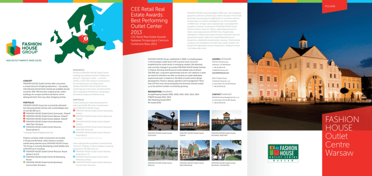 6 5 3 1 CEE Retail Real Estate Awards: Best Performing Outlet Center 2013 CEE Retail Real Estate Awards: Najlepiej Prosperujące Centrum Outletowe Roku 2013 2 4 7 CONCEPT FASHION HOUSE Outlet Centres offer consumers a unique discount shopping experience – top quality international and domestic brands are available all year round for 30%-70% less than original prices, within buildings of a unique architectural theme, which distinguish them from any other shopping centres. PORTFOLIO FASHION HOUSE Group has successfully delivered the following Outlet Centres with a total lettable area of over 86,400 sq m: 1 FASHION HOUSE Outlet Centre Sosnowiec, Poland* 2 FASHION HOUSE Outlet Centre Warsaw, Poland* 3 FASHION HOUSE Outlet Centre Gdańsk, Poland* 4 FASHION HOUSE Outlet Centre Bucharest, West Park, Romania 5 FASHION HOUSE Outlet Centre Moscow, Russia (phase 1) * owned by Polonia Property Fund II Ltd Projects currently under construction are located in Russia and Romania, while Ukraine is another market being opened up by FASHION HOUSE Group. The Group is currently developing a total lettable area of 84,400 sq m including: 5 FASHION HOUSE Outlet Centre Moscow, Russia (phase 2 and 3) 6 FASHION HOUSE Outlet Centre St Petersburg, Russia 7 FASHION HOUSE Outlet Centre Bucharest, Cernica Park, Romania KONCEPCJA W ofercie FASHION HOUSE Outlet Centre znajdują się produkty znanych międzynaro dowych i krajowych marek – w cenach średnio o 30%-70% niższych w porównaniu do standardowych cen sklepowych. Obiekty FASHION HOUSE Outlet Centre wyróżniają się na tle innych centrów handlo wych oryginalną architekturą, nawiązującą do lokalnej tradycji architektonicznej. PORTFOLIO Centra outletowe (o łącznej powierzchni najmu ponad 86 400 mkw.) zrealizowane przez FASHION HOUSE Group: 1 FASHION HOUSE Outlet Centre Sosnowiec, Polska* 2 FASHION HOUSE Outlet Centre Warszawa, Polska* 3 FASHION HOUSE Outlet Centre Gdańsk, Polska* 4 FASHION HOUSE Outlet Centre Bukareszt West Park, Rumunia 5 FASHION HOUSE Outlet Centre Moskwa, Rosja (faza 1) POLAND FASHION HOUSE Group powstała w 2000 roku. Jest wiodącym graczem w sektorze centrów typu outlet w Europie. Firma może pochwalić się znaczącymi osiągnięciami w tworzeniu sektora outletowego na rynkach rozwijających się. Firma powstała w 2000 roku i od tego czasu wybudowała i z powodzeniem zarządza 5 centrami outletowymi FASHION HOUSE Outlet Centre w Polsce, Rumunii i Rosji o całkowitej powierzchni najmu wynoszącej prawie 100 000 mkw. Długotrwałą współpracę i relacje przynoszące korzyści wszystkim stronom gwarantuje naszym najemcom zespół doświadczonych ekspertów w dziedzinie projektowania, budowy, finansowania, wynajmu oraz zarządzania centrami typu outlet. Zaufało nam ponad 270 najbardziej znanych światowych i lokalnych marek i ich liczba stale rośnie. FASHION HOUSE Group, established in 2000, is a leading player in the European outlet sector with a proven track record of establishing the outlet sector in emerging markets. We delivered and currently manage 5 successful FASHION HOUSE Outlet Centres in Poland, Romania and Russia of a total lettable area of almost 100,000 sqm. Long-term partnerships and win-win relations is what we stand for therefore we offer our tenants an outlet-dedicated, experienced team of experts in the fields of outlet centre design, development, finance, leasing, operation and management. More than 270 the most renowned global and domestic brands trusted us so far and the number is constantly growing. RECOGNITION / nagrody EuropaProperty Awards 2008, 2009, 2010, 2012, 2013, 2014 FM&PM Awards 2012, 2014 REX Marketing Award 2014 RLI Award 2014 LEASING / WYNAJEM FASHION HOUSE Group Puławska 2, 02-566 Warsaw T: +48 22 128 44 44 [email protected] www.fashionhouse.com BOIG The Blue Ocean Investment Group Sp. z o.o. al. Jana Pawła II 25, 00-854 Warsaw T: +48 22 653 46 20 Contact / КОNТАКT PEAKSIDE Polonia Management Sp. z o.o. al. Jana Pawła II 29, 00-867 Warsaw T: +48 22 653 69 00 FASHION HOUSE Outlet Centre Sosnowiec FASHION HOUSE Outlet Centre Gdańsk FASHION HOUSE Outlet Centre Bucharest, West Park FASHION HOUSE Outlet Centre Moscow FASHION HOUSE Outlet Centre Saint Petersburg FASHION HOUSE Outlet Centre Bucharest, Cernika Park FASHION HOUSE Outlet Centre Warsaw * własność Polonia Property Fund II Ltd Firma realizuje kilka projektów na terenie Rosji i Rumunii. Projekty w trakcie realizacji (o łącznej powierzchni 50 640 mkw.) to: 5 FASHION HOUSE Outlet Centre Moskwa, Rosja (faza 2 i 3) 6 FASHION HOUSE Outlet Centre Sankt Petersburg, Rosja 7 FASHION HOUSE Outlet Centre Bukareszt Cernica Park, Rumunia W A R S A W POLSKA FASHION HOUSE Outlet Centre warsaw FASHION HOUSE Outlet Centre Warsaw, the largest FASHION HOUSE Outlet Centre in Poland, is also one of the most successful ones, due to its prime location in the vicinity of the thriving Polish capital as well as a perfect mix of local and international high-street and luxury brands. FASHION HOUSE Outlet Centre Warszawa to nie tylko największe, lecz również jedno z najlepiej prosperujących centrów typu outlet wybudowanych przez FASHION HOUSE Group w Polsce. Sukces zawdzięcza przede wszystkim doskonałej lokalizacji na obrzeżach dynamicznie rozwijającej się stolicy oraz optymalnemu doborowi lokalnych i międzynarodowych, zarówno popularnych, jak i luksusowych marek. W A R S A W tów de o Ge CITY CENTRE CENTRUM zia Łabęd WARSAW Warszawa na ycz t e erg At the junction of Puławska and Energetyczna streets, less than a 30-minute drive to the Warsaw’s city centre Lokalizacja Piaseczno k. Warszawy Na skrzyżowaniu ulicy Puławskiej i Energetycznej Dojazd do centrum Warszawy w ciągu ok. 30 minut Total catchment area 3.8 million inhabitants within a 90-minute drive time Zasięg oddziaływania 3,8 miliona potencjalnych klientów (którym dojazd do centrum zajmuje nie więcej niż 90 minut) Space GLA: 17,300 sq m, the largest FASHION HOUSE Out