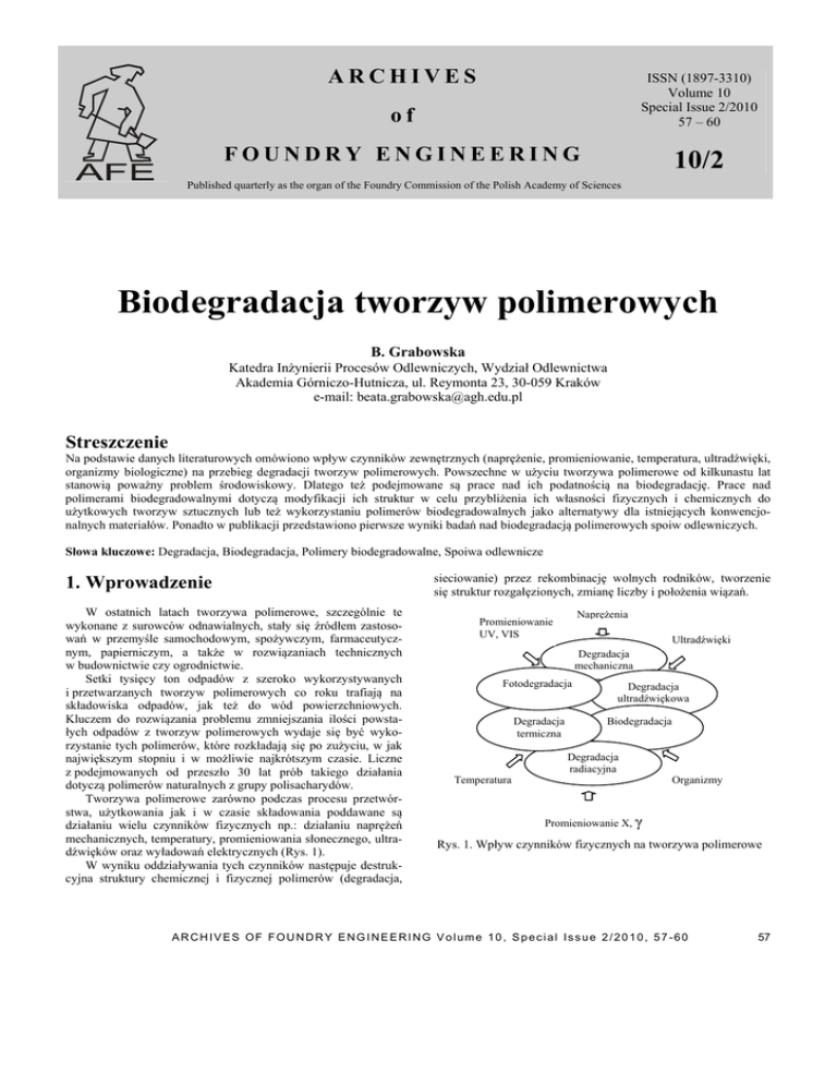 ARCHIVES ISSN (1897-3310) Volume 10 Special Issue 2/2010 57 – 60 of FOUNDRY ENGINEERING 10/2 Published quarterly as the organ of the Foundry Commission of the Polish Academy of Sciences Biodegradacja tworzyw polimerowych B. Grabowska Katedra Inżynierii Procesów Odlewniczych, Wydział Odlewnictwa Akademia Górniczo-Hutnicza, ul. Reymonta 23, 30-059 Kraków e-mail: [email protected] Streszczenie Na podstawie danych literaturowych omówiono wpływ czynników zewnętrznych (naprężenie, promieniowanie, temperatura, ultradźwięki, organizmy biologiczne) na przebieg degradacji tworzyw polimerowych. Powszechne w użyciu tworzywa polimerowe od kilkunastu lat stanowią poważny problem środowiskowy. Dlatego też podejmowane są prace nad ich podatnością na biodegradację. Prace nad polimerami biodegradowalnymi dotyczą modyfikacji ich struktur w celu przybliżenia ich własności fizycznych i chemicznych do użytkowych tworzyw sztucznych lub też wykorzystaniu polimerów biodegradowalnych jako alternatywy dla istniejących konwencjonalnych materiałów. Ponadto w publikacji przedstawiono pierwsze wyniki badań nad biodegradacją polimerowych spoiw odlewniczych. Słowa kluczowe: Degradacja, Biodegradacja, Polimery biodegradowalne, Spoiwa odlewnicze 1. Wprowadzenie W ostatnich latach tworzywa polimerowe, szczególnie te wykonane z surowców odnawialnych, stały się źródłem zastosowań w przemyśle samochodowym, spożywczym, farmaceutycznym, papierniczym, a także w rozwiązaniach technicznych w budownictwie czy ogrodnictwie. Setki tysięcy ton odpadów z szeroko wykorzystywanych i przetwarzanych tworzyw polimerowych co roku trafiają na składowiska odpadów, jak też do wód powierzchniowych. Kluczem do rozwiązania problemu zmniejszania ilości powstałych odpadów z tworzyw polimerowych wydaje się być wykorzystanie tych polimerów, które rozkładają się po zużyciu, w jak największym stopniu i w możliwie najkrótszym czasie. Liczne z podejmowanych od przeszło 30 lat prób takiego działania dotyczą polimerów naturalnych z grupy polisacharydów. Tworzywa polimerowe zarówno podczas procesu przetwórstwa, użytkowania jak i w czasie składowania poddawane są działaniu wielu czynników fizycznych np.: działaniu naprężeń mechanicznych, temperatury, promieniowania słonecznego, ultradźwięków oraz wyładowań elektrycznych (Rys. 1). W wyniku oddziaływania tych czynników następuje destrukcyjna struktury chemicznej i fizycznej polimerów (degradacja, sieciowanie) przez rekombinację wolnych rodników, tworzenie się struktur rozgałęzionych, zmianę liczby i położenia wiązań. Naprężenia Promieniowanie UV, VIS Ultradźwięki Degradacja mechaniczna Fotodegradacja Degradacja termiczna Temperatura Degradacja ultradźwiękowa Biodegradacja Degradacja radiacyjna Organizmy Promieniowanie X, γ Rys. 1. Wpływ czynników fizycznych na tworzywa polimerowe ARCHIVES OF FOUNDRY ENGINEERING Volume 10, Special Issue 2/2010, 57-60 57 2. Degradacja Pojęcie degradacji obejmuje zarówno procesy, w wyniku których następuje zmniejszenie się masy molowej, jak i procesy, w wyniku których następuje sieciowanie, bądź tworzenie się struktur rozgałęzionych. Może ona zachodzić pod wpływem wielu czynników: fizycznych (światło słoneczne, promienie jonizujące, ultradźwięki), chemicznych (powietrze, tlen), biologicznych (bakterie, grzyby, enzymy) oraz pod wpływem podwyższonej temperatury [1, 2, 3]: • Degradacja fotochemiczna Warunkiem fotodegradacji polimerów jest absorbcja padającego na nie promieniowania świetlnego (VIS) lub nadfioletowego (UV). Do zainicjowania reakcji fotochemicznych konieczna jest obecność w makrocząsteczkach lub w dodatkach do polimeru grup chromoforowych, selektywnie pochłaniających światło. Promieniowanie UV/VIS ma energię rzędu energii rotacji, drgań lub wiązań chemicznych i dlatego też o jego pochłanianiu decyduje budowa chemiczna tworzywa polimerowego. • Degradacja radiacyjna Degradacja radiacyjna polimerów zachodzi pod wpływem jonizującego promieniowania rentgenowskiego (X) lub promieniowania gamma (γ) o dużej energii, którego najczęstszym źródłem jest rozpad pierwiastków promieniotwórczych. Promieniowanie o dużej energii przekracza o rzędy wielkości nie tylko energię wiązań chemicznych, ale również energię jonizacji atomów i cząsteczek, dlatego też o pochłanianiu promieniowania X i γ decyduje liczba atomów, a więc gęstość ośrodka. • Degradacja ultradźwiękowa Ultradźwięki są falami mechanicznymi o częstotliwości powyżej 20 kHz. Energia ruchu drgającego wprowadzona do polimeru wywołuje w nim następujące efekty: mechaniczne, prowadzące do rozerwania wiązań międzyatomowe, cieplne, przyspieszenie reakcji chemicznych. Ultradźwięki powodują nie tylko przemiany chemiczne polimerów, lecz zwiększają również odwracalne zmiany struktury, jak rozpad wtórnych struktur cząsteczkowych, tworzenie i rozpad krystalitów. Na wielkość degradacji makrocząsteczek mają wpływ zarówno częstotliwość jak i natężenie drgań ultradźwiękowych. • Degradacja mechaniczna Mechanodegradacja jest to proces rozrywania makrocząsteczek pod wpływem sił ścinających, który zachodzi np. podczas rozdrabniania i mielenia polimerów, wytłaczania polimerów w stan lepkoelastyczny, spęcznienia usieciowanych polimerów, zamrażania i topienia roztworów polimerowych. Podczas działania tych sił mogą powstawać naprężenia zdolne do pokonywania energii wiązań walencyjnych miedzy atomami łańcucha. W miarę wzrostu temperatury maleją siły międzycząsteczkowe, a zatem zmniejsza się również prawdopodobieństwo rozrywania łańcuchów podczas naprężeń ścinających. • Degradacja termiczna 58 Podczas ogrzewania polimerów następują zmiany odwracalne i nieodwracalne. Zmiany odwracalne następują wskutek przemian fazowych, dezagregacji struktur nadcząsteczkowych i przejściu 