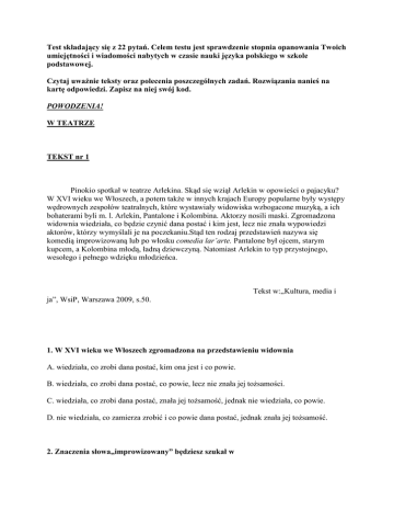 Test składający się z 22 pytań. Celem testu jest sprawdzenie stopnia opanowania Twoich umiejętności i wiadomości nabytych w czasie nauki języka polskiego w szkole podstawowej. Czytaj uważnie teksty oraz polecenia poszczególnych zadań. Rozwiązania nanieś na kartę odpowiedzi. Zapisz na niej swój kod. POWODZENIA! W TEATRZE TEKST nr 1 Pinokio spotkał w teatrze Arlekina. Skąd się wziął Arlekin w opowieści o pajacyku? W XVI wieku we Włoszech, a potem także w innych krajach Europy popularne były występy wędrownych zespołów teatralnych, które wystawiały widowiska wzbogacone muzyką, a ich bohaterami byli m. l. Arlekin, Pantalone i Kolombina. Aktorzy nosili maski. Zgromadzona widownia wiedziała, co będzie czynić dana postać i kim jest, lecz nie znała wypowiedzi aktorów, którzy wymyślali je na poczekaniu.Stąd ten rodzaj przedstawień nazywa się komedią improwizowaną lub po włosku comedia lar’arte. Pantalone był ojcem, starym kupcem, a Kolombina młodą, ładną dziewczyną. Natomiast Arlekin to typ przystojnego, wesołego i pełnego wdzięku młodzieńca. Tekst w:„Kultura, media i ja”, WsiP, Warszawa 2009, s.50. 1. W XVI wieku we Włoszech zgromadzona na przedstawieniu widownia A. wiedziała, co zrobi dana postać, kim ona jest i co powie. B. wiedziała, co zrobi dana postać, co powie, lecz nie znała jej tożsamości. C. wiedziała, co zrobi dana postać, znała jej tożsamość, jednak nie wiedziała, co powie. D. nie wiedziała, co zamierza zrobić i co powie dana postać, jednak znała jej tożsamość. 2. Znaczenia słowa„improwizowany” będziesz szukał w A. Słowniku ortograficznym. B. Słowniku frazeologicznym języka polskiego. C. Słowniku wyrazów bliskoznacznych. D. Słowniku wyrazów obcych. 3. W XVI wieku we Włoszech popularne były występy zespołów teatralnych. Od początku XVI wieku do końca XVIII wieku minęło A. 300 lat. B. 400 lat. C. 500 lat. D. 200 lat. TEKST nr 2 Sławny aktor był rozdrażniony. W ogóle nie lubił premier, a ta szczególnie kiepsko się zaczęła. Był zresztą przygotowany na najgorsze. Z przyjemnością grał bohaterów bez skazy, bo wtedy sympatia widowni była po jego stronie, a w tej sztuce grał czarny charakter. Było to pierwsze przedstawienie i sławny aktor jeszcze nie najlepiej panował nad tekstem roli. Na dobitkę, kiedy zjawił się w teatrze, stwierdził, że sufler gdzieś się zapodział i nikt go nie może zastąpić. Potem, tuz przed podniesieniem kurtyny, z jednej loży coś spadło na widownię. Byłą to kanapka z marmoladą, tak przynajmniej twierdził inspicjent.* Głupstwo, oczywiście, a jednak rozproszyło uwagę publiczności. A do tego jeszcze towarzystwo w tej loży zachowywało się hałaśliwie. Mistrz westchnął. Niewątpliwie zapowiadało się pechowe przedstawienie. * inspicjent– człowiek czuwający w teatrze nad techniczną i organizacyjną stroną przedstawienia Fragment książki„Miś zwany Paddington” Tłumaczenie: Kazimierz Piotrowski 4. Premiera to A. pierwsza rola aktora. B. pierwsze przedstawienie danego spektaklu. C. pierwsza próba generalna danego przedstawienia. D. pierwsza wizyta w teatrze. 5. Połącz strzałkami pojęcia i ich wyjaśnienia. A. aktor B. sufler C. kurtyna D. loża E. widownia 1.osoba niewidoczna dla widzów, podpowiadająca aktorowi słowa, gdyby zapomniał swej roli 2. miejsce w teatrze dla kilku osób, oddzielone od innych widzów 3.część teatru przeznaczona dla widzów 4. osoba odgrywająca rolę w teatrze 5.płachta materiału oddzielająca scenę od widowni 6. Inspicjent to A. sprzedawca biletów w teatrze. B. pracownik teatru czuwający nad techniczną i organizacyjną stroną przedstawienia. C. pracownik teatru zajmujący się charakteryzacją. D. pracownik teatru odpowiedzialny za oświetlenie podczas przedstawienia. 7.„(…) w tej sztuce grał czarny charakter” znaczy, że A. aktor grał rolę zbuntowanego samotnika. B. aktor ubrany był w czarny kostium z kapturem i maską. C. aktor wcielił się w rolę człowieka patrzącego na świat przez różowe okulary. D. aktor wcielił się w rolę człowieka złego i przewrotnego. 8. Zapisz dwa przykłady niewłaściwego zachowania się publiczności w teatrze. Użyj dwóch zdań pojedynczych oznajmujących. TEKST nr 3 W czasach panowania królowej Elżbiety I teatr był niezwykle ważny. Pierwszy teatr powstał w 1576r. Najsłynniejszym teatrem elżbietańskim był teatr The Globe, z którym związany był Szekspir i gdzie wystawiano jego sztuki. Zachowanie widzów w teatrze z czasów Szekspira znacznie odbiegało od dzisiejszych obyczajów publiczności teatralnej. Widzowie mogli w trakcie oglądania spektaklu jeść i pić, głośno wymieniać uwagi na temat oglądanego widowiska, wyrażać swoje opinie na temat gry aktorów, a nawet polemizować z bohaterami sztuki. Teatr w tamtych czasach nie był bowiem sztuką elitarną, lecz popularną rozrywką dla mas. W teatrze czasów Szekspira nie stosowano scenografii. Jej brak nadrabiano wspaniałością kostiumów, wyrazistością, dosłownością rekwizytów (np. tron, korona, berło oznaczały komnaty królewskie, flasze, kufle, ławy sunprowały wnętrze gospody) oraz sugestywną grą aktorów, których zadaniem było wyczarować na scenie odpowiedni nastrój. Grano komedie i tragedie. O charakterze danej sztuki informował londyńczyków kolor wywieszanych flag: biała oznaczała komedię, czarna– tragedię. Tekst na podst. książki M. St. Clare Byrne,„Życie codzienne w Anglii elżbietańskiej”, tłum. A. Staniewla, lark 1971, s. 261-280. 9. Przeczytaj dokładnie tekst nr 3 i przyjrzyj się poniższej ilustracji. Napisz, jaki gatunek sztuki teatralnej grano tego dnia w teatrze londyńskim. Załącznik 1 10. Podaj minimum dwa przykłady zachowania się publiczności w teatrze elżbietańskim odbiegające od dzisiejszych obyczajów widzów teatralnych. Użyj dwóch zdań złożonych. 11. Określ przypadek r