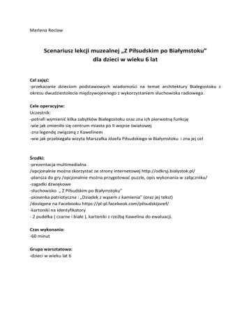 Marlena Reclaw Scenariusz lekcji muzealnej „Z Piłsudskim po Białymstoku” dla dzieci w wieku 6 lat Cel zajęć: -przekazanie dzieciom podstawowych wiadomości na temat architektury Białegostoku z okresu dwudziestolecia międzywojennego z wykorzystaniem słuchowiska radiowego. Cele operacyjne: Uczestnik: -potrafi wymienić kilka zabytków Białegostoku oraz zna ich pierwotną funkcję -wie jak zmieniło się centrum miasta po II wojnie światowej -zna legendę związaną z Kawelinem -wie jak przebiegała wizyta Marszałka Józefa Piłsudskiego w Białymstoku i zna jej cel Środki: -prezentacja multimedialna /opcjonalnie można skorzystać ze strony internetowej http://odkryj.bialystok.pl/ -plansza do gry /opcjonalnie można przygotować puzzle, opis wykonania w załączniku/ -zagadki dźwiękowe -słuchowisko „ Z Piłsudskim po Białymstoku” -piosenka patriotyczna : „Dziadek z wąsem z kamienia” (oraz jej tekst) /dostępne na Facebooku https://pl-pl.facebook.com/pilsudskijozef/ -kartoniki na identyfikatory - 2 pudełka ( czarne i białe ), kartoniki z rzeźbą Kawelina do ewaluacji. Czas wykonania: -60 minut Grupa warsztatowa: -dzieci w wieku lat 6 PRZEBIEG ZAJĘĆ Wprowadzenie -dzieci losują identyfikatory, w pudełku jest pięć rodzajów identyfikatorów: z psem Kawelinem, Ratuszem, Pałacem Branickich, Kościołem Farnym i dorożką. /W dalszym toku zajęć różne identyfikatory będą Stanowic przydział do grup zadaniowych/ -prowadzący pyta dzieci o imiona a następnie zapisuje je na identyfikatorach -ćwiczenie integrujące „Lustro”. Prowadzący pokazuje grupie zdjęcie rzeźby Kawelina. Zwraca uwagę na minę psa. Dzieci naśladują jego minę. Dobierają się w pary. Stają na przeciw siebie. Jedna osoba A pokazuje różne miny, druga osoba B czyli ,,lustro” pokazuje to samo. Po 2 minutach następuje zmiana ról. Część właściwa: -prowadzący opowiada dzieciom o autorach słuchowiska; krótko wspomina na czym polegała pierwsza edycja projektu i kim byli partnerzy projektu, a następnie zaprasza do wysłuchania słuchowiska. -prowadzący włącza prezentację, omawia zabytki występujące w słuchowisku ukazując różnice w ich wyglądzie między współczesnością a okresem dwudziestolecia międzywojennego. Podsumowanie: -prowadzący prosi uczestników o ustawienie się w grupy zgodnie z ilustracją umieszczoną na identyfikatorze /dzieci z rysunkiem np. Pałacu Branickich są jedną grupą, natomiast z dorożką kolejną itd./ -każda grupa losuje kartę do gry, zadaniem grupy jest ułożenie karty na planszy /opcjonalnie grupy otrzymują puzzle/ -zagadki dźwiękowe: prowadzący włącza dźwięki miasta takie jak tramwaj, ruch uliczny, samolot brzęk monet, dzieci odgadują czego które z tych dźwięków można było usłyszeć w przedwojennym Białymstoku /dźwięki można pobrać z banku dźwięków/ Ewaluacja: -prowadzący rozdaje dzieciom kartoniki z Kawelinem, uczestnicy którym zajęcia się podobały wrzucają kartonik do białego pudełka a te którym się nie podobały wrzucają kartonik do czarnego pudełka Pożegnanie: -na zakończenie prowadzący dziękuje za spotkanie i proponuje na pożegnanie wysłuchanie i wspólne wyklaskiwanie rytmu pieśni : „Dziadek z wąsem z kamienia”.