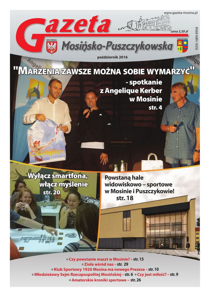 cena 3,50 zł pażdziernik 2016 "MARZENIA ZAWSZE MOŻNA SOBIE WYMARZYĆ" - spotkanie z Angelique Kerber w Mosinie str. 4 Wyłącz smartfona, włącz myślenie str. 20 Powstaną hale widowiskowo – sportowe w Mosinie i Puszczykowie! str. 18 Czy powstanie maszt w Mosinie? – str. 15 Zioła wśród nas – str. 29 Klub Sportowy 1920 Mosina ma nowego Prezesa – str. 10 Młodzieżowy Sejm Rzeczpospolitej Mosińskiej – str. 6 Czy jest miłość? – str. 9 Amatorskie kroniki sportowe – str. 26 ISSN 1689-8958 www.gazeta-mosina.pl www. ww wg reklama 2 DOM OPIEKI ŚWIERKOWY ZAKĄTEK TROSKLIWA OPIEKA, SERDECZNA ATMOSFERA www.swierkowyzakatek.pl PRYWATNY GABINET STOMATOLOGICZNY Grażyna Hetman kom. 605 078 307, tel. 61 89 38 059 Mosina, ul. Krasickiego 6 Zapewniamy długoterminową, całodobową i dzienną opieką nad osobami przewlekle somatycznie chorymi, niepełnosprawnymi, w podeszłym wieku i samotnymi. Miejsce to stworzone jest z myślą o szczęśliwej starości. BIURO OGŁOSZEŃ STOMATOLOGIA ZACHOWAWCZA PROFILAKTYKA STOMATOLOGIA DZIECIĘCA LECZENIE KANAŁOWE PROTETYKA MediRaty ZDJĘCIA RTG IMPLANTY ORTODONCJA CHIRURGIA - NFZ Szpital Puszczykowo ul. Kraszewskiego 11 (I piętro, pok. 1) 62-041 Puszczykowo Tel. 61 89 84 228 tel. 535 424 414 e-mail: [email protected] 3 Słowo Od Redakcji Szanowni Państwo! Po dziesięciu latach żegnam się z Czytelnikami naszej gazety. Nadszedł czas, aby przekazać pałeczkę młodszemu pokoleniu. Nie oznacza to jednak, że całkiem spocznę na laurach, postaram się dalej pisać i publikować. Moją funkcję z powodzeniem przejęła już pani Marta Mrowińska, która od września pełni obowiązki redaktor naczelnej gazety. Do zespołu dołączyli młodzi dziennikarze, dynamiczni i pełni zapału do pracy. Drodzy Czytelnicy! W tym roku mija dziesięć lat od momentu ukazania się pierwszego numeru Gazety Mosińsko – Puszczykowskiej. Przez ten czas wiele się zmieniło: szata graficzna gazety, jakość jej druku, osoby współpracujące z redakcją. Wciąż się rozwijamy: zależy nam na tym, by każdy Czytelnik znalazł na łamach naszej gazety coś dla siebie, stąd różnorodność tematyki artykułów. Wciąż usprawniamy także nasz serwis internetowy, jesteśmy aktywni na portalu społecznościowym – zachęcamy tym samym Czytelników do włączania się w życie gazety, chcemy, by wiadomości dotarły do jak największej liczby miesz- Właścicielem gazety jest obecnie mój syn – Jan Bylczyński. Minione lata i kontakt z Państwem były dla mnie bardzo dobre i ważne. Poprzez artykuły i reportaże nawiązałam z mieszkańcami wspaniałe relacje i przyjaźnie. Daliście mi Państwo wiele radości, okazaliście zaufanie i wdzięczność. Cóż więcej mam powiedzieć? Jestem dumna z tych kontaktów, które często zaowocowały prawdziwą przyjaźnią. Bardzo, bardzo dziękuję. Życzę Państwu dużo radości i pomyślności; z wyrazami szacunku Elżbieta Bylczyńska kańców i by każdy mógł je śledzić, a także dzielić się nimi bez wychodzenia z domu. Przed Państwem kolejny numer gazety. Przedstawiamy dwie duże inwestycje: hale widowiskowo – sportowe, powstające w Mosinie i Puszczykowie. Poruszamy także kontrowersyjny temat masztu radiokomunikacyjnego, jaki ma powstać na granicy gmin Mosiny i Puszczykowa. Sporo ciekawostek znajdą w numerze miłośnicy sportu – zamieszczamy relacje z gminnych imprez, ale także – i tu uwaga! – zachęcamy Państwa do opisywania swoich sportowych przeżyć. Otwieramy bowiem dział „Amatorskie kroniki sportowe”, w którym chcemy publikować relacje naszych czytelników. Mogą to być wspomnienia z zawodów, sukcesy lub nowe, sportowe odkrycia. W sporcie każdy jest zwycięzcą i warto się tym podzielić. Uruchamiamy również kącik zielarski. Chcemy w nim przedstawiać rośliny i zioła - w większości są one znane w domowej kuchni, jednak nie wszyscy wiedzą o ich niecodziennych właściwościach. Na początek prezentujemy głóg mając nadzieję, że kącik zainspiruje Państwa do wykorzystywania ziół i roślin w codziennym życiu. Ciekawym tematem jest także Młodzieżowy Sejm Rzeczpospolitej Mosińskiej – projekt realizowany przez Grupę Inicjatywną Baranówko pokazuje, że nie brakuje w naszej gminie aktywnych, młodych ludzi, którzy nie tylko nie boją się działać, ale są w swych działaniach skuteczni i konsekwentni. Warto zwrócić uwagę na jeszcze jeden materiał – „Czy jest miłość? Konie na salonie”. To krótka, lecz bardzo wzruszająca relacja o tym, jak zwierzęta reagują na stratę ich pana. Liczymy, że będzie to początek cyklu refleksji na temat miłości i że pytanie zadane w tytule jest jedynie pytaniem retorycznym, skłaniającym do poszukiwania przejawów miłości wokół nas. Dla wszystkich natomiast, którzy śledzą felietony dotyczące twórczości Józefa Mackiewicza mamy kolejny rarytas, tym razem dotyczący reakcjonizmu. Końcowa refleksja? Jak zwykle zaskakująca. Zapraszamy do aktywnego włączania się w życie gazety na stronach internetowych. Z przyjemnością czytamy listy skierowane do redakcji. Tymczasem życzymy miłej lektury i wszystkiego dobrego na rozpoczynający się, jesienny czas. Marta Mrowińska wydarzenia 4 "MARZENIA ZAWSZE MOŻNA SOBIE WYMARZYĆ" - spotkanie z Angelique Kerber w Mosinie Angelique Kerber jest w ostatnich miesiącach nazwiskiem numer jeden w świecie kobiecego tenisa. 22 września, podczas krótkiego pobytu w Puszczykowie, gdzie trenuje do turnieju w Azji, przyjechała do Mosiny. O zawodach, treningach i marzeniach opowiedziała podczas spotkania z młodzieżą w Ośrodku Sportu i Rekreacji. Rok 2016 jest dla Angelique Kerber wyjątkowy. Najpierw pierwszy szlem i wygrana Australian Open (w finale pokonała Serenę Williams). Potem finał w Wimbledonie. Kolejny sukces to srebrny medal na Igrzyskach Olimpijskich w Rio, a do tego - drugi tytuł wielkoszlemowy w Nowym Jorku. Na tym nie koniec - tuż p