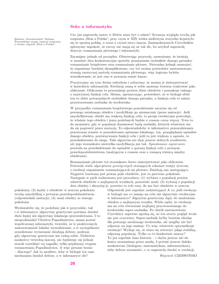 Seks a informatyka Bohater „Przedwiośnia” Stefana Żeromskiego mając napisać rozprawę o słoniu, napisał „Słoń a Polska”. Czy już naprawdę nawet w Delcie musi być o seksie? Sytuacja wygląda trochę jak rozprawa „Słoń a Polska”, przy czym w XIX wieku niektórym wszystko kojarzyło się ze sprawą polską, a teraz z czymś nieco innym. Zaniepokojonych Czytelników spieszymy uspokoić, że rzeczy nie mają się aż tak źle, bo artykuł naprawdę dotyczy rozmnażania płciowego i informatyki. Zacznijmy jednak od początku. Obserwując przyrodę, zauważamy, że istnieją w zasadzie dwa konkurencyjne sposoby pomnażania osobników danego gatunku: rozmnażanie bezpłciowe oraz rozmnażanie płciowe. Nietrudno jednak zauważyć, że organizmy bardziej skomplikowane, czy też można powiedzieć zaawansowane, stosują zazwyczaj metodę rozmnażania płciowego, więc logiczne byłoby wnioskowanie, że jest ono w pewnym sensie lepsze. Przyjrzyjmy się tym dwóm taktykom i zobaczmy, że można je zinterpretować w kontekście informatyki. Ewolucję samą w sobie możemy bowiem traktować jako obliczenie. Obliczenie to przeszukuje pewien zbiór obiektów i poszukuje takiego o najwyższej funkcji celu. Można, upraszczając, powiedzieć, że w biologii zbiór ten to zbiór potencjalnych osobników danego gatunku, a funkcja celu to miara przystosowania osobnika do środowiska. W przypadku rozmnażania bezpłciowego poszukiwanie zaczyna się od pewnego ustalonego obiektu i modyfikuje go nieznacznie (przez mutacje). Jeśli zmodyfikowany obiekt ma większą funkcję celu, to presja ewolucyjna powoduje, że właśnie tego obiektu i jemu podobnych będzie z czasem coraz więcej. Trwa to do momentu, gdy w populacji dominować będą osobniki, których właściwie nie da się poprawić przez mutację. To odpowiadałoby w informatyce przeszukiwaniu przestrzeni stanów w poszukiwaniu optimum lokalnego, tzn. przeglądaniu sąsiadów danego obiektu, porównywaniu funkcji celu i jeśli ta jest większa u sąsiada, to przeskakiwaniu do niego. Taki algorytm nie daje jeszcze dobrych rezultatów, ale jego stosunkowo niewielka modyfikacja już tak. Symulowane wyżarzanie pozwala na przeskakiwanie do sąsiadów o gorszej funkcji celu z pewnym prawdopodobieństwem (malejącym z czasem oraz z rosnącą różnicą między obiektami). Rozmnażanie płciowe też stosunkowo łatwo zinterpretować jako obliczenie. Powstało wiele algorytmów genetycznych stosujących schemat wzięty żywcem z ewolucji organizmów rozmnażających się płciowo. Działają one następująco. Najpierw losowana jest pewna pula obiektów, jest to pierwsze pokolenie. Następnie w pętli realizowana jest procedura: (1) wybierz z populacji pewien odsetek obiektów o najlepszych wynikach, pozostałe usuń; (2) wylosuj z populacji dwa obiekty i skrzyżuj je, powtórz to tyle razy, ile ma być obiektów w nowym Odpowiedź jest zupełnie zadziwiająca! A co, jeśli ewolucja pokoleniu; (3) każdy z obiektów w nowym pokoleniu w biologii ma co innego na celu niż algorytmy ewolucyjne trochę zmodyfikuj z pewnym prawdopodobieństwem w informatyce? Algorytm genetyczny dąży do znalezienia (odpowiednik mutacji); (4) usuń obiekty ze starego obiektu o najlepszym wyniku. Wielu sądzi, że ewolucja pokolenia. ma na celu stworzenie najlepiej przystosowanego do Wydawałoby się, że podobnie jak w przyrodzie, tak środowiska super-osobnika. Po chwili zastanowienia i w informatyce algorytmy genetyczne powinny działać Czytelnicy zapewne zgodzą się, że ten utarty pogląd wcale dużo lepiej niż algorytmy lokalnego przeszukiwania. I tu nie jest oczywisty. Super-osobnik byłby bowiem idealny niespodzianka! Christos Papadimitriou, znana postać dla pewnego ustalonego środowiska, ale mógłby nie być współczesnej informatyki, twierdzi, że w praktycznych odporny na jego zmiany. Co więc właściwie optymalizuje zastosowaniach lokalne wyszukiwanie, a w szczególności ewolucja? Wydaje się, że stara się stworzyć jakąś stabilną, symulowane wyżarzanie działają dobrze, podczas odporną populację. Tylko co to konkretnie znaczy? gdy algorytmy genetyczne nie radzą sobie. Niektórzy To już zupełnie inna historia – i chyba jeszcze nie do naukowcy twierdzą inaczej, nie będziemy się jednak końca zrozumiana przez naukę. I pewnie jeszcze daleko starali rozwikłać tej zagadki, tylko pójdziemy tropem naukowcom (biologom, matematykom, informatykom), rozumowania Papadimitriou. A więc pytanie brzmi żeby dobrze zrozumieć, o co naprawdę chodzi w ewolucji. – dlaczego? Jak to możliwe, żeby w biologii ten sam Wojciech CZERWIŃSKI mechanizm działał dobrze, a w informatyce źle? 20