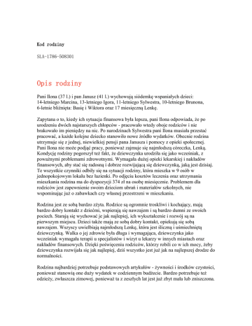 Kod rodziny SLA-1786-508301 Opis rodziny Pani Ilona (37 l.) i pan Janusz (41 l.) wychowują siódemkę wspaniałych dzieci: 14-letniego Marcina, 13-letniego Igora, 11-letniego Sylwestra, 10-letniego Brunona, 6-letnie bliźnięta: Basię i Wiktora oraz 17 miesięczną Lenkę. Zapytana o to, kiedy ich sytuacja finansowa była lepsza, pani Ilona odpowiada, że po urodzeniu dwóch najstarszych chłopców - pracowało wtedy oboje rodziców i nie brakowało im pieniędzy na nic. Po narodzinach Sylwestra pani Ilona musiała przestać pracować, a każde kolejne dziecko stanowiło nowe źródło wydatków. Obecnie rodzina utrzymuje się z jednej, niewielkiej pensji pana Janusza i pomocy z opieki społecznej. Pani Ilona nie może podjąć pracy, ponieważ zajmuje się najmłodszą córeczka, Lenką. Kondycję rodziny pogorszył też fakt, że dziewczynka urodziła się jako wcześniak, z poważnymi problemami zdrowotnymi. Wymagała dużej opieki lekarskiej i nakładów finansowych, aby stać się radosną i dobrze rozwijającą się dziewczynką, jaką jest dzisiaj. Te wszystkie czynniki odbiły się na sytuacji rodziny, która mieszka w 9 osób w jednopokojowym lokalu bez łazienki. Po odjęciu kosztów leczenia oraz utrzymania mieszkania rodzina ma do dyspozycji 374 zł na osobę miesięcznie. Problemem dla rodziców jest zapewnienie swoim dzieciom ubrań i materiałów szkolnych, nie wspominając już o zabawkach czy własnej przestrzeni w mieszkaniu. Rodzina jest ze sobą bardzo zżyta. Rodzice są ogromnie troskliwi i kochający, mają bardzo dobry kontakt z dziećmi, wspierają się nawzajem i są bardzo dumni ze swoich pociech. Starają się wychować je jak najlepiej, ich wykształcenie i rozwój są na pierwszym miejscu. Dzieci także mają ze sobą dobry kontakt, opiekują się sobą nawzajem. Wszyscy uwielbiają najmłodszą Lenkę, która jest śliczną i uśmiechniętą dziewczynką. Walka o jej zdrowie była długa i wymagająca, dziewczynka jako wcześniak wymagała terapii u specjalistów i wizyt u lekarzy w innych miastach oraz nakładów finansowych. Dzięki poświęceniu rodziców, którzy robili co w ich mocy, żeby dziewczynka rozwijała się jak najlepiej, dziś wszystko jest już jak na najlepszej drodze do normalności. Rodzina najbardziej potrzebuje podstawowych artykułów - żywności i środków czystości, ponieważ stanowią one duży wydatek w codziennym budżecie. Bardzo potrzebuje też odzieży, zwłaszcza zimowej, ponieważ ta z zeszłych lat jest już zbyt mała lub zniszczona. Uwaga: dla zachowania anonimowości, imiona członków rodziny mogły zostać zmienione Potrzeby rodziny I Żywność trwała: Podstawowe produkty żywnościowe: Herbata, Cukier, Konserwy mięsne, Kawa, Olej, Konserwy rybne, Ryż, Mąka, Dżem, Warzywa w puszkach Produkty dla niemowląt: kaszki mleczno-ryżowe, mleko Bebiko, soczki Kubuś Inne: słodycze dla dzieci, płatki do mleka, kakao, miód II Środki czystości i artykuły higieniczne Potrzebne środki czystości: Proszek do prania, Płyn do mycia naczyń, Mydło/żel myjący, Pasta do zębów, Płyny czyszczące, Szampon, Szczoteczka do zębów Artykuły dziecięce: Pampersy 14 - 17 mies., kremy Babydream, szmpony Babydream, chusteczki nawilżane III ODZIEŻ I OBUWIE ODZIEŻ Rodzaj Lp Płeć (letnie/zimowe/ przejściowe) Kategoria (bluzka, Rozmiar spodnie, kurtka itp.) 1 K zimowa kurtka 36/38 szczupła ciepła 2 M zimowa kurtka 1,60/M szczupła sportowa 3 M czapka + szalik 1,60/M 4 M spodnie dresowe 1,60/M szczupła kurtka 1,65 m korpulentna sportowa 6 M czapka + szalik 1,65 m 7 M spodnie dresowe 1,65 m korpulentna kurtka 1,40m szczupła 5 M 8 M zimowa zimowa Sylwetka Uwagi sportowa, niezbyt gruba, nadająca się do treningów na świeżym powietrzu, 9 M czapka + szalik 10 M dres: bluza i 1,40m spodnie 11 M czapka + szalik 12 M dres: bluza i 1,52 cm korpulentna spodnie 13 M zimowa 1,40m kurtka szczupła 1,25 cm szczupła czapka + szalik 14 M 15 M zimowa bluza 1,25 cm szczupła 16 K zimowa kurtka 1,30 cm szczupła 17 K getry 1,30 cm szczupła 18 K bluza 1,30 cm szczupła 19 K Śpiochy 92 cm/ szczupła 17 mies. kombinezon 92 cm/ szczupła 17 mies. 20 K sportowa zimowy kolorowa, dla dziewczynki OBUWIE Lp Płeć Rodzaj (letnie / zimowe / Kategoria (klapki, Rozmiar Uwagi przejściowe) tenisówki, kozaki itp.) 1 K zimowe kozaki 38 2 M zimowe trapery 41/42 3 M zimowe trapery 45 4 M zimowe trapery 38/9 5 M zimowe trapery 39 6 M zimowe trapery 32 7 K zimowe kozaki 32 płaskie IV Materiały szkolne: Zeszyty, Papier kolorowy, Plecak, Bloki, Klej, Przybory do pisania, Kredki, Piórnik Inne: piórnik dla Basi, usztywniane tornistry dla Basi i Wiktora, taśma klejąca, cyrkle i inne przybory geometryczne V Wyposażenie mieszkania: Kołdra, Koc, Ręczniki, Pościel, Poduszka VI BRAKUJĄCE SPRZĘTY GOSPODARSTWA DOMOWEGO: komplet garnków, patelnia, talerze VII. INNE POTRZEBY: tynk akrylowy - potrzeba remontu, ściany są spleśniałe. VIII Szczególne upominki: Pani Ilona - kosmetyk do makijażu, pan Janusz - kosmetyki, Marcin - kosmetyki, dezodorant, Igor - kosmetyki, dezodorant, Sylwester - sprzęt do ćwiczeń (ciężarki, drążek), Bruno - klocki lego (StarWars, Ninjago), Wiktor - auto sterowane, Basia - wózek dla lalek, Lenka - zabawka edukacyjna odzież ubrania zimowe z poprzednich lat są za małe lub zniszczone żywność będzie dużą pomocą w codziennym życiu środki czystości ich kupowanie poważnie nadwyręża budżet rodziny SLA-1786-514293 Opis rodziny Pani Barbara(29 l.) wychowywała samotnie trójkę dzieci: Patryka (10 l.), Doriana (9 l.) oraz Cypriana (8 l.). Później w jej życiu pojawił się pan Przemysław (34 l.), za którego wyszła za mąż. Jakiś czas później urodziły się im bliźniaki: Teresa (1 rok) i Marek (1 rok). Teraz razem wychowują piątkę dzieci. Po ślubie pani Barbary i pana Przemysława, rodzinie układało się bardzo dobrze. Oboje pracowali i mieszkali w wyremontowanym przez pana Przemysława 