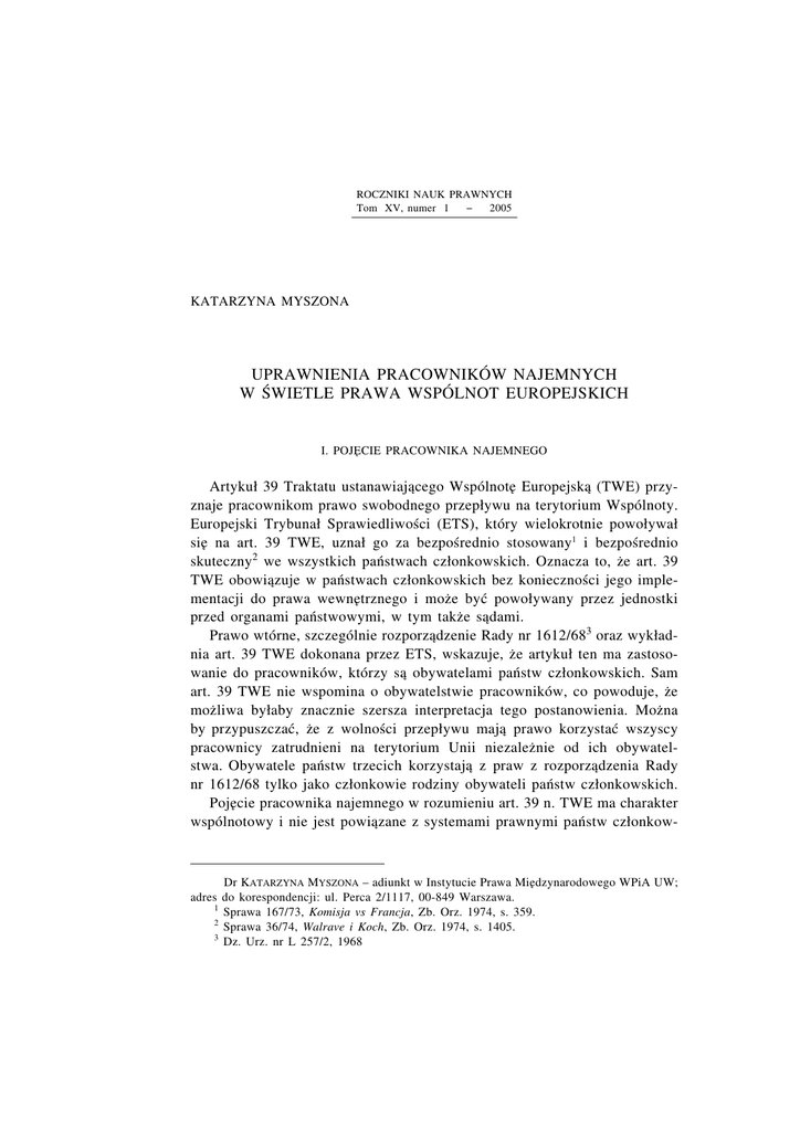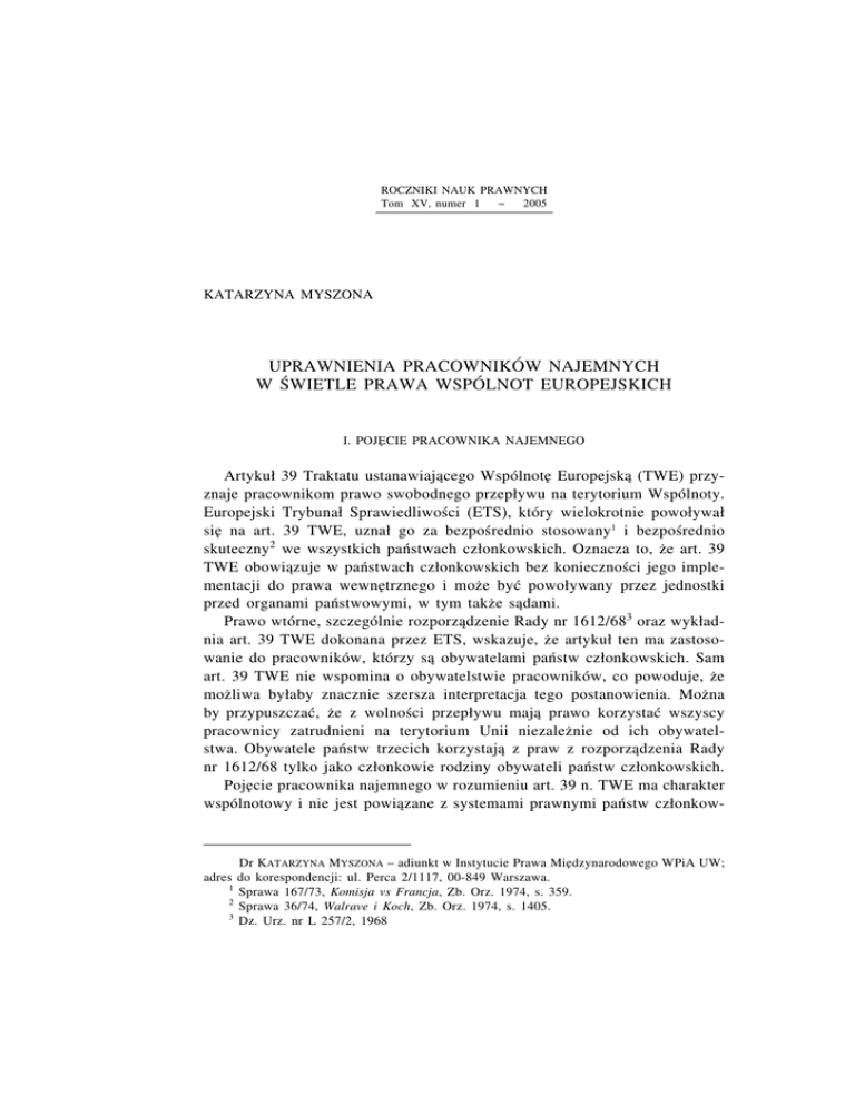 ROCZNIKI NAUK PRAWNYCH Tom XV, numer 1 − 2005 KATARZYNA MYSZONA UPRAWNIENIA PRACOWNIKÓW NAJEMNYCH W ŚWIETLE PRAWA WSPÓLNOT EUROPEJSKICH I. POJE˛CIE PRACOWNIKA NAJEMNEGO Artykuł 39 Traktatu ustanawiajacego ˛ Wspólnote˛ Europejska˛ (TWE) przyznaje pracownikom prawo swobodnego przepływu na terytorium Wspólnoty. Europejski Trybunał Sprawiedliwości (ETS), który wielokrotnie powoływał sie˛ na art. 39 TWE, uznał go za bezpośrednio stosowany1 i bezpośrednio skuteczny2 we wszystkich państwach członkowskich. Oznacza to, że art. 39 TWE obowiazuje ˛ w państwach członkowskich bez konieczności jego implementacji do prawa wewne˛trznego i może być powoływany przez jednostki przed organami państwowymi, w tym także sadami. ˛ Prawo wtórne, szczególnie rozporzadzenie ˛ Rady nr 1612/683 oraz wykładnia art. 39 TWE dokonana przez ETS, wskazuje, że artykuł ten ma zastosowanie do pracowników, którzy sa˛ obywatelami państw członkowskich. Sam art. 39 TWE nie wspomina o obywatelstwie pracowników, co powoduje, że możliwa byłaby znacznie szersza interpretacja tego postanowienia. Można by przypuszczać, że z wolności przepływu maja˛ prawo korzystać wszyscy pracownicy zatrudnieni na terytorium Unii niezależnie od ich obywatelstwa. Obywatele państw trzecich korzystaja˛ z praw z rozporzadzenia ˛ Rady nr 1612/68 tylko jako członkowie rodziny obywateli państw członkowskich. Poje˛cie pracownika najemnego w rozumieniu art. 39 n. TWE ma charakter wspólnotowy i nie jest powiazane ˛ z systemami prawnymi państw członkow- Dr KATARZYNA MYSZONA – adiunkt w Instytucie Prawa Mie˛dzynarodowego WPiA UW; adres do korespondencji: ul. Perca 2/1117, 00-849 Warszawa. 1 Sprawa 167/73, Komisja vs Francja, Zb. Orz. 1974, s. 359. 2 Sprawa 36/74, Walrave i Koch, Zb. Orz. 1974, s. 1405. 3 Dz. Urz. nr L 257/2, 1968 86 KATARZYNA MYSZONA skich4. Podlega kontroli ze strony ETS. Oznacza ono osobe˛ wykonujac ˛ a˛ prace˛ majac ˛ a˛ wymierna˛ wartość ekonomiczna˛ na rzecz lub pod kierunkiem innej osoby i otrzymujac ˛ a˛ za to wynagrodzenie bez wzgle˛du na charakter 5 pracy lub kontraktu . ETS stwierdził, że nie jest istotny wymiar pracy6, wysokość i charakter wynagrodzenia (może być przekazywane w naturze)7 ani wreszcie fakt otrzymywania oprócz wynagrodzenia również świadczeń z tytułu pomocy społecznej8. Za pracowników najemnych ETS uznał także osoby poszukujace ˛ 9 pracy . Pracownikami najemnymi nie sa˛ jedynie osoby podejmujace ˛ prace˛ 4 Sprawa 75/63, Hoekstra vs Bestuur der Bedrijfsvereniging voor Detailhandel en Ambachten, Zb. Orz. 1964, s. 177. W tej sprawie ETS po raz pierwszy orzekł, że termin „pracownik” powinien mieć definicje˛ wspólnotowa. ˛ 5 Sprawa 66/85, D. Lawrie-Blum vs Kraj Federalny Badenia-Wirtembergia, Zb. Orz. 1986, s. 2121. W sprawie tej ETS powtórzył, że „termin «pracownik» w art. 39 ma wspólnotowe znaczenie. Powinien być definiowany zgodnie z obiektywnymi kryteriami, które charakteryzuja˛ stosunek pracy, odwołujac ˛ sie˛ do praw i obowiazków ˛ osoby, o która˛ chodzi”. 6 Sprawa 53/81, Levin vs Staatssecretaris van Justitie, Zb. Urz. 1982, s. 1035. Levin, obywatelka brytyjska, mieszkała w Holandii. Jej maż ˛ był obywatelem państwa nie należacego ˛ do Wspólnot Europejskich. Odmówiono jej zezwolenia na pobyt, gdyż upłynał ˛ ponad rok od ostatniego przepracowanego przez nia˛ dnia. Levin twierdziła, że posiada wystarczajace ˛ dochody, aby utrzymać siebie i me˛ża. Podje˛ła także prace˛ w niepełnym wymiarze godzin. Władze holenderskie uważały, że Levin nie przysługuje prawo pobytu w Holandii, gdyż jej praca nie przynosi dochodów umożliwiajacych ˛ utrzymanie sie˛. 7 Sprawa 196/87, Steymann vs Staatssecretaris van Justitie, Zb. Orz. 1988, s. 6159. Steymann, obywatel Niemiec, mieszkał w Holandii i tam przez krótki czas pracował jako hydraulik. Naste˛pnie wstapił ˛ do wspólnoty Bhagwan, która zaspokajała wszelkie potrzeby swoich członków. Steymann uczestniczył w życiu wspólnoty, świadczył na jej rzecz usługi hydrauliczne, opiekował sie˛ obejściem. Nie otrzymał zezwolenia na pobyt. Władze holenderskie swoja˛ odmowe˛ tłumaczyły tym, że praca Steymanna nie przynosi dochodów umożliwiajacych ˛ mu utrzymanie sie˛. 8 Sprawa 139/85, Kempf vs Staatssecretaris van Justitie, Zb. Orz. 1986, s. 1741. Kempf, obywatel Niemiec, pracował w Holandii na pół etatu jako nauczyciel muzyki. Wystapił ˛ także o pomoc finansowa˛ dla pracowników na podstawie holenderskiej ustawy o zasiłkach dla bezrobotnych. Kempf zachorował, okazał sie˛ niezdolny do pracy, otrzymał zasiłek chorobowy na podstawie ustawy o zasiłkach zdrowotnych oraz dodatkowe świadczenia wynikajace ˛ z obu wspomnianych aktów. Wystapił ˛ o zezwolenie na pobyt, które nie zostało mu przyznane. Władze holenderskie stwierdziły, że Kempf nie mógł być uznany za uprzywilejowanego obywatela EWG w myśl prawa holenderskiego, ponieważ korzystał z pomocy społecznej w Holandii i nie był zdolny do zaspokajania swoich potrzeb z osiaganych ˛ z pracy dochodów. 9 Sprawa C-292/89, R. vs Immigration Appeal Tribunal, ex parte Gustaff Desiderius Antonissen, Zb. Orz. 1991, s I-745. ETS stwierdził, że „swobodny przepływ pracowników zawarty w art. 48 TWE pociaga ˛ za soba˛ prawo obywateli państw członkowskich do swobodnego poruszania sie˛ w obre˛bie terytorium innych państw członkowskich i pozostawania tam w celu poszukiwania pracy. Okres, w którym osoba poszukujaca ˛ pracy może pozostawać na UPRAWNIENIA PRACOWNIKÓW NAJEMNYCH 87 w ramach kuracji np. narkotykowej10. Zatrudnienie pracowników-obywateli innych państw członkowskich powinno odbywać sie˛ na tych samych zasadach co zatrudnienie własnych obywateli, bez jakiejkolwiek dyskryminacji. Definicja poje˛cia „pracownik” przyje˛ta przez ETS ma niezwykle szeroki zakres i świadczy o che˛ci obje˛cia zasada˛ swobodnego