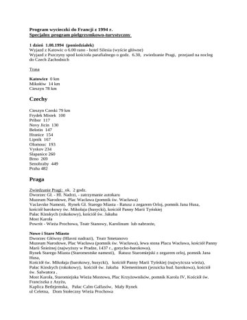 Program wycieczki do Francji z 1994 r. Specjalny program pielgrzymkowo-turystyczny 1 dzień 1.08.1994 (poniedziałek) Wyjazd z Katowic o 6.00 rano - hotel Silesia (wyście główne) Wyjazd z Pszczyny spod kościoła parafialnego o godz. 6.30, zwiedzanie Pragi, przejazd na nocleg do Czech Zachodnich Trasa Katowice 0 km Mikołów 14 km Cieszyn 78 km Czechy Cieszyn Czeski 79 km Frydek Mistek 100 Pribor 117 Novy Jicin 130 Belotin 147 Hranice 154 Lipnik 167 Olomouc 193 Vyskov 234 Slapanice 260 Brno 269 Senohraby 449 Praha 482 Praga Zwiedzanie Pragi: ok. 2 godz. Dworzec Gł. - Hl. Nadrzi, - zatrzymanie autokaru Muzeum Narodowe, Plac Wacława (pomnik św. Wacława) Vaclavske Namesti, Rynek Gł. Starego Miasta - Ratusz z zegarem Orloj, pomnik Jana Husa, kościół barokowy św. Mikołaja (husycki), kościół Panny Marii Tyńskiej Pałac Kinskych (rokokowy), kościół św. Jakuba Most Karola Powrót - Wieża Prochowa, Teatr Stanowy, Karolinum lub nabrzeże, Nowe i Stare Miasto Dworzec Główny (Hlavni nadrazi), Teatr Smetanovo Muzeum Narodowe, Plac Wacława (pomnik św. Wacława), lewa stona Placu Wacława, kościół Panny Marii Śnieżnej (najwyższy w Pradze, 1437 r., gotycko-barokowa), Rynek Starego Miasta (Staromestske namesti), Ratusz Staromiejski z zegarem orloj, pomnik Jana Husa, Kościół św. Mikołaja (barokowy, husycki), kościół Panny Marii Tyńskiej (najwyżcsza wieża), Pałac Kinskych (rokokowy), kościół św. Jakuba Klementinum (jezuicka bud. barokowa), kościół św. Salwatora , Most Karola, Staromiejska Wieża Mostowa, Plac Krzyżowników, pomnik Karola IV, Kościół św. Franciszka z Asyżu, Kaplica Betlejemska, Pałac Calm Gallasów, Mały Rynek ul Celetna, Dom Stołeczny Wieża Prochowa Targ Owocowy, Teatr Stanowy - Stavovske Divadlo, Karolinum Mała Strana - Hradczany - Zamek Staromiejska Wieża Mostowa, Most Karola, Malostrańskie Wieże Mostowe, kościół Matki Boskiej Zwycięskiej (Panan Marie Viteźna) - "Praski Jezusik" Rynek Małostrański, kościół św. Mikołaja (barokowy), ul. Nerudova - Pałac Thun-Hohensteinów statuetka Dawida (amb. Włoch), dalej Klasztor Strahovsky (Muzeum Literatury Narodowej), Pałac Czerninów (Min. Spraw Zagranicznych). Plac Loretański, Loreto (kościół Najśw. Panny Marii Loretańskiej) Hradcanske Namesti , Pałac Arcybiskupów, Galeria Narodowa w Palacu Sternberków (n apółnoc od pał. arcybiskupów), Zamek Dziedziniec Zamkowy, Brama Macieja, dziedziniec honorowy - flaga prezydencka Kaplica św. Krzyża, skarbiec św. Wita w Kaplicy św. Krzyża Bazylika św. Wita - wejście prze portal z brązu: krypta królewska, mauzoleum Habsburgów, grobowce Przemyslidów, srebrny ołtarz z relikwiami Jana Nepomucena - w prezbiterium, kaplica św. Wacława - szczątki św. Wacława i insygnia koronacyjne Pomnik św. Jerzego, bazylika św. Jerzego Sala Władysławowska, Sala Hołdu Pałac Lobkowiców - Muzeum Historyczne Czarna Wieża, Wieża Daliborka Złota uliczka (k. wieży Daliborka) Belweder - Letni Pałac Anny Jagiellonki (Letohradek) Schody zamkowe Pałac Waldsteinów - dawna stajnia służy za galerie , Ogród - Valdstejnska zahrada - Salla Terrena Klasztor św. Tomasza Most Karola Wyjazd ok. 17.30 do Rozvadova. - 160 km, ok. 3 godz. Beroun 514 km Zdice 522 km, Rokycany 558, Pilzen 574 Stribro Bor Rozvadov 644 (162 km z Pragi, ok. 3 godz. - ok. godz. 20.30 Drugi dzień - 2.08.1994 Przejazd przez Niemcy, zwiedzanie Stuttgartu i Baden-Baden, przekroczenie granicy francuskiej, zwiedzanie okolicy katedry w Strasbourgu, przejazd w kierunku Paryża z przerwą na toalete wieczorną Rozvadov (0) 644 km z Katowic Niemcy Waidhaus (1km) 644 km Weiden (20) Wernberg (30) 678 Amberg West (62 lub 75 przez Schwandorf).. Nurnberg ( 760 Norymberga 475tys mk, Bawaria Schwabach Ansbach Frankenhohe, Weinberg - 840 - Stacja benzynowa 1 wariant: - przez Schwabisch Hall, Felbach Feuchtwangen Crailshm ~850 km Burleswagen - Crailsheim , Schwabisch Hall, Winnenden, Waiblingen, Felbach, Stuttgart - 970 km (323km lub 312 km z Waidhaus do Stuttgartu) 2 wariant - przez Ludwigsburg - autostrada Waldenburg ** stacja benz. 920 km Weinsberg - 941 km, zjazd na A81 (na Ludwigsburg, Kornweistheim, Stuttgart) Ludwigsburg 880 Stuttgart 994 km - ok. 5 godz z Rozvadova Stuttgart - ok. godz. 13 Zwiedzanie - ok. 2 godz. Centrum: Hauptbahnhof, Arnulf Platz, Schiller Str., Klett Passage (podziemne pezejście), Schloßgarten, Domkirche (katedra), Kunstgebaude (miejska galeria sztuki), Shlossplatz - neues Schloss, Konigsbau (budowla król, neoklasyc.), Jubilaumssaule - pomnik Wilhelma I Planie , Schiller Platz - statua Schillera, Altes Schloss (Krajowe Muzeum Wirtembergii) Alte Kanzlei, Fruchskasten (Spichlerz) - Lapidarium Stiftskirche (kolegiata póxnogotycka) - galeria rodowa ksiażąt Wirtembergii Markthalle, Rathaus Leonhardskirche Konrad Adenauer Str., Charlotten Str, Wilhelmpalais - Biblioteka Miejska Staatsgalerie Staatstheater Landes Pavillon, Carl Zeiss Planetarium Poza centrum: Killesberg - Hohenpark, Rosensteinpark - Scloss Rosenstein BAD CANNSTATT - uzdrowisko Pałac Letni - Schloss Solitude - zamek rokokowy , w parku leśnym na zach. od miasta Daimler Benz Museum - Mercede Strasse 136 Porsche Museum - Porsche Str. 42 Trasa Stuttgart - Baden-Baden Stuttgart - odjazd ok. godz 16 (0) - 994 km) Leonberg (13) 1007 km Pforzheim (54), Ettlingen, Rastatt, Baden-Baden (104) 1107 Baden-Baden (104 km, 1107 km z Katowic) ok. 1.5 godz, ok. 18 wieczorem Zwiedzanie ok. 2 godz Dom Zdrojowy (Kurhaus), Park Zdrojowy Lichtentaler Alle - promenada Friedrichsbad - źródło termiczne w rynku miasta Markplatz Nowy Zamek (Neues Schloss), w nim Zahringen Museum Riny Rzymskich łażni (Romische Badruinen), Romerplatz - system podziemnego ogrzewania Kościół Kolegiacki (Stifstkirche) z pomnikiem margrafa badeńskiego Ludwika Turka (1754) Ruiny Zamku Hohenbaden i zamek Ebersteinburg Kolejka linowa na szczyt Merkur (669 m) Baden- Baden - Strasbourg Baden-Baden 0 , 1107km Baden-Baden 