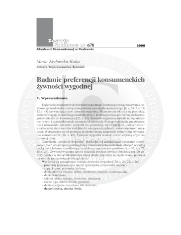 678 2005 Akademii Ekonomicznej w Krakowie Maria Krełowska-Kułas Katedra Towaroznawstwa Żywności Badanie preferencji konsumenckich żywności wygodnej 1. Wprowadzenie Dążenie konsumentów do bardziej wygodnego i szybszego przygotowywania posiłków spowodowało rozwój nowej branży przemysłu spożywczego [6, s. 34; 7, s. 14; 12, s. 44] wytwarzającej tzw. żywność wygodną. Mianem tym określa się produkty, które wymagają niewielkiego nakładu pracy i krótkiego czasu potrzebnego do przygotowania ich do konsumpcji [22, s. 33]. Żywność wygodna pozwala na ograniczenie praco- i czasochłonnych czynności domowych. Postęp w zakresie przetwarzania i utrwalania żywności pozwolił na produkcję wyrobów typu „convenience” z wykorzystaniem wysoko wydajnych i energooszczędnych, automatycznych urządzeń. Wytwarzane za ich pomocą produkty mogą zaspokoić różnorodne wymagania konsumentów [16, s. 40]. Żywność wygodna stanowi coraz większą część codziennej diety. Określenie „żywność wygodna” pochodzi od angielskiego wyrażenia convenience food, obejmującego dużą grupę różnorodnych produktów, których wspólną cechą jest ich forma umożliwiająca szybkie przygotowanie posiłków [8, s. 35; 9, s. 72; 15, s. 26]. Żywność wygodna jest to składnik posiłku (zwykle obiadowego) lub gotowy posiłek w stanie utrwalonym, który dzięki instrukcji na opakowaniu pozwala na szybkie przygotowanie do spożycia. Wyróżnia się następujące rodzaje żywności wygodnej [20, s. 24; 22, s. 16]: – produkty poprawiające apetyt (przekąski, przystawki, napoje), – zupy, kremy, potrawki, buliony, – dania główne mięsne, rybne, drobiowe, mączne, ziemniaczane, – dania warzywne, – sałatki rybne, mięsne, owocowe, mieszane, – różne typy chleba, bułek, grzanek, – dania specjalne narodowe lub etniczne, – desery, ciasta, ciastka i lody, 142 Maria Krełowska-Kułas – napoje bezalkoholowe, w tym przygotowane z suchych lub ciekłych składników, m.in. kawa i herbata instant, – odżywki i posiłki dla dzieci, – płatki śniadaniowe. Według K. Paulusa [18, s. 6] produkty należące do żywności wygodnej można podzielić zarówno pod względem gotowości do spożycia, jak i rodzaju utrwalania i opakowania. Podział żywności ze względu na pierwsze kryterium [18, s. 10] jest następujący: – przygotowane do obróbki (ready-to-process), – przygotowane do obróbki kulinarnej (ready-to-kitchen processing), – przygotowane do obróbki cieplnej (ready-to-cook), – przygotowane do podgrzania (ready-to-heat), – gotowe do spożycia (ready-to-eat), – gotowe do podania na stół (ready-to-serve). Według metod utrwalania, wyroby należące do żywności wygodnej podzielono na następujące grupy [22, s. 40]: – konserwy pasteryzowane i sterylizowane, – produkty suszone metodami tradycyjnymi, produkty typu instant i liofilizowane, – produkty mrożone, – produkty wychładzane (surowe i po obróbce cieplnej), – produkty chłodzone, pakowane próżniowo, – produkty chłodzone, pakowane w atmosferze modyfikowanej. Tabela 1. Użytkownicy żywności wygodnej Gotowy do spożycia po podgrzaniu Przygotowany do obróbki kulinarnej lub termicznej gospodarstwa domowe, małe kantyny, konferencje, uroczystości okolicznościowe, spotkania towarzyskie gospodarstwa domowe, małe i duże kantyny, szpitale, stołówki, sieci sprzedaży żywności duże kantyny, hotele, szpitale (z własną kuchnią), stołówki, producenci gotowych potraw Porcjowane komponenty posiłków gospodarstwa domowe, małe kantyny, urzędy, konferencje, uroczystości okolicznościowe, stołówki szkolne gospodarstwa domowe, małe i duże kantyny, szpitale, bary, stołówki, sieci sprzedaży żywności hurtownie, sieci sprzedaży żywności, zakłady żywienia zbiorowego, hotele, bary, restauracje, kantyny Zestawy gotowych posiłków systemy szybkiego żywienia (fast food), żywienie pasażerów linii lotniczych i kolejowych systemy szybkiego żywienia (fast food), żywienie pasażerów linii lotniczych i kolejowych szpitale (bez kuchni), zakłady żywienia zbiorowego, żywienie pasażerów linii kolejowych Typ produktu Gotowy do spożycia Komponenty posiłków Źródło: [22, s. 60]. 143 Badanie preferencji konsumenckich żywności wygodnej Żywność wygodna umożliwia znaczne skrócenie czasu przygotowania posiłków tak w gospodarstwach domowych konsumentów, jak i w różnych systemach żywienia zbiorowego (tabela 1). Im wyższy jest stopień przetworzenia żywności wygodnej, tym krótszy jest czas niezbędny do przygotowania posiłku. Przygotowanie kulinarne w przypadku takiej żywności jest ograniczone do najprostszych operacji, obejmujących np. mieszanie z wodą lub podgrzanie w kuchniach mikrofalowych (tabela 2). Tabela 2. Przykłady zastosowania żywności wygodnej Grupa żywności wygodnej Produkt Obróbka kulinarna przed podaniem Wyroby piekarnicze chleb krojony, bułki, bułki do hot-dogów brak obróbki lub łagodne ogrzewanie Płatki śniadaniowe płatki lub chrupki zbożowe, kukurydziane i ryżowe brak obróbki lub dodanie zimnego/gorącego mleka Konserwy w puszkach warzywa, owoce, zupy, sosy, mięso brak obróbki lub łagodne ogrzewanie Żywność chłodzona/mrożona porcjowane elementy kulinarne ogrzewanie, gotowanie, pieczenie, smażenie mięsa i drobiu, filety rybne, mieszanki warzywne, pizza, potrawy mączne, potrawy z ziemniaków Żywność utrwalona w technologii „cook-chill” lub „sous-vide” gotowe posiłki, warzywa, mięso lub drób z przyprawami lub sosami ogrzewanie do temperatury nie mniej niż 67°C w wodzie (10–15 min), piekarniku (20–25 min), kuchni mikrofalowej w opakowaniu lub bez niego (4–5 min) Koncentraty zbożowe makarony błyskawiczne, ryż błyskawiczny dodanie gorącej wody lub gotowanie przez kilka minut Koncentraty ciast i deserów ciasta, ciasteczka, pianki, galaretki, budynie dodanie wody zimnej/gorącej, wymieszanie, ch