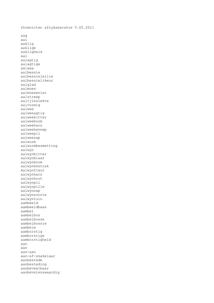 Słownictwo afrykanerskie V.05.2011 aag aai aaklig aaklige aakligheid aal aalagtig aalagtige aälawa aalbessie aalbessiejellie aalbessielikeur aalglad aalmoes aalmoesenier aalstreep aaltjiesiekte aalvormig aalwee aalweeagtig aalweebitter aalweeboom aalweehars aalweehennep aalweepil aalweesap aalwurm aalwurmbesmetting aalwyn aalwynbitter aalwynblaar aalwynboom aalwynekstrak Aalwynfleur aalwynhars aalwynhout aalwynpil aalwynpille aalwynsap aalwynsoorte aalwyntuin aambeeld aambeeldbaan aambei aambeibos aambeibosse aambeibossie aambeie aamborstig aamborstige aamborstigheid aan áán aan-aan aan-af-skakelaar aanbestede aanbesteding aanbeveelbaar aanbevelenswaardig aanbeveling aanbevelingsbrief aanbevole aanbevolene aanbiddelik aanbiddend aanbidding aanbied aanbieding aanbiedingsmetode aanbiedingstaal aanbiedingswyse aanbiedster aanblasing aanbod aanbodneiging aanbouing aand aandadig aandadige aandagafleibaarheidsindroom aandagbesteding aandaggewend aandaggewing aandagslewe aandagsoek aandagsoekery aandagspan aandagstreep aandagtekort aandagtig aandagtige aandbaadjie aandbesoek aandblaaie aandblad aandblom aandblomme aanddiens aanddrag aande aandeel aandeelbelegging aandeelbeurs aandeelbewys aandeelgroep aandeelhouding aandeelhouer aandeelhouersbelang aandeelmark aandeelprys aandeelsertifikaat aandelebesit aandelebesitter aandelebeurs aandelekapitaal aandelemaatskappy aandelemakelaar aandelemark aandeleportefeulje aandelepremie aandeleprys aandelesertifikaat aandeletransaksie aandeletrust aandenking aandenkingswinkeltjie aandete aandgebed aandgesang aandgloed aandgodsdiens aandhemde aandhemp aandikking aandjas aandjasse aandkerk aandklas aandklasse aandkleding aandklere aandklok aandklokke aandklokreël aandklokreëling aandkoerant aandlied aandliedere aandlig aandlug aandluggie aandmaal aandoening aandoenlik aandoenlike aandpak aandpakke aandpos aandpraatjies aandpypie aandrok aandrokke aandrokkie aandrooi Aandrus aandrywing aandrywingseenheid aandrywingsmeganisme aandsang aandsitting aandskaduwee aandskemer aandskoen aandskof aandskool aandson aandster aandstond aandstonde aandstudent aandtabberd aandtassie aandtenue aandtog aandtrein aanduider aanduiding aandurwing aandvermaak aandwandeling aandwind aandwindjie aandwydte aaneenflans aaneengeflans aaneengeryg aaneengeskakel aaneengeskakeld aaneengeskryf aaneengeslote aaneengesluit aaneengesmede aaneengesmee aaneengesweis aaneenheg aaneenryg aaneenskakel aaneenskakelend aaneenskakeling aaneenskryf aaneensluit aaneensluiting aaneensmee aaneensweis aanfluiting aangallop aangebedene aangedaan aangedane aangedien aangedik aangedui aangeë aangeebeweging aangeër aangegespe aangegroei aangegryns aangeheg aangehou aangehoudene aangekeer aangekeerde aangekla aangeklaagde aangeklam aangeklamde aangekom aangekomene aangekondig aangeland aangelê aangelegde aangelym aangemaan aangemeld aangemelde aangemoedig aangenaam aangename aangeplaktheid aangepor aangeraak aangeraakte aangeroep aangeroer aangeroerde aangesetene aangesigsenuwee aangeskaf aangeskote aangeskroef aangeslaan aangeslib aangeslik aangespeld aangespreek aangesprokene aangesteek aangestip aangestook aangestuur aangetas aangetaste aangetekende aangetoon aangetrek aangetrokkenheid aangevoelde aangevoode aangevoor aangevuur aangewakker aangrensend aangroei aangroeiing aangryp aangrypend aangrypende aangrypendheid aangryplikste aanhaaklyn aanhaaktreiler aanhalerig aanhalig aanhaling aanhalingsteken aanhalinkie aanhangig aanhangigmaking aanhangmotor aanhangsel aanhangwa aanhangwaens aanhanklik aanhegting aanhegtingspunt aanhits aanhitser aanhitsing aanhorig aanhoudend aanhoudingstehuis aanhu aankant aanklagkantoor aankleefsel aanklewend aanklewer aanklewing aanklopverkoper aanknopingspunt aankomeling aankomer aankomsaal aankomssaal aankomstyd aankondig aankondiger aankondiging aankondigster aankoop aankoopkoste aankoopprys aankoopsomme aankoping aanlandig aanlapping aanlapsel aanlassing aanlastafel aanleerbronne aanleg aanlegging aanlegkaai aanlegplan aanlegtoets aanlegvee aanlêhawe aanleiding aanlêpaal aanleuningspunt aanlokkende aanlokking aanloklik aanloklike aanloksel aanloopfase aanloophawe aanloophawens aanlooprondte aanmaakskottel aanmaning aanmatigend aanmatigende aanmekaarbring aanmekaargegroei aanmekaargekleef aanmekaargekoek aanmekaargelas aanmekaargesit aanmekaargeskryf aanmekaargeslaan aanmekaargesluit aanmekaargespring aanmekaargevleg aanmekaargroei aanmekaarhang aanmekaarkleef aanmekaarkoek aanmekaarlas aanmekaarsit aanmekaarskryf aanmekaarslaan aanmekaarsluit aanmekaarspring aanmekaarvleg aanmekaarwerk aanmeldbaar aanmelding aanmeldkantoor aanmeldnaam aanmeldskrif aanmerk aanmerking aanmerkinkie aanmerklik aanmerklike aanmoedig aanmoedigend aanmoediger aanmoediging aanmunt aanname aanneem aanneemlik aanneemlike aanneemlikheid aanneemouer aanneme aannemeling aanneming aannemingsaak aannemingsaansoek aannemingsbedrae aannemingsbedrag aannemingsdiens aannemingsklas aannemingsklasse aannemingsom aannemingsomme aannemingspak aannemingspakke aannemingsrok aannemingsrokke aannemingsrokkie aannemingstabberd aanpaksel aanpasbaar aanpasbaarheid aanpassing aanpassingsprobleem aanpassingsproses aanpassingsprosesse aanpassingsvermoë aanpassingsvermoëns aanpasvertrek aanpeiler aanplakbiljet aanplakbord aanplanting aanporder aanporring aanprys aanprysing aanraai aanraaiing aanrading aanraking aanrakingshoek aanrakingspunt aanrakingsvlak aanrakingsvlakke aanrand aanrander aanranding aanrykafee aansêbrief aansêer aansegger aansegging aansienlik aansienlike aansienliker aansiensoeker aansig aansitblad aansitete aansit-ete aansitmotor aansitriem aansitsleutel aansitslinger aansittende aansitweerstand aanskaffing aanskaffingskoste aanskou aanskouenswaardig aanskouing aanskouingsles aanskouingslesse aanskouingsmateriaal aanskoulik aanskoulike aanskrywing aanslaan aanslae aanslaer aanslag aanslagbedrag aanslagkantoor aanslagkomitee aanslikking aansliksel aanslofskoen aansluitbout aansluitend aa