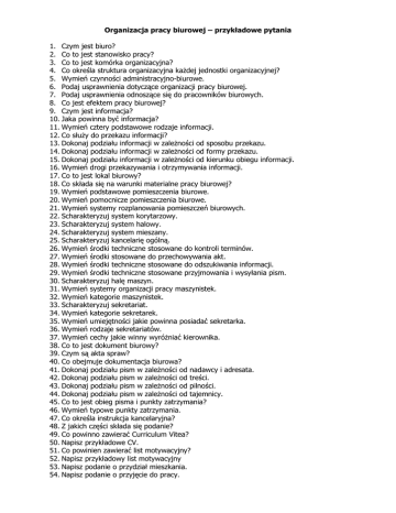 Organizacja pracy biurowej – przykładowe pytania 1. Czym jest biuro? 2. Co to jest stanowisko pracy? 3. Co to jest komórka organizacyjna? 4. Co określa struktura organizacyjna kaŜdej jednostki organizacyjnej? 5. Wymień czynności administracyjno-biurowe. 6. Podaj usprawnienia dotyczące organizacji pracy biurowej. 7. Podaj usprawnienia odnoszące się do pracowników biurowych. 8. Co jest efektem pracy biurowej? 9. Czym jest informacja? 10. Jaka powinna być informacja? 11. Wymień cztery podstawowe rodzaje informacji. 12. Co słuŜy do przekazu informacji? 13. Dokonaj podziału informacji w zaleŜności od sposobu przekazu. 14. Dokonaj podziału informacji w zaleŜności od formy przekazu. 15. Dokonaj podziału informacji w zaleŜności od kierunku obiegu informacji. 16. Wymień drogi przekazywania i otrzymywania informacji. 17. Co to jest lokal biurowy? 18. Co składa się na warunki materialne pracy biurowej? 19. Wymień podstawowe pomieszczenia biurowe. 20. Wymień pomocnicze pomieszczenia biurowe. 21. Wymień systemy rozplanowania pomieszczeń biurowych. 22. Scharakteryzuj system korytarzowy. 23. Scharakteryzuj system halowy. 24. Scharakteryzuj system mieszany. 25. Scharakteryzuj kancelarię ogólną. 26. Wymień środki techniczne stosowane do kontroli terminów. 27. Wymień środki stosowane do przechowywania akt. 28. Wymień środki techniczne stosowane do odszukiwania informacji. 29. Wymień środki techniczne stosowane przyjmowania i wysyłania pism. 30. Scharakteryzuj halę maszyn. 31. Wymień systemy organizacji pracy maszynistek. 32. Wymień kategorie maszynistek. 33. Scharakteryzuj sekretariat. 34. Wymień kategorie sekretarek. 35. Wymień umiejętności jakie powinna posiadać sekretarka. 36. Wymień rodzaje sekretariatów. 37. Wymień cechy jakie winny wyróŜniać kierownika. 38. Co to jest dokument biurowy? 39. Czym są akta spraw? 40. Co obejmuje dokumentacja biurowa? 41. Dokonaj podziału pism w zaleŜności od nadawcy i adresata. 42. Dokonaj podziału pism w zaleŜności od treści. 43. Dokonaj podziału pism w zaleŜności od pilności. 44. Dokonaj podziału pism w zaleŜności od tajemnicy. 45. Co to jest obieg pisma i punkty zatrzymania? 46. Wymień typowe punkty zatrzymania. 47. Co określa instrukcja kancelaryjna? 48. Z jakich części składa się podanie? 49. Co powinno zawierać Curriculum Vitea? 50. Napisz przykładowe CV. 51. Co powinien zawierać list motywacyjny? 52. Napisz przykładowy list motywacyjny 53. Napisz podanie o przydział mieszkania. 54. Napisz podanie o przyjęcie do pracy. 55. Napisz podanie o przyjęcie do szkoły. 56. W programie kadrowo-płacowym wprowadź pracownika do „Kartoteki pracowników” a następnie uzupełnij: a. Dane personalne - twoje imię i nazwisko, pozostałe dane dowolne, b. Wykształcenie i szkolenia – przykładowe technikum handlowe, c. Historia zatrudniania – rok pracy w przykładowej firmie, d. Rodzina - małŜonek i dziecko, e. Zatrudnienie - umowa od 1 lutego na czas nieokreślony, stanowisko (kierownik transportu), etat (1/1), wynagrodzenie 2 100,00 zł. 57. W programie kadrowo-płacowym wprowadź pracownika do „Kartoteki pracowników” a następnie uzupełnij: a. Dane personalne - twoje imię i nazwisko, pozostałe dane dowolne, b. Wykształcenie i szkolenia – przykładowe technikum mechaniczne, c. Historia zatrudniania – dwa lata pracy w przykładowej firmie, d. Rodzina - małŜonek i dziecko, e. Zatrudnienie - umowa od 1 lutego do 31 lipca, stanowisko (główny mechanik), etat (1/1), wynagrodzenie 1 700,00 zł. 58. W programie kadrowo-płacowym wprowadź pracownika do „Kartoteki pracowników” a następnie uzupełnij: a. Dane personalne - twoje imię i nazwisko, pozostałe dane dowolne, b. Historia zatrudniania – dwa lata pracy w przykładowej firmie, c. Umowy zlecenia - umowa od 1 lutego do 31 marca, dowolny numer umowy, koszty uzyskania 20%, wynagrodzenie 4 500,00 zł. 59. W wykonaj schemat organizacyjny jak poniŜej: Dyrektor Radca prawny Główny księgowy Dyrektor ds. produkcji Sekretarka K-k transportu K-k ds. marketingu Kadrowa księgowa Brygada I Kierowcy Dział handlowy kasjerka Brygada II Magazynierzy Dział promocji Brygada III Brygada remontowa Specjalista ds. BHP