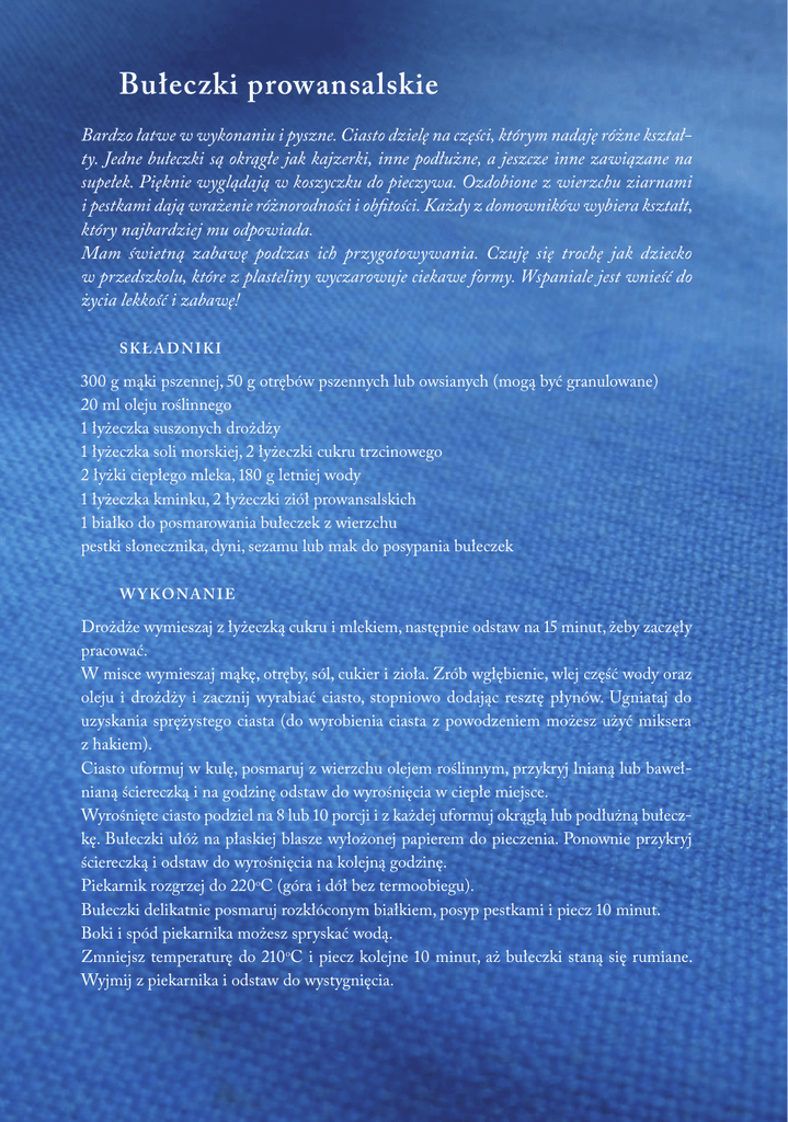 Bułeczki prowansalskie Bardzo łatwe w wykonaniu i pyszne. Ciasto dzielę na części, którym nadaję różne kształ ty. Jedne bułeczki są okrągłe jak kajzerki, inne podłużne, a jeszcze inne zawiązane na supełek. Pięknie wyglądają w koszyczku do pieczywa. Ozdobione z wierzchu ziarnami i pestkami dają wrażenie różnorodności i obfitości. Każdy z domowników wybiera kształt, który najbardziej mu odpowiada. Mam świetną zabawę podczas ich przygotowywania. Czuję się trochę jak dziecko w przedszkolu, które z plasteliny wyczarowuje ciekawe formy. Wspaniale jest wnieść do życia lekkość i zabawę! Składniki 76 300 g mąki pszennej, 50 g otrębów pszennych lub owsianych (mogą być granulowane) 20 ml oleju roślinnego 1 łyżeczka suszonych drożdży 1 łyżeczka soli morskiej, 2 łyżeczki cukru trzcinowego 2 łyżki ciepłego mleka, 180 g letniej wody 1 łyżeczka kminku, 2 łyżeczki ziół prowansalskich 1 białko do posmarowania bułeczek z wierzchu pestki słonecznika, dyni, sezamu lub mak do posypania bułeczek W y ko na n i e Drożdże wymieszaj z łyżeczką cukru i mlekiem, następnie odstaw na 15 minut, żeby zaczęły pracować. W misce wymieszaj mąkę, otręby, sól, cukier i zioła. Zrób wgłębienie, wlej część wody oraz oleju i drożdży i zacznij wyrabiać ciasto, stopniowo dodając resztę płynów. Ugniataj do uzyskania sprężystego ciasta (do wyrobienia ciasta z powodzeniem możesz użyć miksera z hakiem). Ciasto uformuj w kulę, posmaruj z wierzchu olejem roślinnym, przykryj lnianą lub baweł nianą ściereczką i na godzinę odstaw do wyrośnięcia w ciepłe miejsce. Wyrośnięte ciasto podziel na 8 lub 10 porcji i z każdej uformuj okrągłą lub podłużną bułecz kę. Bułeczki ułóż na płaskiej blasze wyłożonej papierem do pieczenia. Ponownie przykryj ściereczką i odstaw do wyrośnięcia na kolejną godzinę. Piekarnik rozgrzej do 220oC (góra i dół bez termoobiegu). Bułeczki delikatnie posmaruj rozkłóconym białkiem, posyp pestkami i piecz 10 minut. Boki i spód piekarnika możesz spryskać wodą. Zmniejsz temperaturę do 210oC i piecz kolejne 10 minut, aż bułeczki staną się rumiane. Wyjmij z piekarnika i odstaw do wystygnięcia. 77 W najnowszej książce Agnieszki Maciąg znajdziecie sprawdzone przepisy na pyszne, zdrowe i szybkie w przygotowaniu potrawy – mnóstwo pomysłów na śniadania, kolacje, przekąski i desery. KU P KS I Ą ŻK Ę