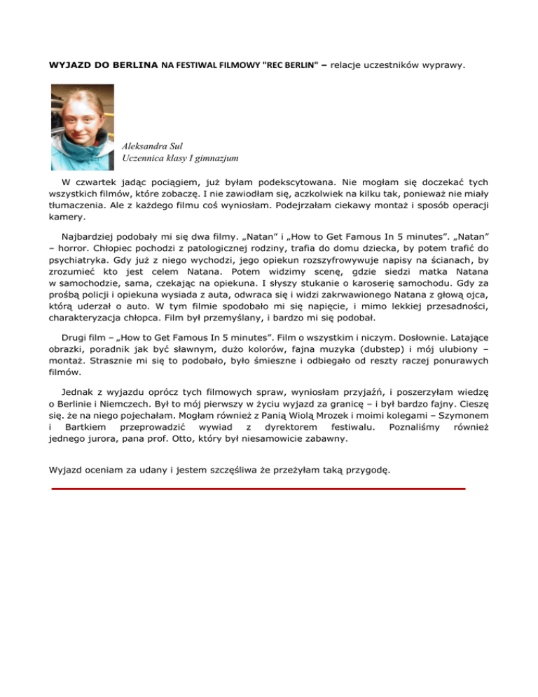 WYJAZD DO BERLINA NA FESTIWAL FILMOWY "REC BERLIN" – relacje uczestników wyprawy. Aleksandra Sul Uczennica klasy I gimnazjum W czwartek jadąc pociągiem, już byłam podekscytowana. Nie mogłam się doczekać tych wszystkich filmów, które zobaczę. I nie zawiodłam się, aczkolwiek na kilku tak, ponieważ nie miały tłumaczenia. Ale z każdego filmu coś wyniosłam. Podejrzałam ciekawy montaż i sposób operacji kamery. Najbardziej podobały mi się dwa filmy. „Natan” i „How to Get Famous In 5 minutes”. „Natan” – horror. Chłopiec pochodzi z patologicznej rodziny, trafia do domu dziecka, by potem trafić do psychiatryka. Gdy już z niego wychodzi, jego opiekun rozszyfrowywuje napisy na ścianach, by zrozumieć kto jest celem Natana. Potem widzimy scenę, gdzie siedzi matka Natana w samochodzie, sama, czekając na opiekuna. I słyszy stukanie o karoserię samochodu. Gdy za prośbą policji i opiekuna wysiada z auta, odwraca się i widzi zakrwawionego Natana z głową ojca, którą uderzał o auto. W tym filmie spodobało mi się napięcie, i mimo lekkiej przesadności, charakteryzacja chłopca. Film był przemyślany, i bardzo mi się podobał. Drugi film – „How to Get Famous In 5 minutes”. Film o wszystkim i niczym. Dosłownie. Latające obrazki, poradnik jak być sławnym, dużo kolorów, fajna muzyka (dubstep) i mój ulubiony – montaż. Strasznie mi się to podobało, było śmieszne i odbiegało od reszty raczej ponurawych filmów. Jednak z wyjazdu oprócz tych filmowych spraw, wyniosłam przyjaźń, i poszerzyłam wiedzę o Berlinie i Niemczech. Był to mój pierwszy w życiu wyjazd za granicę – i był bardzo fajny. Cieszę się. że na niego pojechałam. Mogłam również z Panią Wiolą Mrozek i moimi kolegami – Szymonem i Bartkiem przeprowadzić wywiad z dyrektorem festiwalu. Poznaliśmy również jednego jurora, pana prof. Otto, który był niesamowicie zabawny. Wyjazd oceniam za udany i jestem szczęśliwa że przeżyłam taką przygodę. Szymon Bobiński uczeń klasy I gimnazjum W dniach 1-4 października byłem w Berlinie wraz z czteroosobową ekipą, w której znajdowali się: Pani Wiola Mrozek - wychowawca i opiekun młodych filmowców, Pan Jacek - przewodnik, Bartłomiej Gawryszewski i Ola Sul - uczniowie. 1 października. Dzień rozpoczął się zameldowaniem ekipy przy kasach Dworca Centralnego w Warszawie, który zrobił na grupie ogromne wrażenie, ponieważ zaczął się w nim wielki remont. Następnie weszliśmy do pociągu, a mój tata, mama Oli i tata Bartka pożegnali nas i życzyli szczęścia. Po ruszeniu pociągu nie mogłem doczekać się Berlina, ale na szczęście pięciogodzinną podróż umiliła nam miła rozmowa i rysowanie. Kiedy dojechaliśmy, poczułem przytłoczenie wielkością miasta, ale na szczęście mieliśmy mapy, więc wiedzieliśmy gdzie iść. Pan Jacek czekał na nas w Berlinie i doprowadził grupę do pensjonatu. W pensjonacie zameldowaliśmy się oraz przebraliśmy i poszliśmy zwiedzać okolicę. Pierwsze co zauważyliśmy to wielki hipermarket oraz tamtejszy ratusz z czerwonej cegły, który mnie w pełni uwiódł. Po większej penetracji dzielnicy zauważyliśmy piękny staw ze starym urokliwym portem oraz sklep z ciekawymi pamiątkami. Tam już pierwszego dnia wydałem klika euro. Po zwiedzeniu dzielnicy udaliśmy się do kina aby zapoznać się z organizatorami, zobaczyć salę kinową oraz bufet gdzie zjedliśmy kolację. Po kolacji zobaczyliśmy pierwszy blok filmowy, który był dosyć ciekawy. Na sali byliśmy do godziny 22:30. Po bloku filmowym poszliśmy na nocny spacer, który trwał do godz. 2.00. Podczas nocnego zwiedzania przejechaliśmy się autobusem miejskim - było niesamowicie. Niestety, przed spacerem musieliśmy zostawić Bartka, bo trochę się źle poczuł. 2 października. Dzień zaczął się zakupami w "LIDLU" i planowaniem dnia. Następnie poszliśmy coś zjeść, a potem od razu pojechaliśmy na wycieczkę. Zwiedziliśmy "CHECKPOINT CHARLIE", który dla mnie był wielkim zaskoczeniem. Ulica była przedzielona brukowym pasem oddzielającym wschód Berlina od zachodu, znajdował się tam też pasaż z kawałkiem muru Berlińskiego oraz muzeum i dużo straganów które sprawiały wrażenie rosyjsko-niemieckiego bazaru. Na początku weszliśmy do "Muzeum Muru Berlińskiego", który niesamowicie mi się spodobał. Było tam bardzo dużo militarnych eksponatów, śmiesznych przedmiotów i ciekawych ale tragicznych zdjęć i opisów. Ogółem całe muzeum odzwierciedlało klimat Niemiec podzielonych na RFN i NRD. Po tej wspaniałej przygodzie całą grupą poszliśmy kupić pamiątki, z czego dla mnie najlepszą z nich były pagony niemieckiej armii (Bundeswera), które wyhandlowałem na straganie o połowę ceny mniej. Dalszym punktem wycieczki buła "Brama Bandenburska", która wprawiła mnie w zachwyt, a trafiliśmy tam mijając "Plac poczdamski". Na koniec wycieczki zjedliśmy orientalne chińskie danie: makaron w sosie z kurczakiem i warzywami (w tak zwanym pudełku). Po wycieczce około godziny 17:00, przebraliśmy się w elegancie ubrania i poszliśmy na blok filmowy. Po bloku zrobiliśmy wywiad z jednym z organizatorów festiwalu, a następnie udaliśmy się do pensjonatu żeby zostawić niepotrzebne rzeczy i pójść na niewielkie zakupy. Oczywiście po powrocie rozmawialiśmy jeszcze do 3 w nocy. 3 października. Rano pojechaliśmy w kierunku "Berlińskiego ZOO", aby zobaczyć naszą niespodziankę - "Zegar Wodny", który dla mnie był bardzo fajnym urządzeniem. Z daleka zobaczyliśmy wieżę telewizyjną z piękną kawiarenką na szycie. Przypadkowo trafiliśmy na święto Zjednoczenia Berlina, gdzie mogliśmy rozkoszować się smakiem tamtejszego "WURSTA", czyli kiełbasy. Ludzi było pełno, ale na szczęście udało nam się przebrnąć przez ten chaos. Kolejnym punktem zwiedzania był pomnik holokaustu upamiętniający zabitych w tym czasie Żydów. Potem przejechali