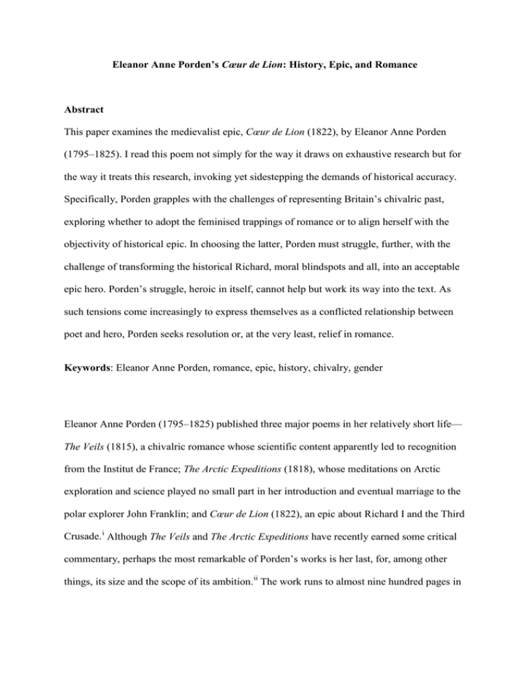 Eleanor Anne Porden’s Cœur de Lion: History, Epic, and Romance Abstract This paper examines the medievalist epic, Cœur de Lion (1822), by Eleanor Anne Porden (1795–1825). I read this poem not simply for the way it draws on exhaustive research but for the way it treats this research, invoking yet sidestepping the demands of historical accuracy. Specifically, Porden grapples with the challenges of representing Britain’s chivalric past, exploring whether to adopt the feminised trappings of romance or to align herself with the objectivity of historical epic. In choosing the latter, Porden must struggle, further, with the challenge of transforming the historical Richard, moral blindspots and all, into an acceptable epic hero. Porden’s struggle, heroic in itself, cannot help but work its way into the text. As such tensions come increasingly to express themselves as a conflicted relationship between poet and hero, Porden seeks resolution or, at the very least, relief in romance. Keywords: Eleanor Anne Porden, romance, epic, history, chivalry, gender Eleanor Anne Porden (1795–1825) published three major poems in her relatively short life— The Veils (1815), a chivalric romance whose scientific content apparently led to recognition from the Institut de France; The Arctic Expeditions (1818), whose meditations on Arctic exploration and science played no small part in her introduction and eventual marriage to the polar explorer John Franklin; and Cœur de Lion (1822), an epic about Richard I and the Third Crusade. i Although The Veils and The Arctic Expeditions have recently earned some critical commentary, perhaps the most remarkable of Porden’s works is her last, for, among other things, its size and the scope of its ambition. ii The work runs to almost nine hundred pages in two volumes, of which the historical notes alone, representing an impressive amount of research, occupy about 150 pages. In this paper, I suggest that Cœur de Lion is significant not simply for the way it draws on such exhaustive research but for its complex treatment of this research. Specifically, Porden grapples, as did so many of her contemporaries, with the vexed question of how best to transform Britain’s chivalric past into literature; Porden’s choice (given that she preferred to work in narrative verse) is ostensibly between epic and romance. This choice is complicated by the gender questions imbricated in the chivalric code and in contemporary interpretations of it: put simply, would Porden adopt the trappings of medieval romance that had, by the end of the eighteenth century, become a peculiarly feminised space offering both advantages and disadvantages for the woman writer, or, would she, disregarding these, produce a martial epic that would offer up Richard to its readers as a national hero? Porden seems to choose the latter, but her dilemma is compounded by the way in which the historiographical record compromises Richard’s heroic credentials. Not only did Porden as historical scholar have to deal with the challenge of conducting her research as a woman, but Porden as epic poet had to curb the moral waywardness of her hero. This authorial effort to transform Richard from historical figure into epic hero finds its way into the text. As the tensions between history and epic come increasingly to present themselves in terms of a lovehate relationship with Richard, Porden inevitably returns to the realm of romance for resolution or, at the very least, relief. I deal first with the poem’s attempts at historical accuracy, signalled both by the archival evidence of Porden’s meticulous research and by the self-consciously historicist statements she makes in the preface to her poem. I then contextualise these within contemporary discussions about the chivalric past to explore Porden’s response to the problematically feminised debates around romance and her privileging of the roles of epic poet and historical scholar. However, as I then suggest, the tensions between historical fidelity and poetic licence, already implicit in the preface, come to the fore in a reading of the poem as epic; indeed, they erupt when the narrative is juxtaposed with its historical notes. Finally, I turn to the poem’s curious inclusion of moments of romance, in which the narrative abandons the historical deeds of Richard to recount the fantastical exploits of the women of the crusade. These provide an opportunity to speculate on the extent to which, for Porden, the image of female heroism, courtesy of romance, reflects the achievement of the woman poet in rewriting history as epic. I Porden’s preface to Cœur de Lion, even as it reminds us that science was her other fascination, shows us how carefully she considered the treatment of history, particularly the challenge of representing the social codes and manners of the past: A blind admiration of the Great of former ages, has been so often ridiculed, that we are now apt to run into an opposite extreme; they are like the fossil plants which we sometimes discover far beneath the surface; we know that our soil and atmosphere would not now support them, yet they once flourished there in appropriate use and beauty. (1: xviii–xix) For Porden, historical representation runs from the extremes of “blind admiration” to something akin to ridicule. In partial response to this dilemma, she pleads the cause for historical accuracy—the keyword here is “appropriate”. In Porden’s analysis, the reconstruction of history has its parallel in the excavations of geology, resembling a kind of archaeology. Yet, even Porden is aware that any (arte)facts presented unmediated to a modern readership face decay and disdain in an unsupportive environment. As we shall see, although she valiantly advocates historical veracity, she must eventually acknowledge and circumvent the risks that it invites. First, it is important to consider the extent of Porden’s commitment to historical a