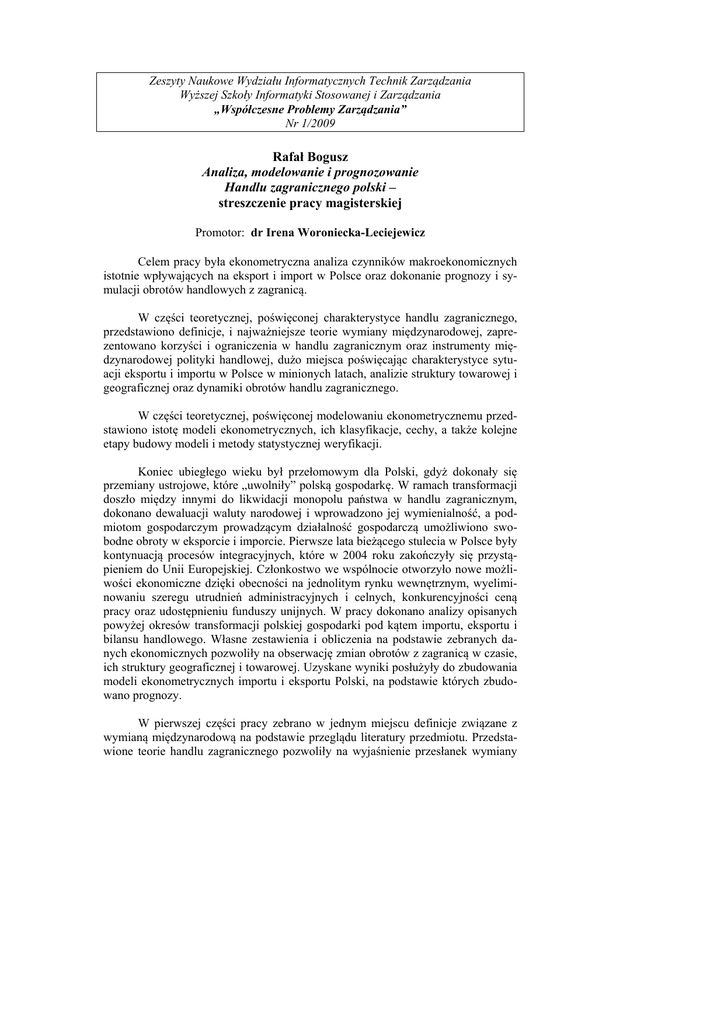 Zeszyty Naukowe Wydziału Informatycznych Technik Zarządzania Wyższej Szkoły Informatyki Stosowanej i Zarządzania „Współczesne Problemy Zarządzania” Nr 1/2009 Rafał Bogusz Analiza, modelowanie i prognozowanie Handlu zagranicznego polski – streszczenie pracy magisterskiej Promotor: dr Irena Woroniecka-Leciejewicz Celem pracy była ekonometryczna analiza czynników makroekonomicznych istotnie wpływających na eksport i import w Polsce oraz dokonanie prognozy i symulacji obrotów handlowych z zagranicą. W części teoretycznej, poświęconej charakterystyce handlu zagranicznego, przedstawiono definicje, i najważniejsze teorie wymiany międzynarodowej, zaprezentowano korzyści i ograniczenia w handlu zagranicznym oraz instrumenty międzynarodowej polityki handlowej, dużo miejsca poświęcając charakterystyce sytuacji eksportu i importu w Polsce w minionych latach, analizie struktury towarowej i geograficznej oraz dynamiki obrotów handlu zagranicznego. W części teoretycznej, poświęconej modelowaniu ekonometrycznemu przedstawiono istotę modeli ekonometrycznych, ich klasyfikacje, cechy, a także kolejne etapy budowy modeli i metody statystycznej weryfikacji. Koniec ubiegłego wieku był przełomowym dla Polski, gdyż dokonały się przemiany ustrojowe, które „uwolniły” polską gospodarkę. W ramach transformacji doszło między innymi do likwidacji monopolu państwa w handlu zagranicznym, dokonano dewaluacji waluty narodowej i wprowadzono jej wymienialność, a podmiotom gospodarczym prowadzącym działalność gospodarczą umożliwiono swobodne obroty w eksporcie i imporcie. Pierwsze lata bieżącego stulecia w Polsce były kontynuacją procesów integracyjnych, które w 2004 roku zakończyły się przystąpieniem do Unii Europejskiej. Członkostwo we wspólnocie otworzyło nowe możliwości ekonomiczne dzięki obecności na jednolitym rynku wewnętrznym, wyeliminowaniu szeregu utrudnień administracyjnych i celnych, konkurencyjności ceną pracy oraz udostępnieniu funduszy unijnych. W pracy dokonano analizy opisanych powyżej okresów transformacji polskiej gospodarki pod kątem importu, eksportu i bilansu handlowego. Własne zestawienia i obliczenia na podstawie zebranych danych ekonomicznych pozwoliły na obserwację zmian obrotów z zagranicą w czasie, ich struktury geograficznej i towarowej. Uzyskane wyniki posłużyły do zbudowania modeli ekonometrycznych importu i eksportu Polski, na podstawie których zbudowano prognozy. W pierwszej części pracy zebrano w jednym miejscu definicje związane z wymianą międzynarodową na podstawie przeglądu literatury przedmiotu. Przedstawione teorie handlu zagranicznego pozwoliły na wyjaśnienie przesłanek wymiany Dyplomy i kariery zawodowe absolwentów handlowej oraz korzyści dla stron biorących udział w obrocie z zagranicą. W pracy podjęto również tematykę wpływu na gospodarkę narodową handlu zagranicznego, który pełni funkcję transformacyjną (zmiana struktury produktu krajowego brutto), efektywnościową (podniesienie efektywności gospodarowania) i zasobotwórczą (wpływ na wielkość i dynamikę produktu krajowego brutto). Opisano także problematykę konkurencyjności międzynarodowej, instrumentów polityki handlowej oraz zewnętrznego zadłużenia zagranicznego. Analiza rozmiarów i dynamiki handlu zagranicznego Polski w latach 1950-2006, jak również zmian w strukturze geograficznej i towarowej polskiego eksportu importu, pozwoliła na wyodrębnienie pewnych punktów zwrotnych, opisanych w pracy. W empirycznej części pracy przedstawiono etapy budowy modelu ekonometrycznego, począwszy od specyfikacji modelu, poprzez estymację parametrów, weryfikację statystyczną aż po wykorzystanie modelu w celach poznawczych (interpretacja oszacowanych parametrów i wnioskowanie na podstawie uzyskanych wyników) oraz prognostycznych (opracowanie wariantowej prognozy obrotów handlu zagranicznego). Na podstawie analizy handlu zagranicznego Polski i zebranych danych wybrano czynniki mogące mieć wpływ na import i eksport. Do czynników wpływających na obroty handlu zagranicznego zaliczono m. in.: kurs nominalny dolara amerykańskiego, koniunkturę krajową mierzoną polskim produktem krajowym brutto, koniunkturę zagraniczną wyrażoną światowym produktem krajowym brutto, bezpośrednie inwestycje zagraniczne w Polsce, indeks cen konsumpcyjnych w Polsce, wskaźnik wolumenu odpowiednio importu i eksportu światowego, wskaźniki cen odpowiednio w imporcie i eksporcie światowym. Szeregi czasowe obejmowały lata 1990-2006, przy czym wybór okresu był podyktowany dostępnością porównywalnych danych empirycznych. Przy wykorzystaniu oprogramowania GRETL dokonano estymacji parametrów odpowiednich modeli ekonometrycznych, w szczególności parametrów liniowych i potęgowych funkcji eksportu i importu. Poszczególne modele zostały poddane weryfikacji ekonometrycznej m. in. pod kątem stopnia dopasowania modelu do danych empirycznych, istotności statystycznej zmiennych objaśniających i autokorelacji składnika losowego. Przy budowie liniowego modelu importu istotnymi zmiennymi objaśniającymi okazały się: kurs nominalny dolara amerykańskiego, koniunktura krajowa mierzona polskim produktem krajowym brutto, koniunktura zagraniczna wyrażona światowym produktem krajowym brutto oraz bezpośrednie inwestycje zagraniczne w Polsce. Oszacowane parametry modelu importu pozwoliły na prześledzenie ekonomicznych zależności. Wzrost kursu dolara przy niezmiennych pozostałych czynnikach powodował w analizowanym okresie spadek wolumenu importu i odwrotnie, wzrost kursu dolara wpływał na ograniczenia importu. Wzrost PKB w Polsce powodował, ceteris paribus, wzrost polskiego importu, podobnie jak wzrost PKB na świecie. Czynnikiem mającym wpływ na wielkość zagranicznych zakupów były również bezpośrednie inwestycje zagraniczne. Napływ inwestycji powodował w pierwszej kolejności wzrost imp