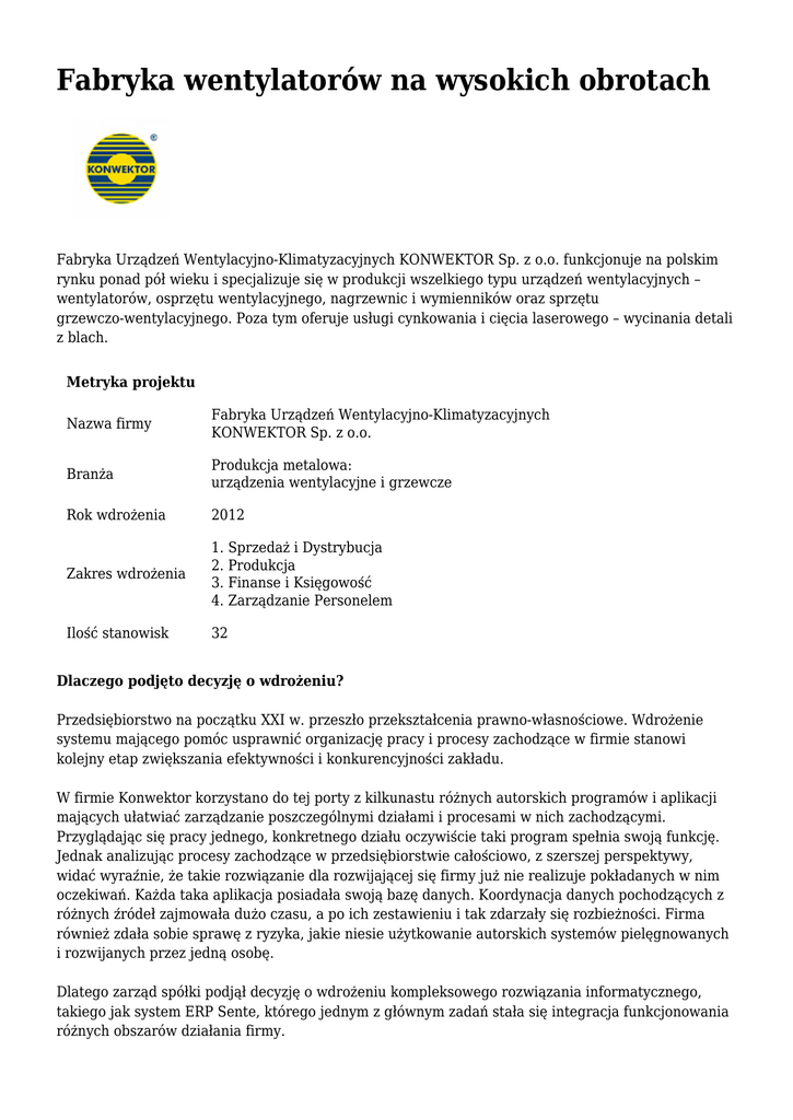Fabryka wentylatorów na wysokich obrotach Fabryka Urządzeń Wentylacyjno-Klimatyzacyjnych KONWEKTOR Sp. z o.o. funkcjonuje na polskim rynku ponad pół wieku i specjalizuje się w produkcji wszelkiego typu urządzeń wentylacyjnych – wentylatorów, osprzętu wentylacyjnego, nagrzewnic i wymienników oraz sprzętu grzewczo-wentylacyjnego. Poza tym oferuje usługi cynkowania i cięcia laserowego – wycinania detali z blach. Metryka projektu Nazwa firmy Fabryka Urządzeń Wentylacyjno-Klimatyzacyjnych KONWEKTOR Sp. z o.o. Branża Produkcja metalowa: urządzenia wentylacyjne i grzewcze Rok wdrożenia 2012 Zakres wdrożenia 1. Sprzedaż i Dystrybucja 2. Produkcja 3. Finanse i Księgowość 4. Zarządzanie Personelem Ilość stanowisk 32 Dlaczego podjęto decyzję o wdrożeniu? Przedsiębiorstwo na początku XXI w. przeszło przekształcenia prawno-własnościowe. Wdrożenie systemu mającego pomóc usprawnić organizację pracy i procesy zachodzące w firmie stanowi kolejny etap zwiększania efektywności i konkurencyjności zakładu. W firmie Konwektor korzystano do tej porty z kilkunastu różnych autorskich programów i aplikacji mających ułatwiać zarządzanie poszczególnymi działami i procesami w nich zachodzącymi. Przyglądając się pracy jednego, konkretnego działu oczywiście taki program spełnia swoją funkcję. Jednak analizując procesy zachodzące w przedsiębiorstwie całościowo, z szerszej perspektywy, widać wyraźnie, że takie rozwiązanie dla rozwijającej się firmy już nie realizuje pokładanych w nim oczekiwań. Każda taka aplikacja posiadała swoją bazę danych. Koordynacja danych pochodzących z różnych źródeł zajmowała dużo czasu, a po ich zestawieniu i tak zdarzały się rozbieżności. Firma również zdała sobie sprawę z ryzyka, jakie niesie użytkowanie autorskich systemów pielęgnowanych i rozwijanych przez jedną osobę. Dlatego zarząd spółki podjął decyzję o wdrożeniu kompleksowego rozwiązania informatycznego, takiego jak system ERP Sente, którego jednym z głównym zadań stała się integracja funkcjonowania różnych obszarów działania firmy. Jakie obszary objął swoim działaniem system ERP? Wdrożenie objęło swoim zasięgiem najbardziej istotne dla funkcjonowania firmy obszary i zostało zaplanowane etapowo. Ze względu na wspomniane wyżej różne aplikacje informatyczne wspierające pracę działów księgowości, sprzedaży, obsługi klienta, kadr i płac czy zaopatrzenia wdrożenie objęło następujące obszary systemu informatycznego Sente: Sprzedaż i Dystrybucja (w tym CRM), Produkcja, Zarządzanie Personelem, Finanse i Księgowość. Integracja i jeszcze raz integracja... Jednym z najbardziej odczuwalnych dla pracy organizacji usprawnień jest zintegrowanie funkcji rozmaitych aplikacji. Dzięki jednej bazie danych funkcjonującej w ramach systemu ERP firma oszczędza czas i zasoby, które do tej pory były przeznaczane do przenoszenia danych pomiędzy różnymi programami, a następnie sprawdzenia i skorygowania ewentualnych rozbieżności. Obecnie raz wpisane dane czy dokumenty służą do pracy wielu działów firmy. Oprócz tego do tej pory ze względu na czynnik ludzki w różnych programach przykładowa śrubka mogła posiadać różne indeksy nazw – oczywiście zbliżone do siebie, ale dla operacji logicznych w programach będące de facto odrębną pozycją. Wprowadzenie jednego, kompleksowego systemu pozwoliło ujednolicić kwestie nazewnictwa materiałów służących do produkcji wentylatorów. Lepsza płynność finansowa Doskonałym przykładem usprawnienia, a do tego łatwo mierzalnego ze względów ekonomicznych, jest szybszy wpływ należności na konto firmy. Ze względu na przepływ dokumentacji pomiędzy działami przedsiębiorstwa, dokumenty typu WZ były fakturowane nieregularnie, często długo po czasie ich wystawienia. Dzięki oprogramowaniu, po sporządzeniu WZ-ki, dane do wystawienia faktury są przekazywane do odpowiedniego działu firmy natychmiastowo i właściwy dokument księgowy jest tworzony od razu. Takie rozwiązanie pozwoliło skrócić czas wpływu zapłaty za zrealizowane zamówienie 2, a czasem nawet 3-krotnie! Logistyka zaopatrzenia i wysyłki gotowych produktów System pozwolił zintegrować pracę poszczególnych działów zaangażowanych w planowanie zamówień, wydawanie materiałów do produkcji oraz wysyłkę gotowych produktów do klienta. Obecnie utworzona przez handlowca dokumentacja (zamówienie sprzedaży), w ramach wdrożonego systemu, płynnie przechodzi przez kolejne działy przedsiębiorstwa (od działu sprzedaży do działu technologii, następnie produkcji, w końcu zaopatrzenia). Od pracowników poszczególnych działów wymagane jest uzupełnienie dokumentacji i zaakceptowanie (kliknięcie w programie) do dalszej realizacji przez kolejny dział. Wymagane do wykonania zamówień surowca oraz produkcji dokumenty (np. karty techniczno-kontrolne, kwity na pobranie materiałów) tworzone są automatycznie. Generowana dokumentacja jest ze sobą powiązana, kolejne wpisy wynikają z poprzednich. Również proces pakowania gotowych wyrobów i wysyłki przebiega systemowo – handlowiec zakłada dokument WZ w programie, a magazynier automatycznie otrzymuje informację, że jest do spakowania określony towar. Rozwiązanie systemowe pozwala integrować, a poprzez to przyspieszać i ułatwiać pracę poszczególnych działów firmy. Eliminowane są działania powtarzalne, polegające na przepisywaniu bądź ewidencjonowaniu dokumentacji. Niwelowane zostają ewentualne pomyłki ludzkie. Rejestrowane dane umożliwiają również na bieżące sprawdzenie w systemie stanu realizacji zamówienia. Gospodarka magazynowa w ujęciu systemu Wdrożenie systemu objęło również zarządzanie magazynem surowców i materiałów oraz produktów gotowych. Systemowe rozwiązania pozwoliły zapanować nad stanami magazynowymi i posiadać bieżące dane na temat zapasów. Wspom