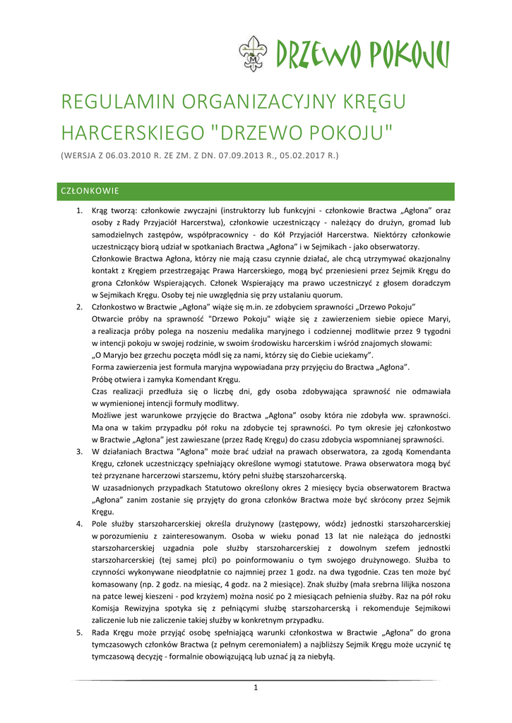 Drzewo pokoju REGULAMIN ORGANIZACYJNY KRĘGU HARCERSKIEGO "DRZEWO POKOJU" (WERSJA Z 06.03.2010 R. ZE ZM. Z DN. 07.09.2013 R., 05.02.2017 R.) CZŁONKOWIE 1. 2. 3. 4. 5. Krąg tworzą: członkowie zwyczajni (instruktorzy lub funkcyjni - członkowie Bractwa „Agłona” oraz osoby z Rady Przyjaciół Harcerstwa), członkowie uczestniczący - należący do drużyn, gromad lub samodzielnych zastępów, współpracownicy - do Kół Przyjaciół Harcerstwa. Niektórzy członkowie uczestniczący biorą udział w spotkaniach Bractwa „Agłona” i w Sejmikach - jako obserwatorzy. Członkowie Bractwa Agłona, którzy nie mają czasu czynnie działać, ale chcą utrzymywać okazjonalny kontakt z Kręgiem przestrzegając Prawa Harcerskiego, mogą być przeniesieni przez Sejmik Kręgu do grona Członków Wspierających. Członek Wspierający ma prawo uczestniczyć z głosem doradczym w Sejmikach Kręgu. Osoby tej nie uwzględnia się przy ustalaniu quorum. Członkostwo w Bractwie „Agłona” wiąże się m.in. ze zdobyciem sprawności „Drzewo Pokoju” Otwarcie próby na sprawność "Drzewo Pokoju" wiąże się z zawierzeniem siebie opiece Maryi, a realizacja próby polega na noszeniu medalika maryjnego i codziennej modlitwie przez 9 tygodni w intencji pokoju w swojej rodzinie, w swoim środowisku harcerskim i wśród znajomych słowami: „O Maryjo bez grzechu poczęta módl się za nami, którzy się do Ciebie uciekamy”. Forma zawierzenia jest formuła maryjna wypowiadana przy przyjęciu do Bractwa „Agłona”. Próbę otwiera i zamyka Komendant Kręgu. Czas realizacji przedłuża się o liczbę dni, gdy osoba zdobywająca sprawność nie odmawiała w wymienionej intencji formuły modlitwy. Możliwe jest warunkowe przyjęcie do Bractwa „Agłona” osoby która nie zdobyła ww. sprawności. Ma ona w takim przypadku pół roku na zdobycie tej sprawności. Po tym okresie jej członkostwo w Bractwie „Agłona” jest zawieszane (przez Radę Kręgu) do czasu zdobycia wspomnianej sprawności. W działaniach Bractwa "Agłona" może brać udział na prawach obserwatora, za zgodą Komendanta Kręgu, członek uczestniczący spełniający określone wymogi statutowe. Prawa obserwatora mogą być też przyznane harcerzowi starszemu, który pełni służbę starszoharcerską. W uzasadnionych przypadkach Statutowo określony okres 2 miesięcy bycia obserwatorem Bractwa „Agłona” zanim zostanie się przyjęty do grona członków Bractwa może być skrócony przez Sejmik Kręgu. Pole służby starszoharcerskiej określa drużynowy (zastępowy, wódz) jednostki starszoharcerskiej w porozumieniu z zainteresowanym. Osoba w wieku ponad 13 lat nie należąca do jednostki starszoharcerskiej uzgadnia pole służby starszoharcerskiej z dowolnym szefem jednostki starszoharcerskiej (tej samej płci) po poinformowaniu o tym swojego drużynowego. Służba to czynności wykonywane nieodpłatnie co najmniej przez 1 godz. na dwa tygodnie. Czas ten może być komasowany (np. 2 godz. na miesiąc, 4 godz. na 2 miesiące). Znak służby (mała srebrna lilijka noszona na patce lewej kieszeni - pod krzyżem) można nosić po 2 miesiącach pełnienia służby. Raz na pół roku Komisja Rewizyjna spotyka się z pełniącymi służbę starszoharcerską i rekomenduje Sejmikowi zaliczenie lub nie zaliczenie takiej służby w konkretnym przypadku. Rada Kręgu może przyjąć osobę spełniającą warunki członkostwa w Bractwie „Agłona” do grona tymczasowych członków Bractwa (z pełnym ceremoniałem) a najbliższy Sejmik Kręgu może uczynić tę tymczasową decyzję - formalnie obowiązującą lub uznać ją za niebyłą. 1 Drzewo pokoju 6. 7. Tymczasowy członek Bractwa Agłona ma pełne prawo głosu na zbiórkach Bractwa „Agłona”, ale prawo głosu na Sejmikach ma dopiero po potwierdzeniu przez Sejmik decyzji o jego członkostwie w Bractwie „Agłona”. Instruktorzy nie prowadzący jednostek mogą zrzeszać się w grupie specjalistów pod nazwą SęK (Specjaliści Kręgu). Celem istnienia SęKu jest wspieranie działań Kręgu poprzez pracę na wybranych przez siebie indywidualnych polach służby harcerskiej, instruktorskiej i specjalistycznej. Zakres zadań SęKu jest planowany w trybie rocznym i weryfikowany co pół roku przez Sejmik Kręgu. W celu realizacji zadań specjaliści mogą powoływać zespoły zadaniowe. SęK podlega bezpośrednio Komendantowi lub wyznaczonemu przez niego członkowi Rady Kręgu. W Kręgu istnieje możliwość powoływania klubów specjalnościowych - liczących minimum 3 osoby grup zrzeszających harcerzy zainteresowanych tą samą dziedziną. Kluby powinny mieć przynajmniej dwa spotkania w semestrze. Osoba prowadząca klub może być obserwatorem Bractwa „Agłona”. FUNKCJE INSTRUKTORSKIE W Kręgu są następujące funkcje uznawane za instruktorskie: 1. 2. 3. 4. 5. 6. 7. 8. 9. 10. 11. 12. 13. 14. 15. 16. 17. Komendant Kręgu Z-ca Komendanta Członek Rady Kręgu Członek Komisji Rewizyjnej Oboźny Kręgu Namiestnik Programowy Namiestnik Harcerzy Namiestniczka Harcerek Kapelan, Z-ca Kapelana Kwatermistrz Komendant Związku Drużyn (Środowiska) Drużynowy Przyboczny Samodzielny zastępowy Samodzielny podzastępowy Instruktor Kręgu Instruktor Związku Drużyn (Środowiska) Osoba, która z powodu utraty funkcji instruktorskiej czy harcerskiej lub sposobu służby starszoharcerskiej - nie spełnia warunków bycia członkiem lub obserwatorem Bractwa „Agłona” ma pół roku na rozwiązanie tej sprawy. 2