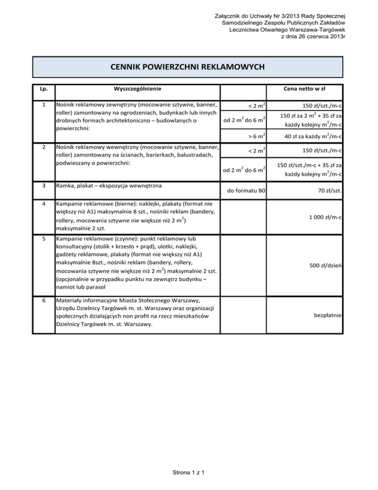 Załącznik do Uchwały Nr 3/2013 Rady Społecznej Samodzielnego Zespołu Publicznych Zakładów Lecznictwa Otwartego Warszawa-Targówek z dnia 26 czerwca 2013r CENNIK POWIERZCHNI REKLAMOWYCH Lp. Wyszczególnienie 1 Nośnik reklamowy zewnętrzny (mocowanie sztywne, banner, roller) zamontowany na ogrodzeniach, budynkach lub innych drobnych formach architektoniczno – budowlanych o powierzchni: 2 Cena netto w zł Nośnik reklamowy wewnętrzny (mocowanie sztywne, banner, roller) zamontowany na ścianach, barierkach, balustradach, podwieszany o powierzchni: < 2 m2 150 zł/szt./m-c od 2 m2 do 6 m2 150 zł za 2 m2 + 35 zł za każdy kolejny m2/m-c > 6 m2 40 zł za każdy m2/m-c < 2 m2 150 zł/szt./m-c od 2 m2 do 6 m2 150 zł/szt./m-c + 35 zł za każdy kolejny m2/m-c do formatu B0 70 zł/szt. 3 Ramka, plakat – ekspozycja wewnętrzna 4 Kampanie reklamowe (bierne): naklejki, plakaty (format nie większy niż A1) maksymalnie 8 szt., nośniki reklam (bandery, rollery, mocowania sztywne nie większe niż 2 m2) maksymalnie 2 szt. 1 000 zł/m-c Kampanie reklamowe (czynne): punkt reklamowy lub konsultacyjny (stolik + krzesło + prąd), ulotki, naklejki, gadżety reklamowe, plakaty (format nie większy niż A1) maksymalnie 8szt., nośniki reklam (bandery, rollery, mocowania sztywne nie większe niż 2 m2) maksymalnie 2 szt. (opcjonalnie w przypadku punktu na zewnątrz budynku – namiot lub parasol 500 zł/dzień 5 6 Materiały informacyjne Miasta Stołecznego Warszawy, Urzędu Dzielnicy Targówek m. st. Warszawy oraz organizacji społecznych działających non profit na rzecz mieszkańców Dzielnicy Targówek m. st. Warszawy. Strona 1 z 1 bezpłatnie