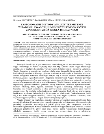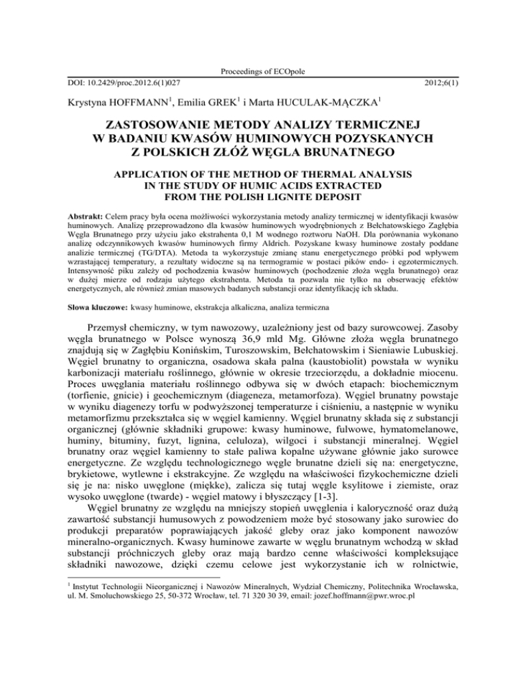 Proceedings of ECOpole DOI: 10.2429/proc.2012.6(1)027 2012;6(1) Krystyna HOFFMANN1, Emilia GREK1 i Marta HUCULAK-MĄCZKA1 ZASTOSOWANIE METODY ANALIZY TERMICZNEJ W BADANIU KWASÓW HUMINOWYCH POZYSKANYCH Z POLSKICH ZŁÓŻ WĘGLA BRUNATNEGO APPLICATION OF THE METHOD OF THERMAL ANALYSIS IN THE STUDY OF HUMIC ACIDS EXTRACTED FROM THE POLISH LIGNITE DEPOSIT Abstrakt: Celem pracy była ocena możliwości wykorzystania metody analizy termicznej w identyfikacji kwasów huminowych. Analizę przeprowadzono dla kwasów huminowych wyodrębnionych z Bełchatowskiego Zagłębia Węgla Brunatnego przy użyciu jako ekstrahenta 0,1 M wodnego roztworu NaOH. Dla porównania wykonano analizę odczynnikowych kwasów huminowych firmy Aldrich. Pozyskane kwasy huminowe zostały poddane analizie termicznej (TG/DTA). Metoda ta wykorzystuje zmianę stanu energetycznego próbki pod wpływem wzrastającej temperatury, a rezultaty widoczne są na termogramie w postaci pików endo- i egzotermicznych. Intensywność piku zależy od pochodzenia kwasów huminowych (pochodzenie złoża węgla brunatnego) oraz w dużej mierze od rodzaju użytego ekstrahenta. Metoda ta pozwala nie tylko na obserwację efektów energetycznych, ale również zmian masowych badanych substancji oraz identyfikację ich składu. Słowa kluczowe: kwasy huminowe, ekstrakcja alkaliczna, analiza termiczna Przemysł chemiczny, w tym nawozowy, uzależniony jest od bazy surowcowej. Zasoby węgla brunatnego w Polsce wynoszą 36,9 mld Mg. Główne złoża węgla brunatnego znajdują się w Zagłębiu Konińskim, Turoszowskim, Bełchatowskim i Sieniawie Lubuskiej. Węgiel brunatny to organiczna, osadowa skała palna (kaustobiolit) powstała w wyniku karbonizacji materiału roślinnego, głównie w okresie trzeciorzędu, a dokładnie miocenu. Proces uwęglania materiału roślinnego odbywa się w dwóch etapach: biochemicznym (torfienie, gnicie) i geochemicznym (diageneza, metamorfoza). Węgiel brunatny powstaje w wyniku diagenezy torfu w podwyższonej temperaturze i ciśnieniu, a następnie w wyniku metamorfizmu przekształca się w węgiel kamienny. Węgiel brunatny składa się z substancji organicznej (głównie składniki grupowe: kwasy huminowe, fulwowe, hymatomelanowe, huminy, bituminy, fuzyt, lignina, celuloza), wilgoci i substancji mineralnej. Węgiel brunatny oraz węgiel kamienny to stałe paliwa kopalne używane głównie jako surowce energetyczne. Ze względu technologicznego węgle brunatne dzieli się na: energetyczne, brykietowe, wytlewne i ekstrakcyjne. Ze względu na właściwości fizykochemiczne dzieli się je na: nisko uwęglone (miękke), zalicza się tutaj węgle ksylitowe i ziemiste, oraz wysoko uwęglone (twarde) - węgiel matowy i błyszczący [1-3]. Węgiel brunatny ze względu na mniejszy stopień uwęglenia i kaloryczność oraz dużą zawartość substancji humusowych z powodzeniem może być stosowany jako surowiec do produkcji preparatów poprawiających jakość gleby oraz jako komponent nawozów mineralno-organicznych. Kwasy huminowe zawarte w węglu brunatnym wchodzą w skład substancji próchniczych gleby oraz mają bardzo cenne właściwości kompleksujące składniki nawozowe, dzięki czemu celowe jest wykorzystanie ich w rolnictwie, 1 Instytut Technologii Nieorganicznej i Nawozów Mineralnych, Wydział Chemiczny, Politechnika Wrocławska, ul. M. Smoluchowskiego 25, 50-372 Wrocław, tel. 71 320 30 39, email: [email protected] 208 Krystyna Hoffmann, Emilia Grek i Marta Huculak-Mączka ogrodnictwie, sadownictwie i warzywnictwie jako nawóz oraz preparat poprawiający żyzność gleby [4-7]. Zgodnie z zasadami zrównoważonego rozwoju, należy połączyć i wyważyć cele oraz skutki stosowania nawożenia w rolnictwie. Z jednej strony konieczne jest zapewnienie żywności dla ciągle wzrastającej liczby ludności świata, a z drugiej rozsądne wykorzystywanie w tym celu szeroko rozumianego środowiska. Należy wziąć tu pod uwagę m.in. wykorzystanie surowców nawozowych, szkody związane z produkcją i stosowaniem nawozów oraz wykorzystanie areału rolniczego [8-11]. Stosując nawozy mineralne, dostarczamy potrzebne roślinie do rozwoju biogenne pierwiastki, tzw. makroelementy, do których należą N, P, K, Ca, Mg, S, oraz mikroelementy - Fe, Mn, Zn, Cu, B, Mo, Cl i Ni. Jeżeli w glebie jest zbyt mało materii organicznej, to szczególnie makroelementy nie zostaną pobrane przez rośliny i mogą stać się przyczyną m.in. eutrofizacji wód. Zjawisko to uzależnione jest bowiem od właściwości sorpcyjnych i kompleksujących substancji organicznej. W celu zwiększenia wykorzystania cennych składników nawozowych, a jednocześnie ulepszenia ochrony środowiska, we współczesnym rolnictwie odchodzi się od dotychczas używanych nawozów mineralnych na rzecz nawozów mineralno-organicznych. Takie działanie zgodne jest z zasadami zrównoważonego rozwoju, jednego z aktów prawnych, których przemysł nawozowy musi przestrzegać w Unii Europejskiej, oraz z różnymi programami i systemami zarządzania środowiskiem. Ze względów produkcyjnych i sozologicznych korzystne jest stosowanie do produkcji preparatów mineralno-huminowych, odpadowych, nieznajdujących wykorzystania w energetyce niskoenergetycznych węgli brunatnych [12-20]. W rolnictwie największe znacznie mają węgle brunatne nisko uwęglone, zawierające około 60÷80% mas. kwasów huminowych. W celu wydzielenia kwasów huminowych z węgla brunatnego poddaje się go ekstrakcji. Ilość i jakość wyekstrahowanych kwasów huminowych zależy od pochodzenia węgla (rodzaju roślinności, z której powstał, oraz warunków - temperatury i ciśnienia) oraz rodzaju użytego ekstrahenta. Podczas pozyskiwania kwasów huminowych z węgla brunatnego zachodzi szereg procesów chemicznych i fizykochemicznych, m.in. utlenianie, nitrowanie, rozkład prowadzący do wydzielenia gazowych produktów (H2O, CO2) oraz depolimeryzacja makromolekuł substancji organicznych węgl
