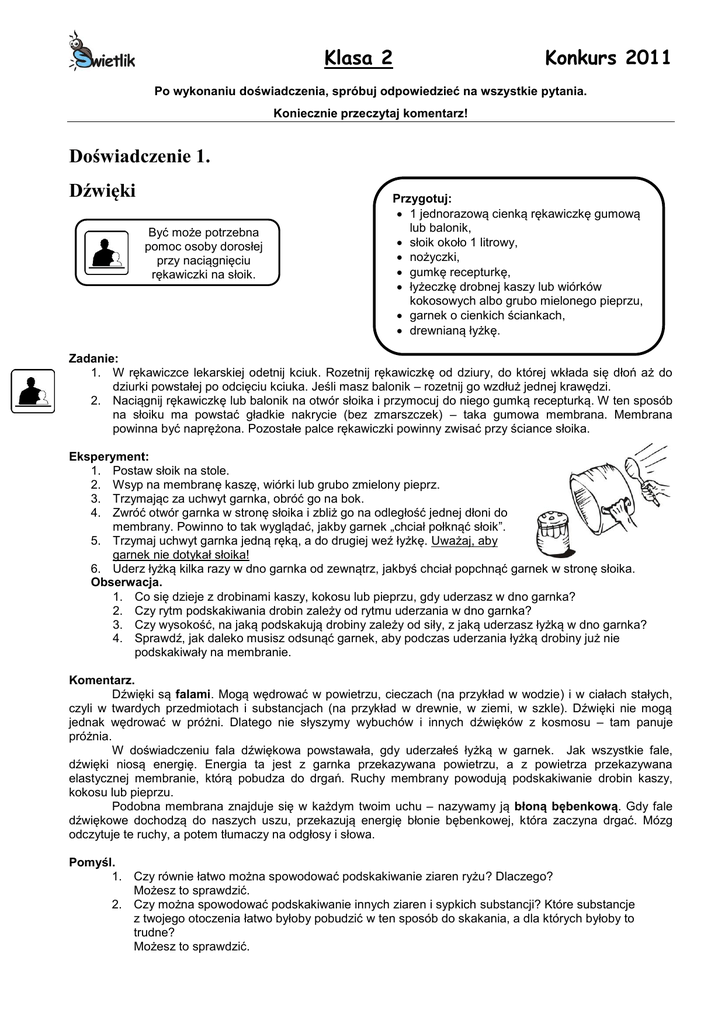 Klasa 2 Konkurs 2011 Po wykonaniu doświadczenia, spróbuj odpowiedzieć na wszystkie pytania. Koniecznie przeczytaj komentarz! Doświadczenie 1. Dźwięki Być może potrzebna pomoc osoby dorosłej przy naciągnięciu rękawiczki na słoik. Przygotuj: 1 jednorazową cienką rękawiczkę gumową lub balonik, słoik około 1 litrowy, nożyczki, gumkę recepturkę, łyżeczkę drobnej kaszy lub wiórków kokosowych albo grubo mielonego pieprzu, garnek o cienkich ściankach, drewnianą łyżkę. Zadanie: 1. W rękawiczce lekarskiej odetnij kciuk. Rozetnij rękawiczkę od dziury, do której wkłada się dłoń aż do dziurki powstałej po odcięciu kciuka. Jeśli masz balonik – rozetnij go wzdłuż jednej krawędzi. 2. Naciągnij rękawiczkę lub balonik na otwór słoika i przymocuj do niego gumką recepturką. W ten sposób na słoiku ma powstać gładkie nakrycie (bez zmarszczek) – taka gumowa membrana. Membrana powinna być naprężona. Pozostałe palce rękawiczki powinny zwisać przy ściance słoika. Eksperyment: 1. Postaw słoik na stole. 2. Wsyp na membranę kaszę, wiórki lub grubo zmielony pieprz. 3. Trzymając za uchwyt garnka, obróć go na bok. 4. Zwróć otwór garnka w stronę słoika i zbliż go na odległość jednej dłoni do membrany. Powinno to tak wyglądać, jakby garnek „chciał połknąć słoik”. 5. Trzymaj uchwyt garnka jedną ręką, a do drugiej weź łyżkę. Uważaj, aby garnek nie dotykał słoika! 6. Uderz łyżką kilka razy w dno garnka od zewnątrz, jakbyś chciał popchnąć garnek w stronę słoika. Obserwacja. 1. Co się dzieje z drobinami kaszy, kokosu lub pieprzu, gdy uderzasz w dno garnka? 2. Czy rytm podskakiwania drobin zależy od rytmu uderzania w dno garnka? 3. Czy wysokość, na jaką podskakują drobiny zależy od siły, z jaką uderzasz łyżką w dno garnka? 4. Sprawdź, jak daleko musisz odsunąć garnek, aby podczas uderzania łyżką drobiny już nie podskakiwały na membranie. Komentarz. Dźwięki są falami. Mogą wędrować w powietrzu, cieczach (na przykład w wodzie) i w ciałach stałych, czyli w twardych przedmiotach i substancjach (na przykład w drewnie, w ziemi, w szkle). Dźwięki nie mogą jednak wędrować w próżni. Dlatego nie słyszymy wybuchów i innych dźwięków z kosmosu – tam panuje próżnia. W doświadczeniu fala dźwiękowa powstawała, gdy uderzałeś łyżką w garnek. Jak wszystkie fale, dźwięki niosą energię. Energia ta jest z garnka przekazywana powietrzu, a z powietrza przekazywana elastycznej membranie, którą pobudza do drgań. Ruchy membrany powodują podskakiwanie drobin kaszy, kokosu lub pieprzu. Podobna membrana znajduje się w każdym twoim uchu – nazywamy ją błoną bębenkową. Gdy fale dźwiękowe dochodzą do naszych uszu, przekazują energię błonie bębenkowej, która zaczyna drgać. Mózg odczytuje te ruchy, a potem tłumaczy na odgłosy i słowa. Pomyśl. 1. Czy równie łatwo można spowodować podskakiwanie ziaren ryżu? Dlaczego? Możesz to sprawdzić. 2. Czy można spowodować podskakiwanie innych ziaren i sypkich substancji? Które substancje z twojego otoczenia łatwo byłoby pobudzić w ten sposób do skakania, a dla których byłoby to trudne? Możesz to sprawdzić. Klasa 2 Konkurs 2011 Czy rozumiesz? Czy znasz wszystkie te słowa i rozumiesz je: ☐ ☐ ☐ ☐ ☐ ☐ ☐ ☐ ☐ ☐ ☐ ☐ kciuk dźwięk membrana dno garnka drobina fala ciecz próżnia energia elastyczny błona bębenkowa sypka substancja Zakoloruj kratkę obok słowa, jeśli wiesz, co ono oznacza. Jeśli jeszcze nie rozumiesz któregoś z tych słów, porozmawiaj o nich z osobą dorosłą lub starszym rodzeństwem. Klasa 2 Konkurs 2011 Po wykonaniu doświadczenia, spróbuj odpowiedzieć na wszystkie pytania. Koniecznie przeczytaj komentarz! Doświadczenie 2. Co pływa, co tonie? Potrzebna pomoc osoby dorosłej przy nalewaniu wody do garnka oraz przy zrozumieniu instrukcji doświadczenia. Przygotuj: 1 średni lub duży garnek, 1 metalowe wieczko (pokrywkę) od słoika twist, małą kartkę papieru (na przykład widokówkę), mały kawałek drewna lub drewniany klocek (niemalowany), łyżkę lub łyżeczkę, 1 ziemniaka, 1 cebulę, 1 białą pietruszkę, 1 mandarynkę, 1 jabłko, wodę z kranu. inne owoce i warzywa, które masz pod ręką Zadanie: 1. Poproś osobę dorosłą, aby wlała wodę z kranu do garnka. Garnek powinien być wypełniony w trzech czwartych. Eksperyment: 1. Wrzuć do garnka łyżkę. 2. Wrzuć do garnka drewniany klocek. 3. Wepchnij drewniany klocek pod wodę i puść go. Obserwuj, co się z nim stanie. Obserwacja: 1. Który przedmiot utonął? 2. Jak sądzisz, czy wszystkie metalowe przedmioty toną w wodzie? 3. Przyjrzyj się uważnie drewnianemu klockowi. Czy widzisz w nim malutkie dziurki (jakby małe kanały)? 4. Połóż na stole wieczko od słoika dnem do dołu. Przykryj je kartką papieru. Jak sądzisz, co się znajduje pomiędzy kartką a dnem wieczka? 5. Odsłoń wieczko. Ostrożnie połóż wieczko na tafli wody dnem do dołu tak, aby nie utonęło. Obserwuj je przez chwilę. 6. Wepchnij wieczko do wody. Obserwuj, co się z nim stanie. Obserwacja: 1. Dlaczego wieczko położone na tafli wody pływa po niej, a wepchnięte do wody – tonie? 7. Wyciągnij z garnka drewniany klocek, metalową łyżkę i wieczko. 8. Na stole w jednym miejscu połóż łyżkę, w innym miejscu połóż drewniany klocek, a w jeszcze innym – wieczko. 9. Po kolei wrzucaj do garnka po jednym warzywie lub owocu. Sprawdź, czy pływa samodzielnie, czy też tonie. Jeśli pływa, to wepchnij je pod wodę i sprawdź, czy ponownie wypłynie. Po sprawdzeniu, wyciągnij warzywo lub owoc i ułóż go na stole albo przy łyżce, albo przy drewnianym klocku, albo przy wieczku od słoika. Obok łyżki układaj warzywa i owoce, które po wrzuceniu do wody same toną. Obok drewnianego klocka układaj warzywa i owoce, które po wrzuceniu do wody pływają, a wepchnięte do wody – wypływają na wierz