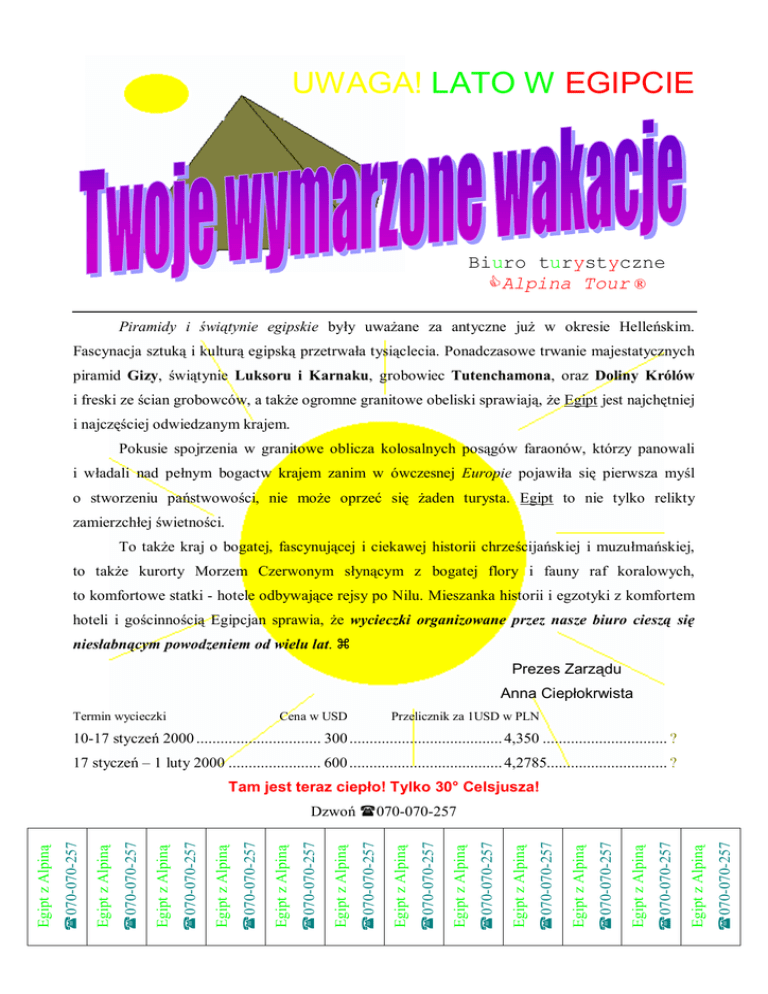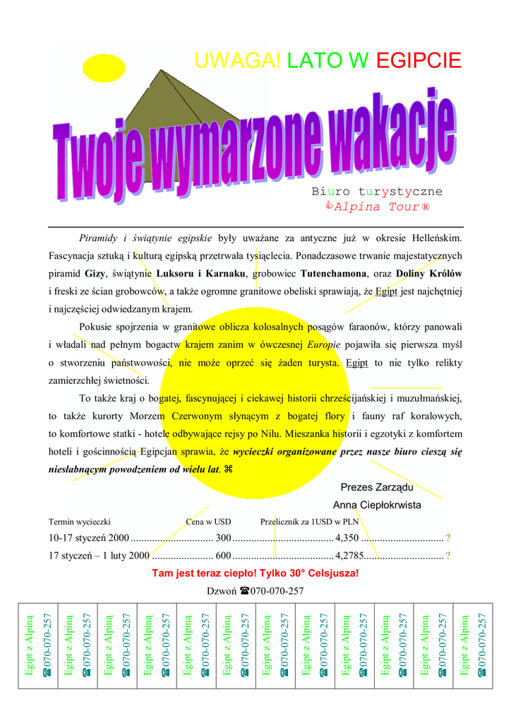 UWAGA! LATO W EGIPCIE Biuro turystyczne CAlpina Tour ® Piramidy i świątynie egipskie były uważane za antyczne już w okresie Helleńskim. Fascynacja sztuką i kulturą egipską przetrwała tysiąclecia. Ponadczasowe trwanie majestatycznych piramid Gizy, świątynie Luksoru i Karnaku, grobowiec Tutenchamona, oraz Doliny Królów i freski ze ścian grobowców, a także ogromne granitowe obeliski sprawiają, że Egipt jest najchętniej i najczęściej odwiedzanym krajem. Pokusie spojrzenia w granitowe oblicza kolosalnych posągów faraonów, którzy panowali i władali nad pełnym bogactw krajem zanim w ówczesnej Europie pojawiła się pierwsza myśl o stworzeniu państwowości, nie może oprzeć się żaden turysta. Egipt to nie tylko relikty zamierzchłej świetności. To także kraj o bogatej, fascynującej i ciekawej historii chrześcijańskiej i muzułmańskiej, to także kurorty Morzem Czerwonym słynącym z bogatej flory i fauny raf koralowych, to komfortowe statki - hotele odbywające rejsy po Nilu. Mieszanka historii i egzotyki z komfortem hoteli i gościnnością Egipcjan sprawia, że wycieczki organizowane przez nasze biuro cieszą się niesłabnącym powodzeniem od wielu lat. z Prezes Zarządu Anna Ciepłokrwista Termin wycieczki Cena w USD Przelicznik za 1USD w PLN 10-17 styczeń 2000 ............................... 300 ...................................... 4,350 ............................... ? 17 styczeń – 1 luty 2000 ....................... 600 ...................................... 4,2785.............................. ? Tam jest teraz ciepło! Tylko 30° Celsjusza! (070-070-257 Egipt z Alpiną (070-070-257 Egipt z Alpiną (070-070-257 Egipt z Alpiną (070-070-257 Egipt z Alpiną (070-070-257 Egipt z Alpiną (070-070-257 Egipt z Alpiną (070-070-257 Egipt z Alpiną (070-070-257 Egipt z Alpiną (070-070-257 Egipt z Alpiną (070-070-257 Egipt z Alpiną (070-070-257 Egipt z Alpiną (070-070-257 Egipt z Alpiną Dzwoń (070-070-257