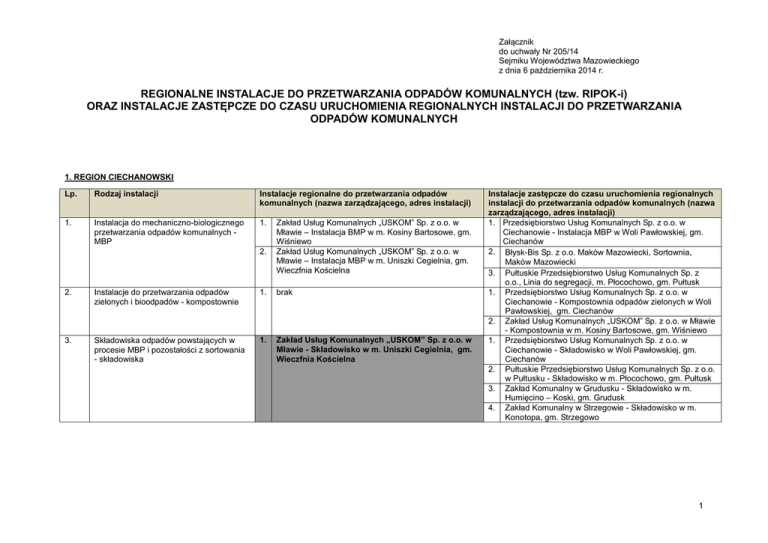 Załącznik do uchwały Nr 205/14 Sejmiku Województwa Mazowieckiego z dnia 6 października 2014 r. REGIONALNE INSTALACJE DO PRZETWARZANIA ODPADÓW KOMUNALNYCH (tzw. RIPOK-i) ORAZ INSTALACJE ZASTĘPCZE DO CZASU URUCHOMIENIA REGIONALNYCH INSTALACJI DO PRZETWARZANIA ODPADÓW KOMUNALNYCH 1. REGION CIECHANOWSKI Lp. Rodzaj instalacji Instalacje regionalne do przetwarzania odpadów komunalnych (nazwa zarządzającego, adres instalacji) 1. Instalacja do mechaniczno-biologicznego przetwarzania odpadów komunalnych MBP 1. 2. Zakład Usług Komunalnych „USKOM” Sp. z o.o. w Mławie – Instalacja BMP w m. Kosiny Bartosowe, gm. Wiśniewo Zakład Usług Komunalnych „USKOM” Sp. z o.o. w Mławie – Instalacja MBP w m. Uniszki Cegielnia, gm. Wieczfnia Kościelna 2. Instalacje do przetwarzania odpadów zielonych i bioodpadów - kompostownie 1. brak 3. Składowiska odpadów powstających w procesie MBP i pozostałości z sortowania - składowiska 1. Zakład Usług Komunalnych „USKOM” Sp. z o.o. w Mławie - Składowisko w m. Uniszki Cegielnia, gm. Wieczfnia Kościelna Instalacje zastępcze do czasu uruchomienia regionalnych instalacji do przetwarzania odpadów komunalnych (nazwa zarządzającego, adres instalacji) 1. Przedsiębiorstwo Usług Komunalnych Sp. z o.o. w Ciechanowie - Instalacja MBP w Woli Pawłowskiej, gm. Ciechanów 2. Błysk-Bis Sp. z o.o. Maków Mazowiecki, Sortownia, Maków Mazowiecki 3. Pułtuskie Przedsiębiorstwo Usług Komunalnych Sp. z o.o., Linia do segregacji, m. Płocochowo, gm. Pułtusk 1. Przedsiębiorstwo Usług Komunalnych Sp. z o.o. w Ciechanowie - Kompostownia odpadów zielonych w Woli Pawłowskiej, gm. Ciechanów 2. Zakład Usług Komunalnych „USKOM” Sp. z o.o. w Mławie - Kompostownia w m. Kosiny Bartosowe, gm. Wiśniewo 1. Przedsiębiorstwo Usług Komunalnych Sp. z o.o. w Ciechanowie - Składowisko w Woli Pawłowskiej, gm. Ciechanów 2. Pułtuskie Przedsiębiorstwo Usług Komunalnych Sp. z o.o. w Pułtusku - Składowisko w m. Płocochowo, gm. Pułtusk 3. Zakład Komunalny w Grudusku - Składowisko w m. Humięcino – Koski, gm. Grudusk 4. Zakład Komunalny w Strzegowie - Składowisko w m. Konotopa, gm. Strzegowo 1 2. REGION PŁOCKI Lp. Rodzaj instalacji Instalacje regionalne do przetwarzania odpadów komunalnych (nazwa zarządzającego, adres instalacji) 1. Instalacja do mechaniczno-biologicznego przetwarzania odpadów komunalnych MBP 1. 2. 2. Instalacje do przetwarzania odpadów zielonych i bioodpadów - kompostownie 1. Zakład Utylizacji Odpadów Komunalnych w Kobiernikach k/ Płocka Sp. z o.o. Zakład mechaniczno – biologicznego przetwarzania zmieszanych odpadów komunalnych, w m. Kobierniki, gm. Stara Biała Przedsiębiorstwo Gospodarki Komunalnej w Płońsku. Zakład mechaniczno – biologicznego przetwarzania zmieszanych odpadów komunalnych i odpadów selektywnie zebranych w m. Poświętne, gm. Płońsk Ziemia Polska Sp. z o. o. - kompostownia odpadów zielonych w m. Bielice, gm. Sochaczew Instalacje zastępcze do czasu uruchomienia regionalnych instalacji do przetwarzania odpadów komunalnych (nazwa zarządzającego, adres instalacji) 1. Zakład Gospodarki Mieszkaniowej w Sierpcu - Sortownia zmieszanych odpadów komunalnych oraz selektywnie zebranych, m. Rachocin, gm. Sierpc 2. 3. 1. 2. 3. Składowiska odpadów powstających w procesie MBP i pozostałości z sortowania - składowiska 1. Zakład Gospodarki Mieszkaniowej w Sierpcu Składowisko odpadów komunalnych w m. Rachocin, gm. Sierpc 1. 2. 3. 4. 5. 6. 7. 8. Zakład Usług Remontowych i Konserwacyjnych w Żurominie - Sortownia zmieszanych odpadów komunalnych w Żurominie, ul. Piłsudskiego 3 PPHU ZEBRA s. j. w Sochaczewie - Sortownia zmieszanych odpadów komunalnych oraz selektywnie zebranych w Sochaczewie, ul. Chemiczna 8 Zakład Utylizacji Odpadów Komunalnych w Kobiernikach k/ Płocka Sp. z o.o. - Kompostownia odpadów zielonych w m. Kobierniki, gm. Stara Biała Przedsiębiorstwo Gospodarki Komunalnej w Płońsku Kompostownia odpadów zielonych w m. Poświętne, gm. Płońsk Zarząd Gospodarki Komunalnej i Mieszkaniowej w Nasielsku - Składowisko odpadów w m. Jaskółowo, gm. Nasielsk Zakład Gospodarki Komunalnej w Zakroczymiu Składowisko odpadów w m. Zakroczym, gm. Zakroczym REMONDIS DROBIN Komunalna Sp. z o.o. w Drobinie Składowisko odpadów komunalnych w m. Cieszewo, gm. Drobin Przedsiębiorstwo Gospodarki Komunalnej Sp. z o.o. w Płońsku - Składowisko odpadów stałych w m. Dalanówek, gm. Płońsk Zakład Usług Remontowych i Konserwacyjnych, w Żurominie - Składowisko odpadów komunalnych w m. Brudnice, gm. Żuromin Wójt Gminy Mochowo - Składowisko odpadów komunalnych w m. Gozdy, gm. Mochowo Wójt Gminy Kuczbork – Osada - Składowisko odpadów w m. Kuczbork – Wieś, gm. Kuczbork-Osada Zakład Utylizacji Odpadów Komunalnych w Kobiernikach k/ Płocka Sp. z o.o. – Składowisko odpadów komunalnych, w m. Kobierniki, gm. Stara Biała 2 3. REGION WARSZAWSKI Lp. 1. Rodzaj instalacji Instalacje regionalne do przetwarzania odpadów komunalnych (nazwa zarządzającego, adres instalacji) Instalacja do termicznego lub mechaniczno-biologicznego przetwarzania odpadów komunalnych MBP 1. 2. 3. Miejskie Przedsiębiorstwo Oczyszczania w m. st. Warszawa, Spalarnia odpadów komunalnych powiązana z sortownią odpadów zmieszanych i kompostownią odpadów zmieszanych, m. st. Warszawa, ul. Gwarków 9. Miejskie Przedsiębiorstwo Oczyszczania w m. st. Warszawa, Instalacja do mechaniczno-biologicznego przetwarzania zmieszanych odpadów komunalnych, m. st. Warszawa, Kampinoska 1. BYŚ Wojciech Byśkiniewicz, Sortownia zmieszanych odpadów komunalnych oraz selektywnie zebranych oraz kompostownia kontenerowa frakcji organicznej wydzielonej ze zmieszanych odpadów komunalnych oraz odpadów organicznych selektywnie zbieranych, m. st. Warszawa, ul. Wólczyńska 249. Instalacje zastępcze do czasu uruchomienia regionalnych instalacji do przetwarzania odpadów komunalnych (nazwa zarządzającego, 