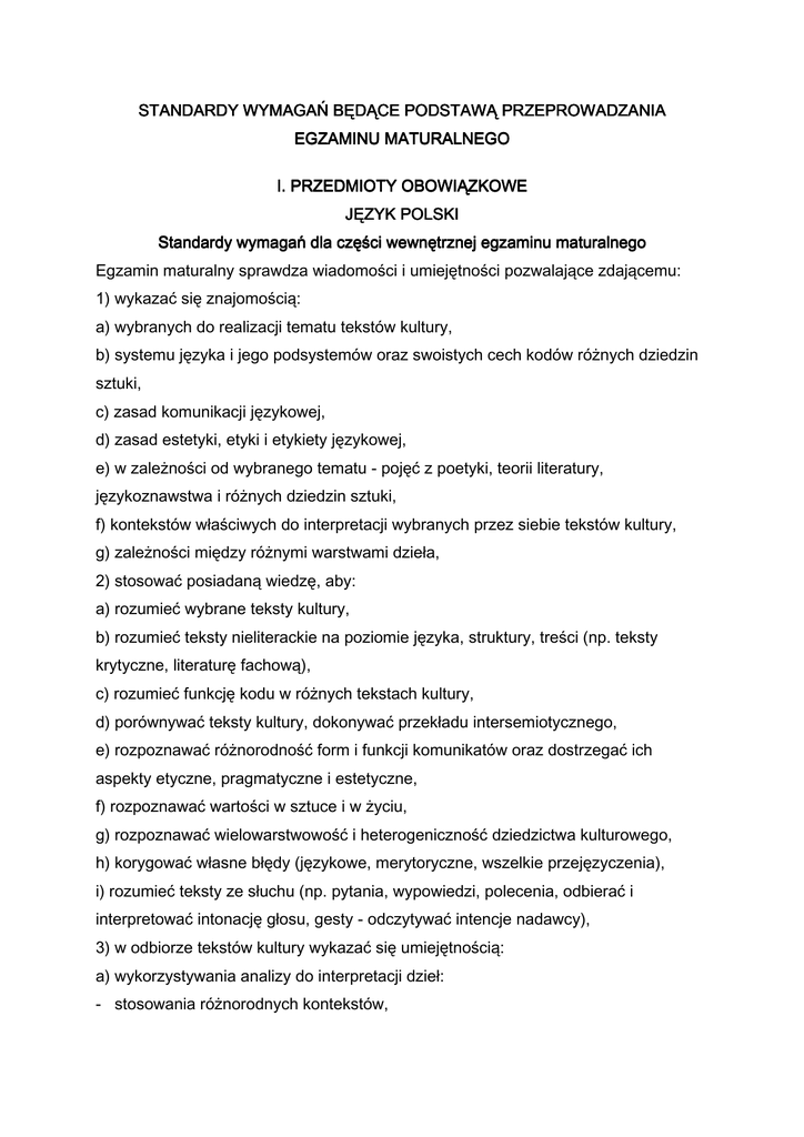 STANDARDY WYMAGAŃ BĘDĄCE PODSTAWĄ PRZEPROWADZANIA EGZAMINU MATURALNEGO I. PRZEDMIOTY OBOWIĄZKOWE JĘZYK POLSKI Standardy wymagań dla części wewnętrznej egzaminu maturalnego Egzamin maturalny sprawdza wiadomości i umiejętności pozwalające zdającemu: 1) wykazać się znajomością: a) wybranych do realizacji tematu tekstów kultury, b) systemu języka i jego podsystemów oraz swoistych cech kodów różnych dziedzin sztuki, c) zasad komunikacji językowej, d) zasad estetyki, etyki i etykiety językowej, e) w zależności od wybranego tematu - pojęć z poetyki, teorii literatury, językoznawstwa i różnych dziedzin sztuki, f) kontekstów właściwych do interpretacji wybranych przez siebie tekstów kultury, g) zależności między różnymi warstwami dzieła, 2) stosować posiadaną wiedzę, aby: a) rozumieć wybrane teksty kultury, b) rozumieć teksty nieliterackie na poziomie języka, struktury, treści (np. teksty krytyczne, literaturę fachową), c) rozumieć funkcję kodu w różnych tekstach kultury, d) porównywać teksty kultury, dokonywać przekładu intersemiotycznego, e) rozpoznawać różnorodność form i funkcji komunikatów oraz dostrzegać ich aspekty etyczne, pragmatyczne i estetyczne, f) rozpoznawać wartości w sztuce i w życiu, g) rozpoznawać wielowarstwowość i heterogeniczność dziedzictwa kulturowego, h) korygować własne błędy (językowe, merytoryczne, wszelkie przejęzyczenia), i) rozumieć teksty ze słuchu (np. pytania, wypowiedzi, polecenia, odbierać i interpretować intonację głosu, gesty - odczytywać intencje nadawcy), 3) w odbiorze tekstów kultury wykazać się umiejętnością: a) wykorzystywania analizy do interpretacji dzieł: - stosowania różnorodnych kontekstów, - stosowania fachowej terminologii, - wyboru metodologii, b) w interpretowaniu tekstów integrowania wiedzy z różnych obszarów polonistyki szkolnej, c) odróżniania własnych opinii i przeżyć od opinii autorytetów i przeżyć ponadindywidualnych, 4) wykazać się zastosowaniem wiadomości i umiejętności w planowaniu pracy i tworzeniu tekstów własnych, czyli: a) organizować warsztat pracy (gromadzić materiał, sporządzać bibliografię, notatki i przypisy, przygotowywać materiał ilustracyjny, korzystać z literatury fachowej, korzystać z różnych rodzajów i technik gromadzenia i przekazywania informacji: dokumentów, leksykonów, encyklopedii, baz danych, nagrań różnego typu, internetu, sporządzać bazy danych, korzystać z zapisu komputerowego i sporządzać taki zapis, sporządzać nagrania audio i wideo), b) posługiwać się sprawnie poprawną polszczyzną, przestrzegając zasad ortoepii i ortofonii, c) redagować wypowiedź w sposób zamierzony, przestrzegając treściowych i formalnych zasad organizacji tekstu, d) streszczać, parafrazować, cytować (powoływać się na cudze opinie), komentować, e) formułować hipotezy, planować ich rozwiązywanie, dobierać argumenty i je hierarchizować, selekcjonować materiał i porządkować go, porównywać, syntetyzować (scalać zebrane informacje w problemowe całości), wnioskować, f) formułować sądy na temat rozpoznawanych wartości i uzasadniać je, g) prezentować własne przeżycia wynikające z kontaktów ze sztuką, h) stosować środki retoryczne, i) uczestniczyć w różnych sytuacjach komunikacyjnych, np. wygłaszanie mowy, referatu, autoprezentacja, wystąpienie publiczne, uczestniczenie w dialogu, dyskusji, obrona własnego stanowiska. Standardy wymagań dla części zewnętrznej egzaminu maturalnego Egzamin maturalny sprawdza wiadomości i umiejętności pozwalające zdającemu: 1) wykazać się znajomością: Poziom podstawowy Poziom rozszerzony 1 2 a) tekstów kultury poznanych w szkole, a) jak na poziomie podstawowym, które są ważne dla poczucia a ponadto tekstów poznanych w procesie przynależności do wspólnoty ludzkiej samokształcenia, związków poznanych i poczucia tożsamości narodowej, np. tekstów z życiem narodu i wspólnoty klasyka polska i światowa ludzkiej b) języka jako narzędzia komunikacji, b) jak na poziomie podstawowym, podstawowych funkcji znaku językowego a ponadto swoistych cech kodów (komunikacyjna, ekspresywna, komunikacyjnych innych dziedzin sztuki, impresywna, poetycka) i cech kodów np. teatru, filmu, malarstwa, muzyki oraz komunikacyjnych innych dziedzin sztuki, środków służących etyce i estetyce np. teatru, filmu, malarstwa, etycznych języka i estetycznych aspektów języka c) podstawowych pojęć z poetyki, teorii c) jak na poziomie podstawowym, literatury i historii literatury, np. a ponadto pojęć takich jak: proces, konwencja literacka, prąd artystyczny, tradycja, pojęć z innych dziedzin sztuki rodzaj i gatunek literacki, dzieło literackie i jego wyróżniki, tematy, wątki, style d) ogólnych pojęć i zjawisk kulturowych d) jak na poziomie podstawowym, dawnych i współczesnych ważnych dla a ponadto zjawisk kulturowych ważnych zrozumienia dzieł dla zrozumienia epok dawnych i współczesności 2) stosować posiadaną wiedzę, aby: Poziom podstawowy Poziom rozszerzony 1 2 a) zrozumieć teksty kultury (literackie a) jak na poziomie podstawowym, i nieliterackie) poznane w toku nauki a ponadto zrozumieć teksty kultury szkolnej (literackie i nieliterackie) poznane w toku samokształcenia, porównywać teksty b) zrozumieć teksty użytkowe, np. pisma b) jak na poziomie podstawowym, urzędowe, teksty publicystyczne, a ponadto zrozumieć teksty naukowe popularnonaukowe, eseje i filozoficzne c) rozumieć funkcję środków językowych c) jak na poziomie podstawowym, w tekście a ponadto rozpoznawać charakterystyczne cechy języka i stylu utworów i gatunków literackich d) rozpoznawać różnorodność form d) jak na poziomie podstawowym, i funkcji komunikatów, dostrzegać a ponadto rozumieć zasady retorycznej etyczne, pragmatyczne i estetyczne organizacji tekstu aspekty komunikatów oraz rozpoznawać retoryczne środki