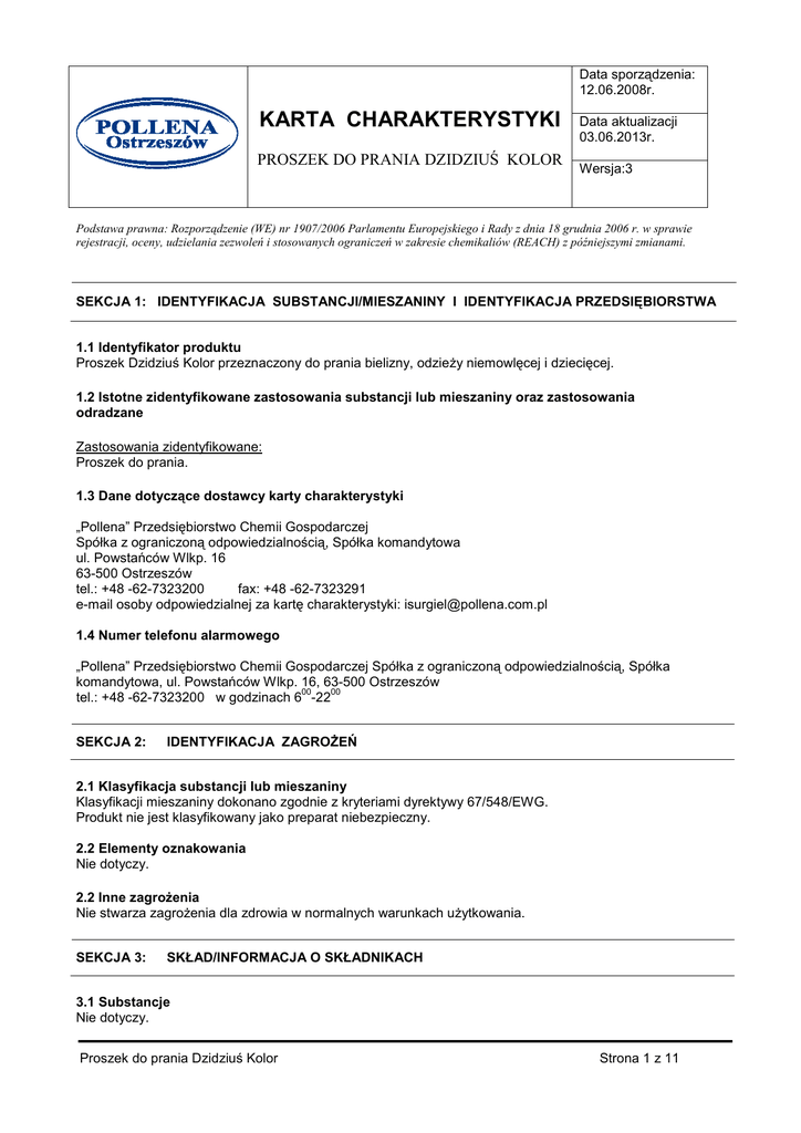 Data sporządzenia: 12.06.2008r. KARTA CHARAKTERYSTYKI PROSZEK DO PRANIA DZIDZIUŚ KOLOR Data aktualizacji 03.06.2013r. Wersja:3 Podstawa prawna: Rozporządzenie (WE) nr 1907/2006 Parlamentu Europejskiego i Rady z dnia 18 grudnia 2006 r. w sprawie rejestracji, oceny, udzielania zezwoleń i stosowanych ograniczeń w zakresie chemikaliów (REACH) z późniejszymi zmianami. SEKCJA 1: IDENTYFIKACJA SUBSTANCJI/MIESZANINY I IDENTYFIKACJA PRZEDSIĘBIORSTWA 1.1 Identyfikator produktu Proszek Dzidziuś Kolor przeznaczony do prania bielizny, odzieŜy niemowlęcej i dziecięcej. 1.2 Istotne zidentyfikowane zastosowania substancji lub mieszaniny oraz zastosowania odradzane Zastosowania zidentyfikowane: Proszek do prania. 1.3 Dane dotyczące dostawcy karty charakterystyki „Pollena” Przedsiębiorstwo Chemii Gospodarczej Spółka z ograniczoną odpowiedzialnością, Spółka komandytowa ul. Powstańców Wlkp. 16 63-500 Ostrzeszów tel.: +48 -62-7323200 fax: +48 -62-7323291 e-mail osoby odpowiedzialnej za kartę charakterystyki: [email protected] 1.4 Numer telefonu alarmowego „Pollena” Przedsiębiorstwo Chemii Gospodarczej Spółka z ograniczoną odpowiedzialnością, Spółka komandytowa, ul. Powstańców Wlkp. 16, 63-500 Ostrzeszów 00 00 tel.: +48 -62-7323200 w godzinach 6 -22 SEKCJA 2: IDENTYFIKACJA ZAGROśEŃ 2.1 Klasyfikacja substancji lub mieszaniny Klasyfikacji mieszaniny dokonano zgodnie z kryteriami dyrektywy 67/548/EWG. Produkt nie jest klasyfikowany jako preparat niebezpieczny. 2.2 Elementy oznakowania Nie dotyczy. 2.2 Inne zagroŜenia Nie stwarza zagroŜenia dla zdrowia w normalnych warunkach uŜytkowania. SEKCJA 3: SKŁAD/INFORMACJA O SKŁADNIKACH 3.1 Substancje Nie dotyczy. Proszek do prania Dzidziuś Kolor Strona 1 z 11 Data sporządzenia: 12.06.2008r. KARTA CHARAKTERYSTYKI PROSZEK DO PRANIA DZIDZIUŚ KOLOR Data aktualizacji 03.06.2013r. Wersja:3 Podstawa prawna: Rozporządzenie (WE) nr 1907/2006 Parlamentu Europejskiego i Rady z dnia 18 grudnia 2006 r. w sprawie rejestracji, oceny, udzielania zezwoleń i stosowanych ograniczeń w zakresie chemikaliów (REACH) z późniejszymi zmianami. 3.2 Mieszaniny Klasyfikacja Nazwa składnika Alkilobenzenosulfonian sodu Nr WE - Alkohole, C9-11, rozgałęzione i liniowe, etoksylowane 520 TE Węglan sodu 207-838-8 Metakrzemian sodu 229-912-9 Nr CAS % 67/548/EWG 68411-30-3 <6 Xn; R22 Xi; R38/41 160901-09-7 (68439-46-3) <2 Xn; R22 Xi; R41 497-19-8 10213-79-3 < 20 <2 Xi; R36 C;R34, Xi; R37 Rozporządzenie (WE) Nr 1272/2008 (CLP) Acute Tox. 4, H302 Eye Damage1, H318 Skin Irrit 2, H315 Acute Tox. 4,H302 Eye Dam. 1,H318 Skin Irrit 2, H319 Skin Corr. 1B, H314 STOT SE 3. H335 Met. Corr.1, H290 Pełen tekst zwrotów R i H przytoczony został w sekcji 16 karty. SEKCJA 4: ŚRODKI PIERWSZEJ POMOCY 4. PIERWSZA POMOC 4.1. Opis środków pierwszej pomocy W kontakcie z oczami: Przemywać intensywnie bieŜącą wodą przez co najmniej 15 minut przy odwiniętych powiekach. Unikać silnego strumienia wody, gdyŜ grozi to uszkodzeniem rogówki. Zapewnić pomoc okulisty. W kontakcie ze skórą: Skórę zmyć wodą. Skontaktować się z lekarzem w przypadku utrzymującego się podraŜnienia. W przypadku spoŜycia: Płukać usta wodą ( tylko wtedy, gdy osoba poszkodowana jest przytomna). Nie wywoływać wymiotów. Wezwać lekarza, pokazać opakowanie. Po naraŜeniu inhalacyjnym: Wyprowadzić na świeŜe powietrze. W przypadku niepokojących dolegliwości skonsultować się z lekarzem. 4.2. NajwaŜniejsze ostre i opóźnione objawy oraz skutki naraŜenia W wyniku kontaktu z oczami NaraŜenie na stęŜenie w powietrzu powyŜej wymaganych lub zalecanych dopuszczalnych stęŜeń moŜe powodować podraŜnienie oczu. W przypadku kontaktu z oczami zaleca się przemycie oczu. W przypadku naraŜenia skóry Nie stwierdzono, ewentualne podraŜnienia skórne w zaleŜności od stopnia ekspozycji mogą być łagodne do umiarkowanych. Proszek do prania Dzidziuś Kolor Strona 2 z 11 Data sporządzenia: 12.06.2008r. KARTA CHARAKTERYSTYKI PROSZEK DO PRANIA DZIDZIUŚ KOLOR Data aktualizacji 03.06.2013r. Wersja:3 Podstawa prawna: Rozporządzenie (WE) nr 1907/2006 Parlamentu Europejskiego i Rady z dnia 18 grudnia 2006 r. w sprawie rejestracji, oceny, udzielania zezwoleń i stosowanych ograniczeń w zakresie chemikaliów (REACH) z późniejszymi zmianami. Po spoŜyciu Brak danych o niepoŜądanych skutkach. MoŜe nastąpić podraŜnienie przewodu pokarmowego. Mogą wystąpić opóźnione objawy ze strony przewodu pokarmowego, np. ból brzucha, nudności. Po naraŜeniu inhalacyjnym NaraŜenie na stęŜenie w powietrzu powyŜej wymaganych lub zalecanych dopuszczalnych stęŜeń moŜe działać draŜniąco. 4.3. Wskazania dotyczące wszelkiej natychmiastowej pomocy lekarskiej i szczególnego postępowania z poszkodowanym Na skutek naraŜenia i w przypadku wystąpienia objawów naraŜenia naleŜy skontaktować się z lekarzem. Decyzję o sposobie postępowania ratunkowego podejmuje lekarz po dokładnej ocenie stanu poszkodowanego. SEKCJA 5: POSTĘPOWANIE W PRZYPADKU POśARU 5.1. Środki gaśnicze Odpowiednie środki gaśnicze: Woda, piana, proszek gaśniczy, CO2. Niewłaściwe środki gaśnicze: Zwarty strumień wody - niebezpieczeństwo rozprzestrzenienia poŜaru. 5.2.Szczególne zagroŜenia związane z substancją lub mieszaniną. W środowisku poŜaru mogą wydzielać się toksyczne dymy zawierające tlenki węgla, tlenki siarki, azotu i inne niezidentyfikowane produkty rozkładu. Unikać wdychania produktów spalania, mogą stwarzać zagroŜenie dla zdrowia. 5.3. Informacje dla straŜy poŜarnej Podczas gaszenia poŜaru naleŜy stosować indywidualne środki ochrony osobistej, tj: odzieŜ ochronną, obuwie i rękawice ochronne, ochronę twarzy, oczu i dróg oddechowych. Usunąć opakowania z mieszaniną z miejsca naraŜenia. SEKCJA 6: POSTĘPOWANIE W PRZYPADKU NIEZAMIERZONEGO UWOLNIENIA DO ŚRODOWISKA 6.1. Indywidualne środki ostroŜności, wyposaŜenie ochronne i procedury w sytuacjac