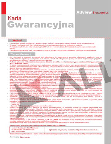 Karta Gwarancyjna Ważne! Przy zakupie, sprawdź integralność i wygląd produktu. Każda przyszła skarga w tej sprawie nie będzie brana pod uwagę. W czasie trwania gwarancji, klient zobowiązany jest do zachowania oryginalnego opakowania produktu. Podczas zimnych okresów roku, zakupiony produkt musi być chroniony przed aklimatyzacją otoczenia przez co najmniej 24 godziny. Podczas zimnych okresów roku, korzystanie z urządzenia w niskich temperaturach zmniejsza żywotność jego akumulatora. Warunki Gwarancji Aby skorzystać z gwarancji, konsument jest zobowiązany do przestrzegania warunków eksploatacji urządzenia, oraz do niedopuszczenia ingerencji w urządzenie osób trzecich, innych niż autoryzowane punkty serwisowe. W przeciwnym przypadku, sprzedawca jest zwolniony z wszelkich stosunków gwarancji. Podczas zgłaszania reklamacji na niepoprawne działanie produktu, klient zobowiązany jest przedstawić kartę gwarancyjną wraz z dowodem zakupu. W czasie trwania gwarancji usługi serwisowe są bezpłatne (zapisane na tylnej stronie karty gwarancyjnej). Po zakończeniu okresu gwarancji usługi serwisowe będą płatne. Okres gwarancji zostanie przedłużony o czas, który minął od momentu zgłoszenia usterki do serwisu, do czasu jego całkowitej naprawy. W przypadku, gdy Gwarancja nie obejmuje produktu lub usterki, która wymaga usunięcia, firma Allview Electronics Sp. z o.o. ma prawo naliczyć opłaty za naprawę lub wymianę Produktu oraz opłatę manipulacyjną. W przypadku awarii urządzenia, która jest wynikiem normalnych warunków jego użytkowania, klient ma pewność, że w okresie gwarancyjnym funkcje produktu bezpłatnie zostaną w pełni przywrócone. Aby zlokalizować punkty serwisowe możesz zwrócić się do jednostki, w której zakupiono urządzenie lub na adres podany w niniejszym dokumencie. W przypadku produktów, które zostały zakupione w internecie, kupujący ma prawo do zwrotu towaru w ciągu 10 dni, bez dodatkowych opłat I bez podawania przyczyny. Jedyny koszt jaki poniesie kupujący to koszt przesyłki zwrotnej produktu. Koszty refundacji są obsługiwane przez kupującego i będą pobrane z kwoty, która powinna zostać zwrócona w ciągu maksymalnie 30 dni. W ciągu 14 dni kupujący jest zobowiązany zwrócić sprzęt w stanie niezmienionym. Dostawca nie gwarantuje, że aplikacje produktu będą spełniać Twoje wymagania techniczne, oraz że będą one kompatybilne ze sprzętem i oprogramowaniem dostarczonym przez podmioty trzecie. Ponadto, że będą pracować bez zakłóceń, bez błędów, lub tego, że ewentualne uszkodzenia będą możliwe do naprawy. W przypadku produktów wymagających ponownego wgrania oprogramowania, klient wyraża zgodę na usunięcie wszystkich danych przechowywanych w jego pamięci (obrazów, muzyki, kontaktów, zainstalowanych aplikacji itp.) oraz nie może domagać się odszkodowania za ich utratę lub szkody powstałe ich usunięciem. Przed oddaniem urządzenia do serwisu gwarancyjnego w celu naprawy zalecamy utworzyć kopię zapasową informacji i danych zapisanych na jego dyskach, ponieważ czynności wykonane przez serwis gwarancyjny spowodują usunięcie danych z urządzenia. Wyświetlacz, który ma od 1 (jednego) do 4 (czterech) martwych pikseli, nie jest rozpatrywany jako wadliwy, zgodnie z międzynarodową normą jakości ISO 13406-2 klasa II. Czas pracy urządzenia na akumulatorze (bez ładowania) zależy ściśle od sposobu użytkowania urządzenia. Czynnikami, które najbardziej redukują czas pracy akumulatora urządzenia bez ładowania są: • Jasność ekranu • Funkcja 3G • Używanie Wi-Fi (szczególnie strumieniowanie multimediów) Allview Electronics Sp. z o.o. deklaruje na własną odpowiedzialność, że zakupiony produkt nie posiada jakichkolwiek wad materiałowych lub funkcjonalnych. Wszelkie skargi konsumenta będą rozwiązywane w możliwie jak najkrótszym czasie, nieprzekraczającym 30 dni od daty przyjęcia urządzenia do serwisu. Termin ten może ulec wydłużeniu w przypadku, gdy wymagane będzie importowanie części do naprawy urządzenia. Niniejszy dokument stanowi certyfikat prawny świadczący o spełnieniu przez dostarczony produkt warunków jakościowych, zgodnie z jego przeznaczeniem. Informacje związane z serwisem gwarancyjnym można uzyskać w sklepie, gdzie produkt został zakupiony, w jednym z serwisów gwarancyjnych widocznych poniżej, za pomocą telefonicznej infolinii klienta dostarczonej przez producenta lub przez stronę internetową www.allviewmobile.pl Allview Electronics Sp. z o.o. oferuje Gwarancję DOOR TO DOOR, aby skorzystać z niej skontaktuj się z naszym konsultantem wysyłając wiadomość e-mail na adres: [email protected] Wszelkie informacje dotyczące procedury reklamacji produktów Allview dostępne są na stronie www.allviewmobile.pl Autoryzowany serwis gwarancyjny dla telefonów komórkowych i tabletów: Jarkom-Serwis Jarosław Makowski ul. Biskupia 4B, 50-148 Wrocław (+48) 603-333-444 Zgłoszenia przyjmujemy na stronie: http://ticket.allviewmobile.pl Wszelkie informacje kontaktowe z marką Allview Electronics dostępne są na stronie internetowej firmy: http://www.allviewmobile.pl Kupon Karty Gwarancyjnej: Kupon numer 1: Jednostka serwisowa Kupon numer 1: Jednostka serwisowa Kupon numer 1: Jednostka serwisowa Marka Marka Marka Model Model Model Seria Seria Seria Data zakupu Data zakupu Data zakupu Zauważona usterka Zauważona usterka Zauważona usterka Imię i nazwisko klienta Imię i nazwisko klienta Imię i nazwisko klienta Numer telefonu Numer telefonu Numer telefonu Data decyzji Data decyzji Data decyzji Podpis klienta Podpis klienta Podpis klienta Karta Gwarancyjna Autoryzowany dealer Producent Produkt Firma Podpis/Pieczątka Marka Adres Informacje o produkcie Specyfikacje produktu Data sprzedaży: Model Seria Gwarancja na produkt Podpis/Pieczątka wynosi Numer rachunku Numer kuponu 1 Klient Numer kuponu 1 Klient 24 miesiące Numer kupon