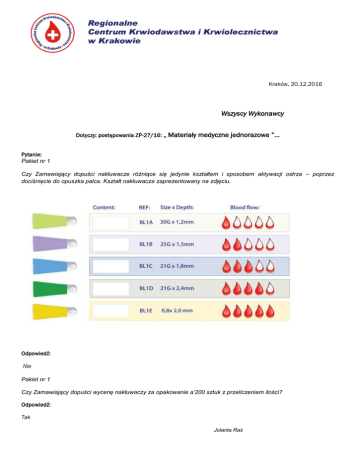 Kraków, 20.12.2016 Wszyscy Wykonawcy Dotyczy: postępowania ZP-27/16: ,, Materiały medyczne jednorazowe ”… Pytanie: Pakiet nr 1 Czy Zamawiający dopuści nakłuwacze różniące się jedynie kształtem i sposobem aktywacji ostrza – poprzez dociśnięcie do opuszka palca. Kształt nakłuwacza zaprezentowany na zdjęciu. Odpowiedź: Nie Pakiet nr 1 Czy Zamawiający dopuści wycenę nakłuwaczy za opakowanie a’200 sztuk z przeliczeniem ilości? Odpowiedź: Tak Jolanta Raś