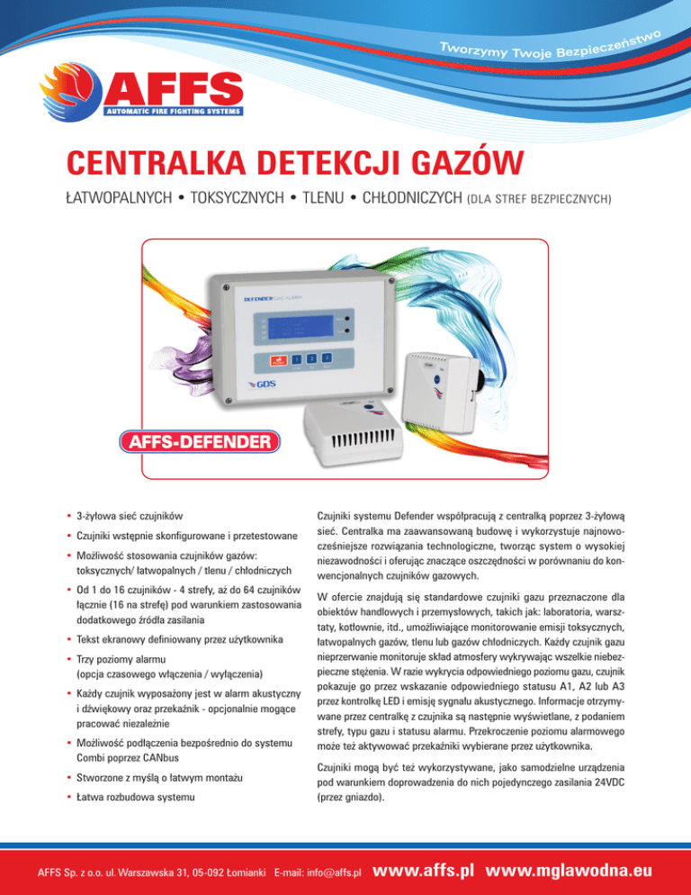 Tworzym y ze Twoje Bezpiec o ństw CENTRALKA DETEKCJI GAZÓW ŁATWOPALNYCH • TOKSYCZNYCH • TLENU • CHŁODNICZYCH (DLA STREF BEZPIECZNYCH) AFFS-DEFENDER • 3-żyłowa sieć czujników • Czujniki wstępnie skonfigurowane i przetestowane • Możliwość stosowania czujników gazów: toksycznych/ łatwopalnych / tlenu / chłodniczych • Od 1 do 16 czujników - 4 strefy, aż do 64 czujników łącznie (16 na strefę) pod warunkiem zastosowania dodatkowego źródła zasilania • Tekst ekranowy definiowany przez użytkownika • Trzy poziomy alarmu (opcja czasowego włączenia / wyłączenia) • Każdy czujnik wyposażony jest w alarm akustyczny i dźwiękowy oraz przekaźnik - opcjonalnie mogące pracować niezależnie • Możliwość podłączenia bezpośrednio do systemu Combi poprzez CANbus • Stworzone z myślą o łatwym montażu • Łatwa rozbudowa systemu Czujniki systemu Defender współpracują z centralką poprzez 3-żyłową sieć. Centralka ma zaawansowaną budowę i wykorzystuje najnowocześniejsze rozwiązania technologiczne, tworząc system o wysokiej niezawodności i oferując znaczące oszczędności w porównaniu do konwencjonalnych czujników gazowych. W ofercie znajdują się standardowe czujniki gazu przeznaczone dla obiektów handlowych i przemysłowych, takich jak: laboratoria, warsztaty, kotłownie, itd., umożliwiające monitorowanie emisji toksycznych, łatwopalnych gazów, tlenu lub gazów chłodniczych. Każdy czujnik gazu nieprzerwanie monitoruje skład atmosfery wykrywając wszelkie niebezpieczne stężenia. W razie wykrycia odpowiedniego poziomu gazu, czujnik pokazuje go przez wskazanie odpowiedniego statusu A1, A2 lub A3 przez kontrolkę LED i emisję sygnału akustycznego. Informacje otrzymywane przez centralkę z czujnika są następnie wyświetlane, z podaniem strefy, typu gazu i statusu alarmu. Przekroczenie poziomu alarmowego może też aktywować przekaźniki wybierane przez użytkownika. Czujniki mogą być też wykorzystywane, jako samodzielne urządzenia pod warunkiem doprowadzenia do nich pojedynczego zasilania 24VDC (przez gniazdo). AFFS Sp. z o.o. ul. Warszawska 31, 05-092 Łomianki E-mail: [email protected] www.affs.pl www.mglawodna.eu Centralka Czujnik Zasilanie 115/230VAC i/lub 24VDC ± 15% Częstotliwość 50/60 Hz Pobór prądu 3 Waty Kontrolki GAZY CHŁODNICZE - półprzewodnikowy, CO2 - podczerwieni Zasilanie 1 do 64 (4 strefy po 16 czujników) po zastosowaniu dodatkowego zasilacza Alarm Usterka Przekaźniki alarmowe od 18 do 30VDC Pobór prądu 1,2 W Przekaźnik alarmowy 1 SPCO 3A@230VAC, Zbiorczy alarm A1/A2/A3 Czerwony LED / sygnał akustyczny opcjonalnie tylko A2/A3 Wyświetlanie tekstu A1, A2, A3 normalnie pod napięciem / normalnie bez napięcia, zatrzaskowe/nie zatrzaskowe Pomarańczowy LED / sygnał akustyczny Wyświetlanie tekstu Flt (od ang. Fault - usterka) Kabel czujników GAZY ŁATWOPALNE - katalityczny, GAZY TOKSYCZNE, TLEN – elektrochemiczny, Listwa przyłączeniowa 1 do 16 standardowo czujników Nie stosować w atmosferach zagrożonych wybuchem Typ czujnika Kontrolki Zasilanie (zielony LED) Wyświetlacz jak wyżej + 4 wiersze tekstu użytkownika Alarm gazu - zielony LED zmienia kolor na czerwony 3-żyłowy 1 mm2 A1 - miga powoli Długość kabla - maks. 200m, x 4 A2 - miga szybko Cztery przekaźniki do wyboru S.P.C.O 3A na napięcie 230 VAC normalnie pod napięciem / normalnie bez napięcia, zatrzaskowe / nie zatrzaskowe A3 - świeci światłem ciągłym Opcja: Przekaźniki dla stref A1/A2/A3 lub A2/A3 lub Sygnały zbiorcze (dla wszystkich stref) Przekaźnik 1 – dowolny alarm A1 Usterka - pomarańczowy Temperatura otoczenia Praca od -5 do 50°C Przechowywanie: od +5 do +55°C Ochrona Czujniki standardowe - IP42 Czujniki wodoodporne - IP65 Przekaźnik 2 - dowolny alarm A2 Przekaźnik 3 - dowolny alarm A3 Wymiary Czujniki standardowe dł. 83mm x wys. 83mm x głęb. 36mm Opcje Sonda czujnika kanałowego - dł. 27mm x średnica. 28mm Czujniki wodoodporne dł. 145mm x wys. 145mm x głęb. 60mm Przekaźnik 4 – dowolna Usterka Dodatkowe opcje przekaźników Blokada przekaźników: Dostęp na przedniej ściance Temperatura otoczenia: Praca od -5 do +50°C Opcje czujników Przechowywanie: od +5 do +55°C Ochrona IP65 Waga 920 g Wymiary Dł. 200mm x wys. 150mm x głęb. 80mm Montaż natynkowy – wersja standardowa Montaż z sondą podtynkową Zastosowania czujników Defender Montaż natynkowy – wykonanie wodoszczelne MULTI AU AUTO TO ENVIRONMENTAL EDUCATION BREW CHARGE DRINK AIR DENTAL Montaż podtynkowy (sonda) – wykonanie wodoszczelne Akcesoria umożliwiające podłączenie do systemu Combi Tablica wskaźników statusu MEDICAL CAR PARK POOL Zasilacz czujników PLANT KITCHEN LAB BIO AGRICULTURE HORTICULTURE COOL GAS OFFICE Zasilacz Defender 2,5A@24VDC dla czujników od 16 do 35 szt Zasilacz GDS703, prąd 11A@24VDC dla ponad 35 czujników