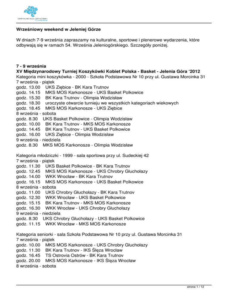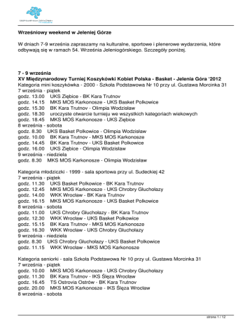 Wrześniowy weekend w Jeleniej Górze W dniach 7-9 września zapraszamy na kulturalne, sportowe i plenerowe wydarzenia, które odbywają się w ramach 54. Września Jeleniogórskiego. Szczegóły poniżej. 7 - 9 września XV Międzynarodowy Turniej Koszykówki Kobiet Polska - Basket - Jelenia Góra ‘2012 Kategoria mini koszykówka - 2000 - Szkoła Podstawowa Nr 10 przy ul. Gustawa Morcinka 31 7 września - piątek godz. 13.00 UKS Ziębice - BK Kara Trutnov godz. 14.15 MKS MOS Karkonosze - UKS Basket Polkowice godz. 15.30 BK Kara Trutnov - Olimpia Wodzisław godz. 18.30 uroczyste otwarcie turnieju we wszystkich kategoriach wiekowych godz. 18.45 MKS MOS Karkonosze - UKS Ziębice 8 września - sobota godz. 8.30 UKS Basket Polkowice - Olimpia Wodzisław godz. 10.00 BK Kara Trutnov - MKS MOS Karkonosze godz. 14.45 BK Kara Trutnov - UKS Basket Polkowice godz. 16.00 UKS Ziębice - Olimpia Wodzisław 9 września - niedziela godz. 8.30 MKS MOS Karkonosze - Olimpia Wodzisław Kategoria młodziczki - 1999 - sala sportowa przy ul. Sudeckiej 42 7 września - piątek godz. 11.30 UKS Basket Polkowice - BK Kara Trutnov godz. 12.45 MKS MOS Karkonosze - UKS Chrobry Głuchołazy godz. 14.00 WKK Wrocław - BK Kara Trutnov godz. 16.15 MKS MOS Karkonosze - UKS Basket Polkowice 8 września - sobota godz. 11.00 UKS Chrobry Głuchołazy - BK Kara Trutnov godz. 12.30 WKK Wrocław - UKS Basket Polkowice godz. 15.15 BK Kara Trutnov - MKS MOS Karkonosze godz. 16.30 WKK Wrocław - UKS Chrobry Głuchołazy 9 września - niedziela godz. 8.30 UKS Chrobry Głuchołazy - UKS Basket Polkowice godz. 11.15 WKK Wrocław - MKS MOS Karkonosze Kategoria seniorki - sala Szkoła Podstawowa Nr 10 przy ul. Gustawa Morcinka 31 7 września - piątek godz. 10.00 MKS MOS Karkonosze - UKS Chrobry Głuchołazy godz. 11.30 BK Kara Trutnov - IKS Ślęza Wrocław godz. 16.45 TS Ostrovia Ostrów - BK Kara Trutnov godz. 20.00 MKS MOS Karkonosze - IKS Ślęza Wrocław 8 września - sobota strona 1 / 12 godz. 12.00 UKS Chrobry Głuchołazy - TS Ostrovia Ostrów godz. 13.30 BK Kara Trutnov - MKS MOS Karkonosze godz. 17.30 BK Kara Trutnov - UKS Chrobry Głuchołazy godz. 19.00 IKS Ślęza Wrocław - TS Ostrovia Ostrów 9 września - niedziela godz. 10.30 UKS Chrobry Głuchołazy - IKS Ślęza Wrocław godz. 12.00 MKS MOS Karkonosze - TS Ostrovia Ostrów Międzyszkolny Klub Sportowy Międzyszkolnego Ośrodka Sportu „Karkonosze” Jelenia Góra *** 7 września - piątek X Wystawa Produktów Regionalnych „Wyprodukowano pod Śnieżką” pod patronatem Prezydenta Miasta Jeleniej Góry; w wystawie weźmie udział około 60 firm produkcyjnych, rzemieślniczych i handlowych z regionu jeleniogórskiego i z Czech, powiat Jablonec nad Nysą; podczas wystawy zostanie przeprowadzony konkurs na „Najciekawszy Produkt Karkonoski” oraz „Karkonoski Produkt Spożywczy”; przyznane zostaną nagrody „Jelonki Karkonoskie”; po raz pierwszy wystawę poprzedzi konkurs na „Projekt pamiątki regionalnej Karkonoszy i Gór Izerskich”, która służyć będzie promocji regionu oraz stanowić atrakcyjny upominek dla turystów; elementem innowacyjnym wystawy będą prezentacje tzw. ginących zawodów zarówno polskich jak i czeskich; podczas wystawy degustacja wyrobów gastronomicznych; w programie występy czeskich i polskich zespołów muzycznych; więcej na stronie www.karr.pl godz. 11.00-18.00 na Placu Ratuszowym Karkonoska Agencja Rozwoju Regionalnego S.A. *** Festiwal Muzyki Teatralnej - muzyka Pawła Mykietyna; koncert w wykonaniu: Maciej Grzybowski - fortepian, dyrygent, Agata Zubel - śpiew, z towarzyszeniem Orkiestry Symfonicznej Filharmonii Dolnośląskiej; w programie: Preludia, Epifora (z tekstem i recytacją Redbada Klynstry na CD), Sonety Szekspira, 3 dla 13 - godz. 19.00 w sali koncertowej przy ul. Józefa Piłsudskiego 60 (bilety w cenie 20 zł, 10 zł) Filharmonia Dolnośląska, Stowarzyszenie „Teatr Cinema” *** spektakl „Sługa dwóch panów” Peter Turrini, reżyseria Henryk Adamek, scenografia Wojciech Jankowiak, kostiumy Marta Hubka, muzyka Rafał Smoleń - godz. 19.00 na dużej scenie Teatru przy al. Wojska Polskiego 38 (bilet normalny 30 zł, ulgowy 20 zł, więcej na www.teatrnorwida.pl) W swojej swobodnej adaptacji komedii dell’arte Carla Goldoniego pod tym samym tytułem, Peter Turrini przenosi akcję w lata dwudzieste XX wieku. Bohaterowie to przedsiębiorcy, zajmujący się jakimiś podejrzanymi interesami. Wśród nich pojawia się, wracający z wojny Żołnierz-Arlekin. Nie jest to, jakbyśmy się mogli spodziewać, skory do niewybrednych żartów strona 2 / 12 wesołek. To zmęczony i głodny, szukający jakiegokolwiek zajęcia weteran wojenny. Zostaje sługą dwóch panów ... (info z teatru) Miasto Jelenia Góra, Teatr im. Cypriana Kamila Norwida *** 8 - 13 września Silesia Art Biennale „Outside in inside out”; założenia Biennale oparte są na koncepcji wejścia sztuki w przestrzeń publiczną czterech miast Dolnego Śląska; projekt składa się z działań efemerycznych (performance, akcja, panele dyskusyjne), stałych - obiekty, murale, instalacje wpisane w przestrzenie miejskie oraz społecznych (ankietowanie, działania ze społecznościami, inne); w Jeleniej Górze projekty artystyczne zrealizują: Tomasz Opania „Hi Honey”, Anka Leśniak SUR-REALIZACJE. Chciałam tylko latać”, Paulina Braun „The Cables" i Małgorzata Kazimierczak „Konfrontacje mentalne - pomiędzy miejscem i czasem”. Odbędą się także spotkania i dyskusje panelowe - szczegóły jak niżej Miasto Jelenia Góra, Biuro Wystaw Artystycznych *** 8 - 9 września 41. Karkonoska Giełda Minerałów, Skał i Skamieniałości - godz. 9.00-17.00 na tarasie muzeum przy ul. Wolności 268 Impreza wpisana jest do kalendarza giełd organizowanych na terenie Polski i ma wyrobioną renomę. Corocznie uczestniczy w niej wielu wystawców, kolekcjonerów i zbieraczy z Polski i zagranicy. Podczas imprezy można podziwiać, oglądać i przede