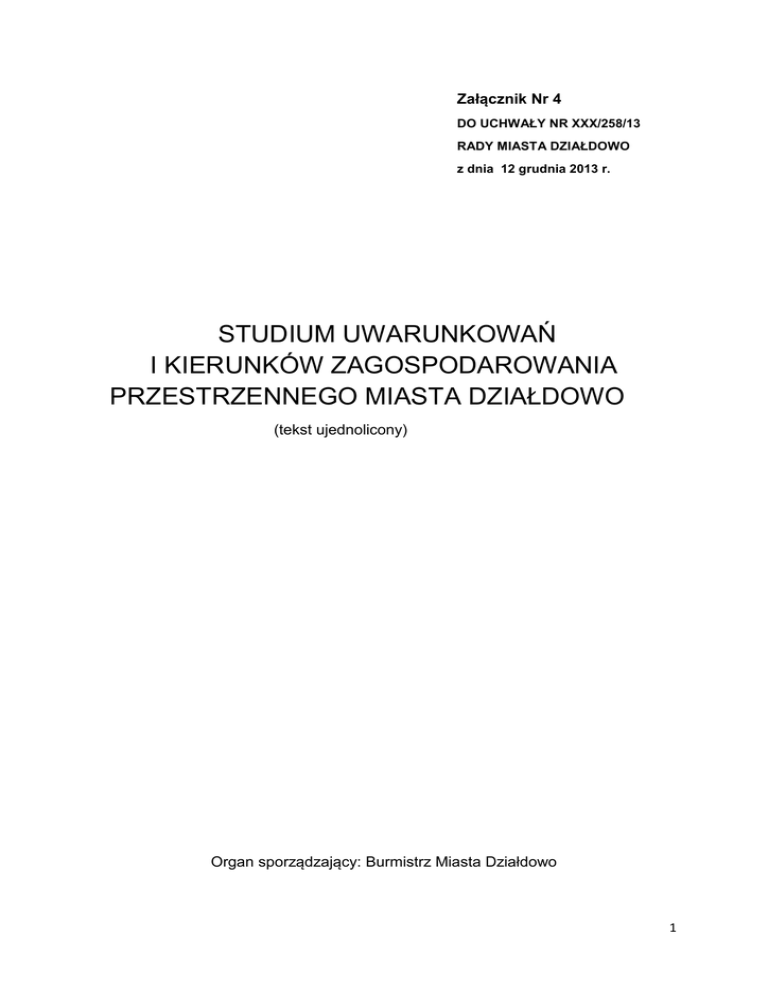 Załącznik Nr 4 DO UCHWAŁY NR XXX/258/13 RADY MIASTA DZIAŁDOWO z dnia 12 grudnia 2013 r. STUDIUM UWARUNKOWAŃ I KIERUNKÓW ZAGOSPODAROWANIA PRZESTRZENNEGO MIASTA DZIAŁDOWO (tekst ujednolicony) Organ sporządzający: Burmistrz Miasta Działdowo 1 SPIS TREŚCI A. Wprowadzenie B. Zakres zmian 1. Podstawowe uwarunkowania i kierunki rozwoju miasta 1.1. Uwarunkowania zewnętrzne 1.2. Uwarunkowania wewnętrzne 1.3. Funkcje miasta 1.4. Ludność 1.5. Przestrzeń miasta 1.6. Jednostki strukturalne 1.7. Strefy polityki przestrzennej 1.8. Określenie potrzeb w zakresie kształtowania przestrzeni publicznej 1.9 Tereny zamknięte 1.10. Standardy zagospodarowania terenów 2. Strefa przestrzeni przyrodniczych 2.1. Wody powierzchniowe 2.2. Lasy i zalesienia 2.3. Otwarte przestrzenie przyrodnicze 2.4. System terenów zieleni zorganizowanej 2.5. Parki i skwery jako enklawy 3. Strefa zabudowy mieszkaniowej i usługowej 3.1. Zabudowa jednorodzinna na dużych działkach 3.2. Zabudowa jednorodzinna z obiektami działalności gospodarczej 3.3. Zabudowa mieszkaniowa i usługowa 3.4. Rejony koncentracji usług lokalnych 3.5. Centralny obszar wielofunkcyjny 3.6. Nowe centrum miejskie 4. Strefa produkcji i składów 4.1. Przemysł, składy, bazy transportowe i budowlane 4.2. Usługi produkcyjne i hurtowe 5. Strefa rekreacji i sportu 5.1. Ogólnomiejskie centrum sportu 5.2. Lokalne ośrodki sportowe 5.3. Tereny rekreacji bez obiektów kubaturowych 5.4. Ogrody działkowe i rekreacyjne 2 5.5 Zagospodarowanie stref polityki przestrzennej 6. Ochrona i kształtowanie środowiska 6.1. Główny Zbiornik Wód Podziemnych Nr 214 „Działdowo” 6.2. Projektowany obszar chronionego krajobrazu 6.3. Korytarz ekologiczny o znaczeniu krajowym 6.4. Korytarze ekologiczne o znaczeniu lokalnym 6.5. Potencjalny użytek ekologiczny 6.6. Pomniki przyrody i ciągi drzew do ochrony 6.7. Ochrona wód powierzchniowych i podziemnych 6.8. Ochrona powietrza 6.9. Ochrona akustyczna 6.10. Potencjalne strefy zagrożenia sanitarnego 6.11. Zieleń izolacyjna 6.12. Nadzwyczajne zagrożenia środowiska 6.13 Zasady realizacji inwestycji 7. Ochrona i kształtowanie krajobrazu kulturowego 7.1. Strefy ochrony konserwatorskiej 7.2. Elementy tożsamości miasta 7.3. Obszary do rewitalizacji 7.4. Kierunki kształtowania architektury 7.5. Cmentarze 8. Rolnicza przestrzeń produkcyjna 9. Kierunki rozwoju komunikacji 9.1. Komunikacja kolejowa 9.2. Drogi tranzytowe 9.3. Podstawowy układ ulic miejskich 9.4. Komunikacja miejska 9.5. Zasady organizacji ruchu pieszego i rowerowego 9.6. Główne parkingi 9.7. Obiekty obsługi dróg 9.8. Zespoły garażowe 10. Kierunki rozwoju infrastruktury technicznej 10.1. Zaopatrzenie w wodę 10.2. Kanalizacja sanitarna 3 10.3. Kanalizacja deszczowa i melioracja 10.4. Elektroenergetyka 10.5. Zaopatrzenie w ciepło 10.6. Zaopatrzenie w gaz 10.7. Telekomunikacja 10.8. Gospodarka odpadami 10.9. Tereny dla kompleksowego uzbrojenia w I etapie 11. Kierunki działań w zakresie gospodarki gruntami 12. Podstawowe inwestycje celu publicznego w obszarze miasta 13. Obszary do sporządzania miejscowych planów zagospodarowania przestrzennego 14. Dokumenty, materiały archiwalne i kartograficzne oraz literatura WYKAZ RYSUNKÓW ZMIANY STUDIUM 1) Zmiana studium uwarunkowań i kierunków zagospodarowania przestrzennego w skali 1:5000 zastępujący w całości rysunek pierwotny. 2) Infrastruktura techniczna w skali 1:5000 – w wersji pierwotnej, nie objęty procedurą zmian. 4 A. Wprowadzenie STUDIUM UWARUNKOWAŃ I KIERUNKÓW ZAGOSPODAROWANIA PRZESTRZENNEGO określa politykę przestrzenną Rady Miejskiej w Działdowie. Ustalenia zawarte w STUDIUM są obowiązujące dla wszystkich struktur samorządu miasta i podległych jednostek w programowaniu przedsięwzięć i w bieżącej działalności. STUDIUM nie jest przepisem gminnym i nie stanowi podstawy do wydawania decyzji o warunkach zabudowy i zagospodarowania terenu. STUDIUM opracowano w oparciu o zasady określone w art. 6 ustawy z dnia 7 lipca 1994 r. o zagospodarowaniu przestrzennym (tekst jednolity Dz. U. z 1999 r. Nr 15 poz. 139 z późniejszymi zmianami). ZMIANY STUDIUM opracowano w oparciu o zasady określone w ustawie z dnia 27 marca 2003 r. o planowaniu i zagospodarowaniu przestrzennym (Dz. U. 2012 r. poz. 647, ze zm.). 1) Podstawą formalną opracowania zmiany Studium uwarunkowań i kierunków zagospodarowania przestrzennego miasta Działdowo z 2000 r. jest uchwała Rady Miasta Działdowo Nr XXXVI/338/06 z dnia 08.06.2006 r. Zakres zmian, które były podstawą podjęcia tej uchwały określa Burmistrz w piśmie z dnia 14.11.2006 r. Podstawą prawną zakresu i procedury opracowania jest aktualna ustawa z dnia 27 marca 2003 r. o planowaniu i zagospodarowaniu przestrzennym. Zmiana ustawy dotyczącej gospodarki przestrzennej spowodowała dodatkową potrzebę doprowadzenia do zgodności Studium z prawomocnym miejscowym planem zagospodarowania przestrzennego miasta z 2002 r. Dokumenty te opracowane były w oparciu o ustawę z dnia 7 lipca 1994 r. o zagospodarowaniu przestrzennym, która przyjmowała zasadę spójności planu ze studium. Ustawa z 2003 r. wprowadza zasadę zgodności planu ze studium. W związku z opracowywaną zmianą Studium doprowadzono do zgodności tych dokumentów. 2) ZMIANA STUDIUM UWARUNKOWAŃ I KIERUNKÓW ZAGOSPODAROWANIA PRZESTRZENNEGO MIASTA DZIAŁDOWO Uchwalonego przez Radę Miejską w Działdowie z dniu 29 czerwca 2000 r. uchwałą Nr XVII/249/2000, zmienionego uchwałą Nr IX/93/07 Rady Miasta Działdowo z dnia 13 września 2007 r., oraz uchwałą Nr XI/99/11 z dnia 10 listopada 2011 r. W części tekstowej Studium, ujednolicono czcionki, likwidując kursywę zmian wprowadzonych uchwałą Nr IX/93/07 Rady Miasta Działdowo z dnia 13 września 2007 r. Wprowadzono zmiany w zapisach pkt. 7 „Ochrona i kształtowanie krajobrazu kulturowego”, 9.7 „Obiekty obsługi dróg” oraz 10.7 „Telekomunikacja”. Integralną częścią zmian jest rysunek obszaru 