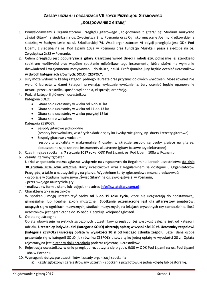 ZASADY UDZIAŁU I ORGANIZACJI VII EDYCJI PRZEGLĄDU GITAROWEGO „KOLĘDOWANIE Z GITARĄ” 1. Pomysłodawcami i Organizatorami Przeglądu gitarowego „Kolędowanie z gitarą” są: Studium muzyczne „Świat Gitary”, z siedzibą na os. Zwycięstwa 2i w Poznaniu oraz Ognisko muzyczne Joanny Kretkowskiej, z siedzibą w Suchym Lesie na ul. Szkółkarskiej 74. Współorganizatorem VI edycji przeglądu jest ODK Pod Lipami, z siedzibą na os. Pod Lipami 108a w Poznaniu oraz Fundacja Muzyka i pasja z siedzibą na os. Zwycięstwa 2/88 w Poznaniu. 2. Celem przeglądu jest popularyzacja gitary klasycznej wśród dzieci i młodzież y, pokazanie jej szerokiego spektrum możliwości oraz wspólne spotkanie miłośników tego instrumentu, które służyć ma wymianie doświadczeń i wzajemnemu motywowaniu do dalszej nauki. Profesjonalne jury będzie oceniać uczestników w dwóch kategoriach głównych: SOLO i ZESPOŁY. 3. Jury może wyłonić w każdej kategorii jednego laureata oraz przyznać do dwóch wyróżnień. Może również nie wyłonić laureata w danej kategorii przyznając wyłącznie wyróżnienia. Jury oceniać będzie opanowanie utworu przez uczestnika, sposób wykonania, ekspresję, aranżację. 4. Podział kategorii głównych uczestników: Kategoria SOLO: Gitara solo uczestnicy w wieku od 6 do 10 lat Gitara solo uczestnicy w wieku od 11 do 13 lat Gitara solo uczestnicy w wieku powyżej 13 lat Gitara solo z wokalem Kategoria ZESPOŁY: Zespoły gitarowe jednorodne (zespoły bez wokalisty, w których składzie są tylko i wyłącznie gitary, np. duety i tercety gitarowe) Zespoły gitarowe z wokalem (zespoły z wokalistą – maksymalnie 4 osoby; w składzie zespołu są osoby grające na gitarze, dopuszczalne są także inne instrumenty akustyczne (gitary basowe czy elektryczne) 5. Czas i miejsce spotkania: 7 stycznia 2017 roku, ODK Pod Lipami, os. Pod Lipami 108a w Poznaniu. 6. Zasady i terminy zgłoszeń Udział w spotkaniu można zgłaszać wyłącznie na załączonych do Regulaminu kartach uczestnictwa do dnia 30 grudnia 2016 roku włącznie. Karty uczestnictwa wraz z Regulaminem są dostępne u Organizatorów Przeglądu, a także u nauczycieli gry na gitarze. Wypełnione karty zgłoszeniowe można przekazywać: - osobiście w Studium muzycznym „Świat Gitary” na os. Zwycięstwa 2i w Poznaniu, - przez swojego nauczyciela gry - mailowo (w formie skanu lub zdjęcia) na adres [email protected] 7. Charakterystyka uczestników W spotkaniu mogą uczestniczyć osoby od 6 do 19 roku życia, które nie uczęszczają do podstawowej, gimnazjalnej lub licealnej szkoły muzycznej. Spotkanie przeznaczone jest dla gitarzystów amatorów, uczących się w ogniskach muzycznych, studiach muzycznych, na lekcjach prywatnych czy samodzielnie. Ilość uczestników jest ograniczona do 35 osób. Decyduje kolejność zgłoszeń. 8. Opłata rejestracyjna Opłata obowiązuje wszystkich zgłoszonych uczestników przeglądu. Jej wysokość zależna jest od kategorii udziału. Uczestnicy indywidualni (kategoria SOLO) uiszczają opłatę w wysokości 20 zł. Uczestnicy zespołowi (kategoria ZESPOŁY) uiszczają opłatę w wysokości 10 zł od każdego członka zespołu. Jeżeli dana osoba prezentuje się w kategorii SOLO, jak również ZESPOŁY uiszcza tylko jedną opłatę w wysokości 20 zł. Opłata rejestracyjna jest płatna w dniu przeglądu podczas rejestracji uczestników. 9. Rejestracja uczestników w dniu przeglądu rozpoczyna się o godz. 9:30 w ODK Pod Lipami na os. Pod Lipami 108a w Poznaniu. 10. Wymagania dotyczące uczestników i zasady organizacji spotkania a) Każdy zgłoszony i zarejestrowany uczestnik spotkania przygotowuje jedną kolędę lub pastorałkę. Kolędowanie z gitarą 2017 Strona 1 b) Przygotowanie w kategorii SOLO obejmuje znajomość utworu na pamięć i podczas prezentacji uczestnik nie może posiadać nut i słów utworu. c) Uczestnicy w kategorii ZESPOŁY mogą korzystać podczas prezentacji utworu z nut. d) Wokaliści solowi czy w zespołach wykonują utwory tylko w języku polskim. e) Każdy Uczestnik przeglądu jest zobowiązany do przygotowania i wykonania minimum 2 zwrotek utworu wraz z refrenami. f) Kolejność wykonywania utworów przez poszczególnych uczestników ustalają Organizatorzy. g) Lista z kolejnością prezentacji dostępna będzie po zamknięciu rejestracji uczestników w dniu spotkania czyli 7 stycznia 2017 roku. h) Uczestnicy mogą wykonywać utwory wyłącznie na gitarze klasycznej lub akustycznej z metalowymi i nylonowymi strunami. Do udziału nie dopuszcza się gitar elektroakustycznych, elektrycznych i basowych (po za udziałem w składzie zespołu). W kategorii ZESPOŁY mogą występować wyłącznie zespoły, w których składzie jest przynajmniej jedna gitara klasyczna. i) W kategorii „GITARA SOLO z wokalem” i w kategorii „ZESPOŁY Zespoły gitarowe z wokalem” ocenie przez JURY podlega zarówno śpiew jak i akompaniament gitarowy. W pozostałych kategoriach ocenie podlega umiejętność i ekspresja gry na gitarze. j) W kategorii „GITARA SOLO z wokalem” akompaniament musi być wykonany przez uczestnika, nie może być np. podkładem z płyty CD. k) Każdy Uczestnik może zgłosić swój udział w jednej kategorii SOLO oraz w jednej kategorii ZESPOŁY. 11. Program spotkania będzie dostępny po 3 stycznia 2017 roku na stronie www.swiatgitary.com.pl oraz u Organizatorów i Współorganizatorów. Kolędowanie z gitarą 2017 Strona 2