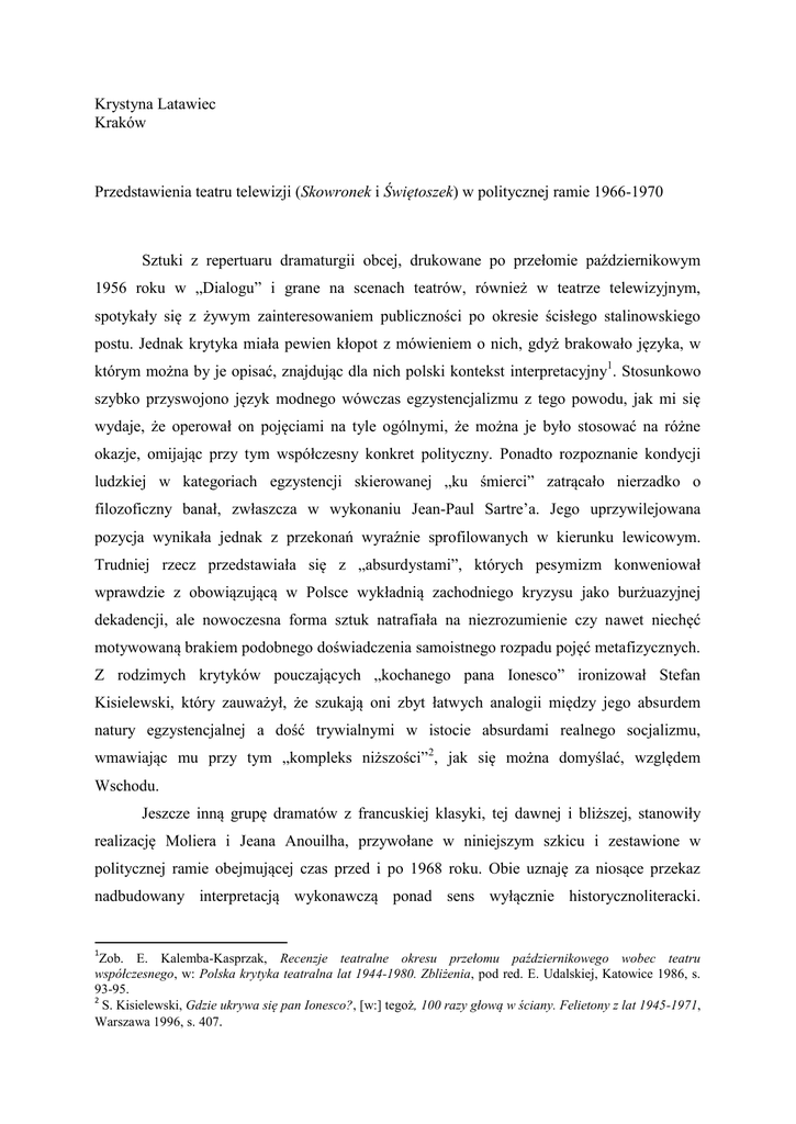 Krystyna Latawiec Kraków Przedstawienia teatru telewizji (Skowronek i Świętoszek) w politycznej ramie 1966-1970 Sztuki z repertuaru dramaturgii obcej, drukowane po przełomie październikowym 1956 roku w „Dialogu” i grane na scenach teatrów, również w teatrze telewizyjnym, spotykały się z żywym zainteresowaniem publiczności po okresie ścisłego stalinowskiego postu. Jednak krytyka miała pewien kłopot z mówieniem o nich, gdyż brakowało języka, w którym można by je opisać, znajdując dla nich polski kontekst interpretacyjny1. Stosunkowo szybko przyswojono język modnego wówczas egzystencjalizmu z tego powodu, jak mi się wydaje, że operował on pojęciami na tyle ogólnymi, że można je było stosować na różne okazje, omijając przy tym współczesny konkret polityczny. Ponadto rozpoznanie kondycji ludzkiej w kategoriach egzystencji skierowanej „ku śmierci” zatrącało nierzadko o filozoficzny banał, zwłaszcza w wykonaniu Jean-Paul Sartre’a. Jego uprzywilejowana pozycja wynikała jednak z przekonań wyraźnie sprofilowanych w kierunku lewicowym. Trudniej rzecz przedstawiała się z „absurdystami”, których pesymizm konweniował wprawdzie z obowiązującą w Polsce wykładnią zachodniego kryzysu jako burżuazyjnej dekadencji, ale nowoczesna forma sztuk natrafiała na niezrozumienie czy nawet niechęć motywowaną brakiem podobnego doświadczenia samoistnego rozpadu pojęć metafizycznych. Z rodzimych krytyków pouczających „kochanego pana Ionesco” ironizował Stefan Kisielewski, który zauważył, że szukają oni zbyt łatwych analogii między jego absurdem natury egzystencjalnej a dość trywialnymi w istocie absurdami realnego socjalizmu, wmawiając mu przy tym „kompleks niższości”2, jak się można domyślać, względem Wschodu. Jeszcze inną grupę dramatów z francuskiej klasyki, tej dawnej i bliższej, stanowiły realizację Moliera i Jeana Anouilha, przywołane w niniejszym szkicu i zestawione w politycznej ramie obejmującej czas przed i po 1968 roku. Obie uznaję za niosące przekaz nadbudowany interpretacją wykonawczą ponad sens wyłącznie historycznoliteracki. 1 Zob. E. Kalemba-Kasprzak, Recenzje teatralne okresu przełomu październikowego wobec teatru współczesnego, w: Polska krytyka teatralna lat 1944-1980. Zbliżenia, pod red. E. Udalskiej, Katowice 1986, s. 93-95. 2 S. Kisielewski, Gdzie ukrywa się pan Ionesco?, [w:] tegoż, 100 razy głową w ściany. Felietony z lat 1945-1971, Warszawa 1996, s. 407. Aktualizowane w konkretnym miejscu i czasie, w realiach ówczesnej polskiej geopolityki, mogą być czytane jako zapośredniczony w znakach teatralnych komentarz do napięć pomiędzy ośrodkami władzy (Skowronek), jak też głos w sprawie trudnych relacji miedzy artystą a polityką (Świętoszek). Przyjmuję zatem, że pokazane na forum telewizji publicznej sztuki były wyrazem poszukiwań przez ludzi teatru języka porozumienia z odbiorcą poza sztywną nowomową, nierzadko agresywną, na jaką natrafiamy w trakcie lektury wypowiedzi ówczesnych publicystów. W tamtych realiach artyści chętnie posługiwali się aluzją czy historycznym kostiumem, aby przemycić treści polityczne, choć nie w tym znaczeniu, jakie słowu temu nadała oficjalna propaganda, sprowadzając je do jednej dyktowanej odgórnie semantycznej monofonii. W teatralnej ekspresji polityczne znaczyło żywo obchodzące uczestników społecznej gry, nawet jeśli miała ona tak mocno jednokierunkowy przebieg jak w czasach PRL. Wystawianie francuskich klasyków oddalało też podejrzenie o „mieszanie się w bieżące sprawy polityczne”, gdyż byli to dramatopisarze z kręgu literatury obcej, więc na pozór neutralnej wobec frakcyjnych rozgrywek w Polsce późnych lat sześćdziesiątych. Po sztuki Anouilha teatr sięgał chętnie, czego dowodem liczne ich realizacje, począwszy od roku 1956 po końcówkę lat 60. Recenzencka opinia o Francuzie nie była jednoznacznie pozytywna. Marta Fik, pisząc o warszawskiej realizacji Becketta…(Teatr Powszechny, reż. Jan Maciejowski) w listopadzie 1969 roku, w dość mocnych słowach podsumowała jego twórczość, w której „banał ściga banał”, dialog obfituje w pensjonarskie „złote myśli”, słowem: „Pseudolekkość, pseudowdzięk, pseudoproblemy. I pseudofilozofia, czy raczej umiejętność przystępnej trawestacji modnych intelektualnych i politycznospołecznych teorii na użytek leniwej publiczności”3. Krytyczka dodaje , że w dramaturgii tej gustowały w latach 60. „głównie młode studentki polonistyki”. W tymże numerze „Teatru” (1970/3) Jerzy Niesiobędzki czyta propozycję teatru politycznego Anouilha przez analogię do egzystencjalizmu Sartre’a4, komentując, że nie było to nazbyt głębokie nawiązanie. Można domniemywać, że powaga, z jaką Sartre czy Camus traktowali mechanikę opresji bardziej odpowiadała polskiej krytyce niż francuski esprit autora Skowronka. Dramat został napisany i wystawiony w Theatre Montparnasse w roku paryskiej premiery Czekając na Godota (1953). Po polsku opublikowany w „Dialogu” trzy lata później, w tymże roku 1956 wystawiony (Sala Kongresowa, reż. Czesław Szpakowicz)5. Kolejne realizacje były w Szczecinie (57), Częstochowie (59), Łodzi (60), Nowej Hucie w 1966 i 3 M. Fik, „Beckett albo honor reżyserii, “Teatr” 1970, nr 3, s.13-14. J. Niesiobędzki, Anouilh – Szekspir – Anouilh, „Teatr” 1970, nr 3, s. 14-15. 5 Utrwalony przez PKF fragment tego widowiska wskazuje na hieratyczny styl wykonania, zwłaszcza że akcentuje udział sądu kościelnego i władzę inkwizytora. 4 tegoż roku 5 grudnia emisja w teatrze telewizji w reżyserii Jerzego Antczaka. Potem na prawie 30 lat Skowronek znika z polskich teatrów. Zatem przedstawienie telewizyjne, o którym będzie tu mowa, jest ostatnim przed tą przerwą, zamyka więc pewien etap w recepcji sztuki. Po 1968 roku uschematyzowany obraz historii zdaje się nu