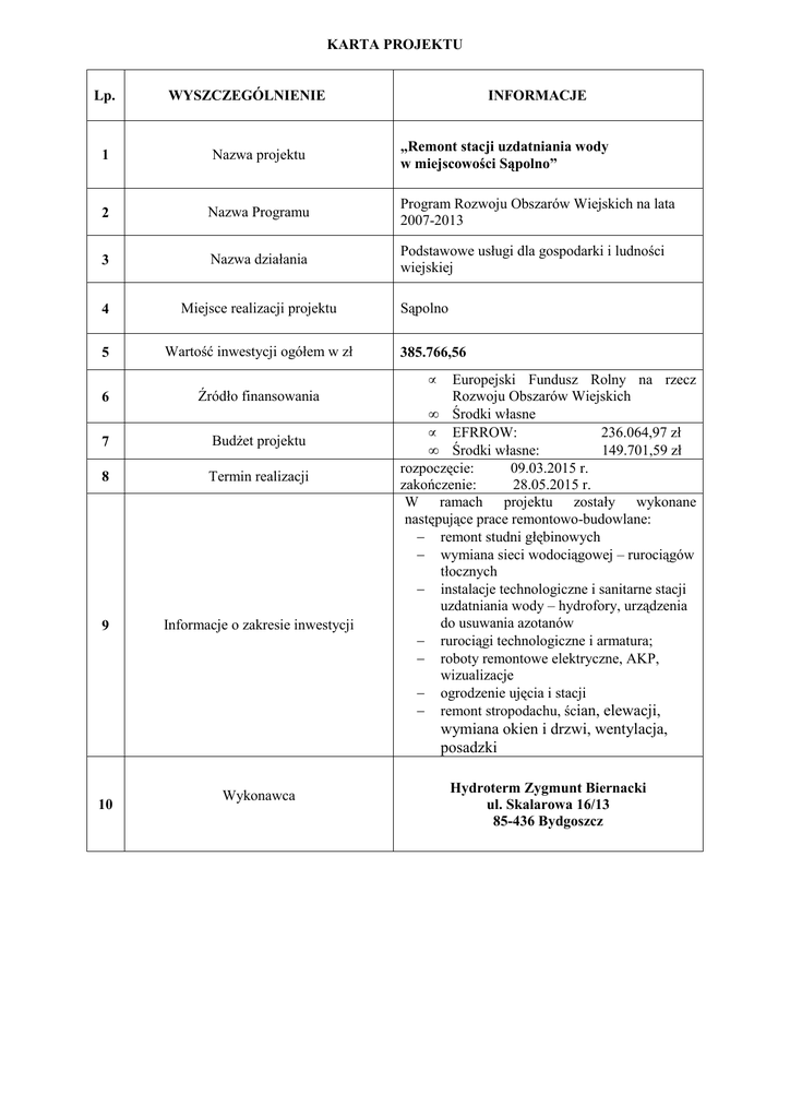 KARTA PROJEKTU Lp. WYSZCZEGÓLNIENIE INFORMACJE „Remont stacji uzdatniania wody w miejscowości Sąpolno” 1 Nazwa projektu 2 Nazwa Programu Program Rozwoju Obszarów Wiejskich na lata 2007-2013 3 Nazwa działania Podstawowe usługi dla gospodarki i ludności wiejskiej 4 Miejsce realizacji projektu 5 Wartość inwestycji ogółem w zł 6 Źródło finansowania 7 Budżet projektu 8 Termin realizacji 9 Informacje o zakresie inwestycji Sąpolno 385.766,56 • Europejski Fundusz Rolny na rzecz Rozwoju Obszarów Wiejskich • Środki własne • EFRROW: 236.064,97 zł • Środki własne: 149.701,59 zł rozpoczęcie: 09.03.2015 r. zakończenie: 28.05.2015 r. W ramach projektu zostały wykonane następujące prace remontowo-budowlane: − remont studni głębinowych − wymiana sieci wodociągowej – rurociągów tłocznych − instalacje technologiczne i sanitarne stacji uzdatniania wody – hydrofory, urządzenia do usuwania azotanów − rurociągi technologiczne i armatura; − roboty remontowe elektryczne, AKP, wizualizacje − ogrodzenie ujęcia i stacji − remont stropodachu, ścian, elewacji, wymiana okien i drzwi, wentylacja, posadzki 10 Wykonawca Hydroterm Zygmunt Biernacki ul. Skalarowa 16/13 85-436 Bydgoszcz