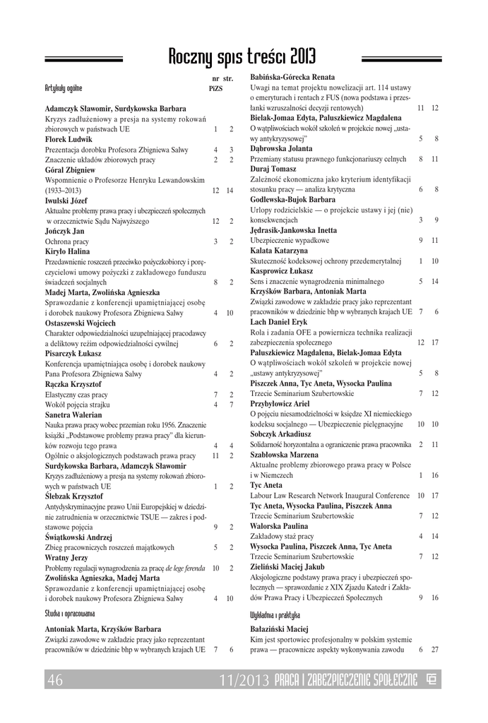 Roczny spis treœci 2013 nr str. Artyku³y ogólne Adamczyk Sławomir, Surdykowska Barbara Kryzys zadłużeniowy a presja na systemy rokowań zbiorowych w państwach UE Florek Ludwik Prezentacja dorobku Profesora Zbigniewa Salwy Znaczenie układów zbiorowych pracy Góral Zbigniew Wspomnienie o Profesorze Henryku Lewandowskim (1933–2013) Iwulski Józef Aktualne problemy prawa pracy i ubezpieczeń społecznych w orzecznictwie Sądu Najwyższego Jończyk Jan Ochrona pracy Kiryło Halina Przedawnienie roszczeń przeciwko pożyczkobiorcy i poręczycielowi umowy pożyczki z zakładowego funduszu świadczeń socjalnych Madej Marta, Zwolińska Agnieszka Sprawozdanie z konferencji upamiętniającej osobę i dorobek naukowy Profesora Zbigniewa Salwy Ostaszewski Wojciech Charakter odpowiedzialności uzupełniającej pracodawcy a deliktowy reżim odpowiedzialności cywilnej Pisarczyk Łukasz Konferencja upamiętniająca osobę i dorobek naukowy Pana Profesora Zbigniewa Salwy Rączka Krzysztof Elastyczny czas pracy Wokół pojęcia strajku Sanetra Walerian Nauka prawa pracy wobec przemian roku 1956. Znaczenie książki „Podstawowe problemy prawa pracy” dla kierunków rozwoju tego prawa Ogólnie o aksjologicznych podstawach prawa pracy Surdykowska Barbara, Adamczyk Sławomir Kryzys zadłużeniowy a presja na systemy rokowań zbiorowych w państwach UE Ślebzak Krzysztof Antydyskryminacyjne prawo Unii Europejskiej w dziedzinie zatrudnienia w orzecznictwie TSUE — zakres i podstawowe pojęcia Świątkowski Andrzej Zbieg pracowniczych roszczeń majątkowych Wratny Jerzy Problemy regulacji wynagrodzenia za pracę de lege ferenda Zwolińska Agnieszka, Madej Marta Sprawozdanie z konferencji upamiętniającej osobę i dorobek naukowy Profesora Zbigniewa Salwy PiZS 1 2 4 2 3 2 12 14 12 2 3 2 8 2 4 10 6 2 4 2 7 4 2 7 4 11 4 2 1 2 Babińska-Górecka Renata Uwagi na temat projektu nowelizacji art. 114 ustawy o emeryturach i rentach z FUS (nowa podstawa i przesłanki wzruszalności decyzji rentowych) Bielak-Jomaa Edyta, Paluszkiewicz Magdalena O wątpliwościach wokół szkoleń w projekcie nowej „ustawy antykryzysowej” Dąbrowska Jolanta Przemiany statusu prawnego funkcjonariuszy celnych Duraj Tomasz Zależność ekonomiczna jako kryterium identyfikacji stosunku pracy — analiza krytyczna Godlewska-Bujok Barbara Urlopy rodzicielskie — o projekcie ustawy i jej (nie) konsekwencjach Jędrasik-Jankowska Inetta Ubezpieczenie wypadkowe Kalata Katarzyna Skuteczność kodeksowej ochrony przedemerytalnej Kasprowicz Łukasz Sens i znaczenie wynagrodzenia minimalnego Krzyśków Barbara, Antoniak Marta Związki zawodowe w zakładzie pracy jako reprezentant pracowników w dziedzinie bhp w wybranych krajach UE Lach Daniel Eryk Rola i zadania OFE a powiernicza technika realizacji zabezpieczenia społecznego Paluszkiewicz Magdalena, Bielak-Jomaa Edyta O wątpliwościach wokół szkoleń w projekcie nowej „ustawy antykryzysowej” Piszczek Anna, Tyc Aneta, Wysocka Paulina Trzecie Seminarium Szubertowskie Przybyłowicz Ariel O pojęciu niesamodzielności w księdze XI niemieckiego kodeksu socjalnego — Ubezpieczenie pielęgnacyjne Sobczyk Arkadiusz Solidarność horyzontalna a ograniczenie prawa pracownika Szabłowska Marzena Aktualne problemy zbiorowego prawa pracy w Polsce i w Niemczech Tyc Aneta Labour Law Research Network Inaugural Conference Tyc Aneta, Wysocka Paulina, Piszczek Anna Trzecie Seminarium Szubertowskie Walorska Paulina Zakładowy staż pracy Wysocka Paulina, Piszczek Anna, Tyc Aneta Trzecie Seminarium Szubertowskie Zieliński Maciej Jakub Aksjologiczne podstawy prawa pracy i ubezpieczeń społecznych — sprawozdanie z XIX Zjazdu Katedr i Zakładów Prawa Pracy i Ubezpieczeń Społecznych 11 12 5 8 8 11 6 8 3 9 9 11 1 10 5 14 7 6 12 17 5 8 7 12 10 10 2 11 1 16 10 17 7 12 4 14 7 12 9 16 Studia i opracowania Wyk³adnia i praktyka Antoniak Marta, Krzyśków Barbara Związki zawodowe w zakładzie pracy jako reprezentant pracowników w dziedzinie bhp w wybranych krajach UE Bałaziński Maciej Kim jest sportowiec profesjonalny w polskim systemie prawa — pracownicze aspekty wykonywania zawodu 6 27 46 9 2 5 2 10 2 4 10 7 6 11/2013 PRACA I ZABEZPIECZENIE SPO£ECZNE Borowicz Jacek Pracowniczy obowiązek przestrzegania tajemnicy określonej w odrębnych przepisach (art. 100 § 2 pkt 5 k.p.) Drabek Agata, Wrocławska Tatiana Nowe rozwiązania na rzecz ochrony miejsc pracy — zakres podmiotowy i przedmiotowy ustawy „antykryzysowej” z 11 października 2013 r. Gersdorf Małgorzata, Raczkowski Michał O formułowaniu przyczyny rozwiązania stosunku pracy Godlewska-Bujok Barbara Nowe regulacje uprawnień związanych z rodzicielstwem Jankowska Marlena, Pawełczyk Mirosław Likwidacja pracowniczego programu emerytalnego w przypadku przejęcia zakładu pracy Kijonka Michał Przesłanki exemplar initiations i modus operandi pracowniczych akcji strajkowych — ujęcie generalne Kubot Zdzisław Negocjacje NFZ z oferentami: zastąpienie komisji konkursowej przez zespół Uznanie za pracownika osoby prowadzącej pozarolniczą działalność Wzory protokołów z negocjacji komisji konkursowej NFZ z oferentami Maniewska Eliza O braku przepisów przejściowych w ustawie z 26 lipca 2013 r. nowelizującej kodeks pracy w zakresie urlopów wychowawczych Parchomiuk Jerzy Problematyka emerytur pomostowych w orzecznictwie sądów administracyjnych Paszkowska Małgorzata Prawo polskiego pacjenta do planowanego leczenia zagranicznego Pawełczyk Mirosław, Jankowska Marlena Likwidacja pracowniczego programu emerytalnego w przypadku przejęcia zakładu pracy Pettke Paweł Ograniczenie prawa do strajku w zakładach generujących poważne zagrożenia dla bezpieczeństwa Podgórska-Rakiel Ewa Ochrona danych członków zarządu zakładowej organizacji związkowej Prusinowski Piotr Normalne wynagrodzenie za pracę w godzinach nadliczbowych System dyskrecjonalnej władzy sędziego w sprawach z powództwa pracownika Pułka Anna Kont