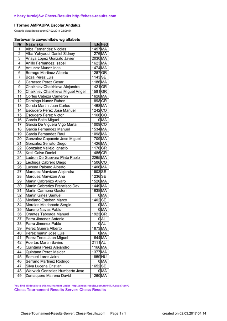 z bazy turniejów Chess-Results http://chess-results.com I Torneo AMPAUPA Escolar Andaluz Ostatnia aktualizacja strony27.02.2011 22:09:54 Sortowanie zawodników wg alfabetu Nr Nazwisko 1 Alba Fernandez Nicolas 2 Alba Yahyaoui Daniel Sidney 3 Anaya Lopez Gonzalo Javier 4 Anillo Fernandez Isabel 5 Antunez Munoz Ines 6 Borrego Martinez Alberto 7 Boza Perez Luis 8 Carrasco Perez Cesar 9 Chaikhiev Chaikhieva Alejandro 10 Chaikhiev Chaikhieva Miguel Angel 11 Cortes Cabeza Cameron 12 Domingo Nunez Ruben 13 Donda Martin Juan Carlos 14 Escudero Perez Jose Manuel 15 Escudero Perez Victor 16 Garcia Balta Miguel 17 Garcia De Viguera Vigo Marta 18 Garcia Fernandez Manuel 19 Garcia Fernandez Raul 20 Gonzalez Capacete Jose Miguel 21 Gonzalez Serrato Diego 22 Gonzalez Vallejo Ignacio 23 Krell Calvo Daniel 24 Ladron De Guevara Pinto Paolo 25 Lechuga Cabrero Diego 26 Lucena Palomo Alberto 27 Marquez Marvizon Alejandra 28 Marquez Marvizon Ana 29 Martin Cabrerizo Alvaro 30 Martin Cabrerizo Francisco Dav 31 Martin Carmona Gaston 32 Martin Gines Samuel 33 Mediano Esteban Marco 34 Morales Maldonado Sergio 35 Moreno Navas Pablo 36 Orantes Taboada Manuel 37 Parra Jimenez Antonio 38 Parra Jimenez Pablo 39 Perez Guerra Alberto 40 Perez martin Jose Luis 41 Perez Tores Juan Miguel 42 Puertas Martin Savins 43 Quintana Perez Alejandro 44 Quintana Perez Maider 45 Samuel Lares Jairo 46 Serrano Martinez Rodrigo 47 Silva Lucena Cristian 48 Warwick Gonzalez Humberto Jose 49 Zumaquero Mairena David Elo Fed 1457 MA 1276 MA 2030 MA 1623 MA 1474 MA 1287 GR 1143 SE 1186 MA 1421 GR 1581 GR 1628 MA 1898 GR 1468 MA 1242 CO 1166 CO 0 MA 1009 CO 1534 MA 1098 MA 1709 MA 1426 MA 1176 GR 1485 GR 2265 MA 1506 CO 1406 MA 1503 SE 1236 SE 1520 MA 1449 MA 1638 MA 0 MA 1402 SE 0 MA 0 MA 1923 GR 0 AL 0 AL 1873 MA 0 MA 1644 MA 2111 AL 1166 MA 1377 MA 1859 HU 0 MA 1652 SE 0 MA 1260 MA You find all details to this tournament under http://chess-results.com/tnr44737.aspx?lan=3 Chess-Tournament-Results-Server: Chess-Results Chess-Tournament-Results-Server: Chess-Results.com Page 1 / 1 created on 02.03.2017 04:14