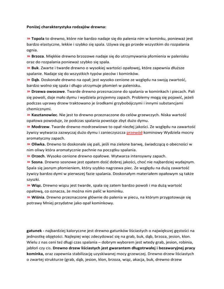 Poniżej charakterystyka rodzajów drewna: » Topola to drewno, które nie bardzo nadaje się do palenia nim w kominku, ponieważ jest bardzo elastyczne, lekkie i szybko się spala. Używa się go przede wszystkim do rozpalania ognia. » Brzoza. Miękkie drewno brzozowe nadaje się do utrzymywania płomienia w palenisku oraz do rozpalania ponieważ szybko się spala. » Buk. Zwarte i twarde drewno o wysokiej wartości opałowej, które zapewnia dłuższe spalanie. Nadaje się do wszystkich typów pieców i kominków. » Dąb. Doskonałe drewno na opał; jest wysoko cenione ze względu na swoją zwartość, bardzo wolno się spala i długo utrzymuje płomień w palenisku. » Drzewa owocowe. Twarde drewno przeznaczone do spalania w kominkach i piecach. Pali się powoli, daje mało dymu i wydziela przyjemny zapach. Problemy mogą się pojawić, jeżeli podczas uprawy drzew traktowano je środkami grzybobójczymi i innymi substancjami chemicznymi. » Kasztanowiec. Nie jest to drewno przeznaczone do celów grzewczych. Niska wartość opałowa powoduje, że podczas spalania powstaje zbyt dużo dymu. » Modrzew. Twarde drewno modrzewiowe to opał niezłej jakości. Ze względu na zawartość żywicy wytwarza zazwyczaj dużo dymu i zanieczyszcza przewód kominowy Wydziela mocny aromatyczny zapach. » Oliwka. Drewno to doskonale się pali, jeśli ma zielone barwę, świadczącą o obecności w nim oliwy która aromatycznie pachnie na początku spalania. » Orzech. Wysoko cenione drewno opałowe. Wytwarza intensywny zapach. » Sosna. Drewno sosnowe jest opatem dość dobrej jakości, choć nie najbardziej wydajnym. Spala się jasnym płomieniem, który szybko nagrzewa piec. Ze względu na dużą zawartość żywicy bardzo dymi w pierwszej fazie spalania. Doskonałym materiałem opałowym są także szyszki. » Wiąz. Drewno wiązu jest twarde, spala się zatem bardzo powoli i ma dużą wartość opałową, co oznacza, że można nim palić w kominku. » Wiśnia. Drewno przeznaczone głównie do palenia w piecu, na którym przygotowuje się potrawy Mniej przydatne jako opał kominkowy. gatunek - najbardziej kaloryczne jest drewno gatunków liściastych o największej gęstości na jednostkę objętości. Najlepiej więc zdecydować się na grab, buk, dąb, brzoza, jesion, klon. Wielu z nas ceni też długi czas spalania – dobrym wyborem jest wtedy grab, jesion, robinia, jabłoń czy cis. Drewno drzew liściastych jest gwarantem długotrwałej i bezawaryjnej pracy kominka, oraz zapewnia stabilizację uzyskiwanej mocy grzewczej. Drewno drzew liściastych o zwartej strukturze (grab, dąb, jesion, klon, brzoza, wiąz, akacja, buk, drewno drzew owocowych) pali się równomiernie, nie strzela i wydziela mało dymu. Drewno dębu i jesionu przy spalaniu dostarcza dużo ciepła i rzadko strzela. Drewno buku, klonu, brzozy pali się o wiele spokojniej, ale też dostarcza dużo mniej energii cieplnej. Drewno drzew owocowych podczas spalania wydziela przyjemny zapach. Drewno brzozowe wydziela szczególnie dużo sadzy, a drewno osiki nie tylko wydziela jej mało, ale też likwiduje już osiadłą w kominie sadzę. W przeciwieństwie do drewna drzew liściastych, drewno drzew iglastych zawiera dużo żywic, która podczas spalania daje dużo tłustej sadzy powodującej szybkie zanieczyszczenie paleniska, szyby i komina. Wielu z nas lubi strzelające przy spalaniu drewna drzew iglastych snopy iskier, jednak drewnem tym zdecydowanie nie należy palić w kominku. Możemy wpływać na kolor płomieni - dodając do paleniska jedno lub dwa polana nasycone roztworem soli kuchennej, uzyskamy płomienie żółte, nasycone zaś roztworem siarczanu miedzi – niebieskie. Drobnych suchych szczap należy używać tylko do rozpalania – ich spalanie jest bardzo intensywne i może powodować nadmierny i niepożądany wzrost temperatury w palenisku. Drewno bardzo ciężkie Gęstość [kg/m3] >800 Drewno ciężkie 710-800 Drewno umiarkowanie ciężkie Drewno umiarkowanie lekkie Drewno lekkie Drewno bardzo lekkie śliwa, grab, głóg robinia, jarząb, buk, jesion, dąb, jabłoń, grusza, orzech, wiąz 610-700 klon, brzoza, czereśnia, czeremcha 510-600 wiśnia, olcha, kasztan 410-500 <400 lipa, topola, osika, sosna, świerk, jodła wierzba, olsza szara Drewno bardzo ciężkie Gęstość [kg/m3] >800 Drewno ciężkie 710-800 Drewno umiarkowanie ciężkie Drewno umiarkowanie lekkie Drewno lekkie Drewno bardzo lekkie Gatunki Gatunki śliwa, grab, głóg robinia, jarząb, buk, jesion, dąb, jabłoń, grusza, orzech, wiąz 610-700 klon, brzoza, czereśnia, czeremcha 510-600 wiśnia, olcha, kasztan 410-500 <400 lipa, topola, osika, sosna, świerk, jodła wierzba, olsza szara