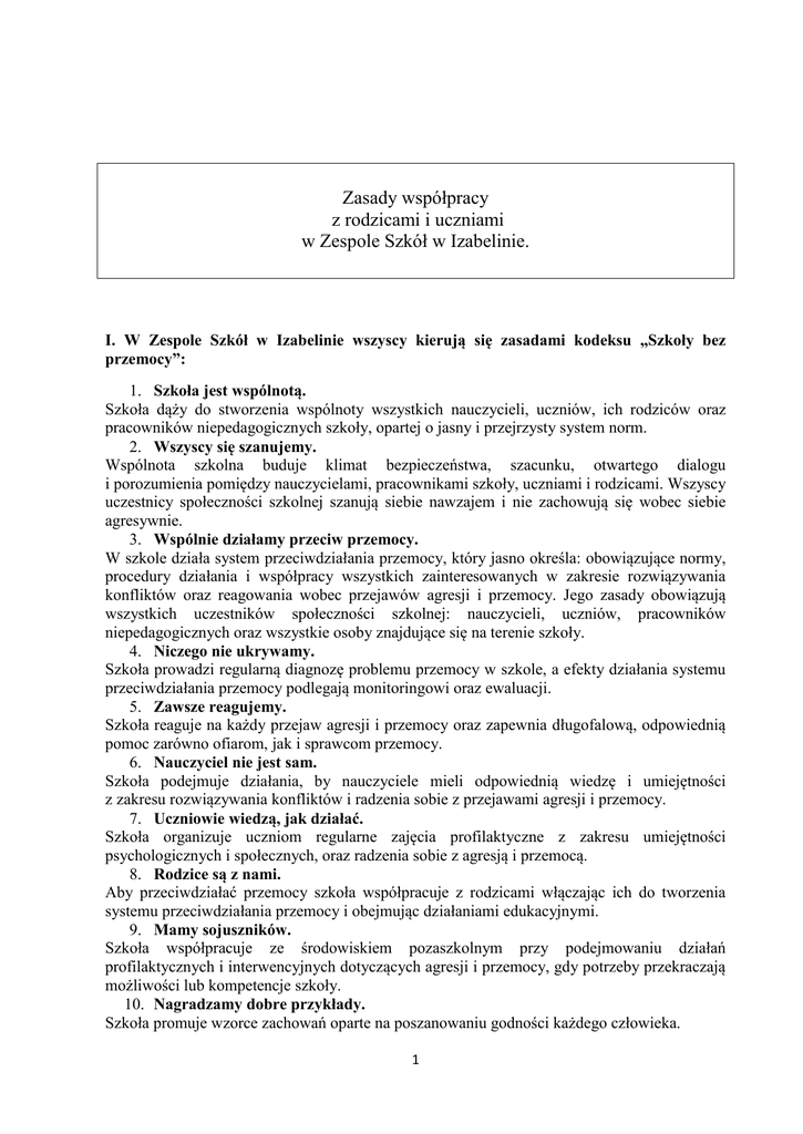 Zasady współpracy z rodzicami i uczniami w Zespole Szkół w Izabelinie. I. W Zespole Szkół w Izabelinie wszyscy kierują się zasadami kodeksu „Szkoły bez przemocy”: 1. Szkoła jest wspólnotą. Szkoła dąży do stworzenia wspólnoty wszystkich nauczycieli, uczniów, ich rodziców oraz pracowników niepedagogicznych szkoły, opartej o jasny i przejrzysty system norm. 2. Wszyscy się szanujemy. Wspólnota szkolna buduje klimat bezpieczeństwa, szacunku, otwartego dialogu i porozumienia pomiędzy nauczycielami, pracownikami szkoły, uczniami i rodzicami. Wszyscy uczestnicy społeczności szkolnej szanują siebie nawzajem i nie zachowują się wobec siebie agresywnie. 3. Wspólnie działamy przeciw przemocy. W szkole działa system przeciwdziałania przemocy, który jasno określa: obowiązujące normy, procedury działania i współpracy wszystkich zainteresowanych w zakresie rozwiązywania konfliktów oraz reagowania wobec przejawów agresji i przemocy. Jego zasady obowiązują wszystkich uczestników społeczności szkolnej: nauczycieli, uczniów, pracowników niepedagogicznych oraz wszystkie osoby znajdujące się na terenie szkoły. 4. Niczego nie ukrywamy. Szkoła prowadzi regularną diagnozę problemu przemocy w szkole, a efekty działania systemu przeciwdziałania przemocy podlegają monitoringowi oraz ewaluacji. 5. Zawsze reagujemy. Szkoła reaguje na każdy przejaw agresji i przemocy oraz zapewnia długofalową, odpowiednią pomoc zarówno ofiarom, jak i sprawcom przemocy. 6. Nauczyciel nie jest sam. Szkoła podejmuje działania, by nauczyciele mieli odpowiednią wiedzę i umiejętności z zakresu rozwiązywania konfliktów i radzenia sobie z przejawami agresji i przemocy. 7. Uczniowie wiedzą, jak działać. Szkoła organizuje uczniom regularne zajęcia profilaktyczne z zakresu umiejętności psychologicznych i społecznych, oraz radzenia sobie z agresją i przemocą. 8. Rodzice są z nami. Aby przeciwdziałać przemocy szkoła współpracuje z rodzicami włączając ich do tworzenia systemu przeciwdziałania przemocy i obejmując działaniami edukacyjnymi. 9. Mamy sojuszników. Szkoła współpracuje ze środowiskiem pozaszkolnym przy podejmowaniu działań profilaktycznych i interwencyjnych dotyczących agresji i przemocy, gdy potrzeby przekraczają możliwości lub kompetencje szkoły. 10. Nagradzamy dobre przykłady. Szkoła promuje wzorce zachowań oparte na poszanowaniu godności każdego człowieka. 1 II. W celu zminimalizowania problemów związanych z agresją i przemocą w szkole nauczyciele: 1) przeprowadzają z uczniami pogadanki na początku roku szkolnego i w trakcie jego trwania, 2) przekazują dzieciom instrukcje, co należy robić w sytuacji zaistnienia przemocy i agresji, 3) regularnie prowadzą monitoring problemu przemocy i agresji (np. spotkania z uczniami, skrzynki zaufania, badania ankietowe itp.). III. Informacje dla uczniów. 1. Uczniowie dbają o naszą szkołę, są kulturalni i koleżeńscy, przestrzegają poniższego regulaminu zachowania. 1) Podczas zajęć lekcyjnych: a) punktualnie przychodzimy na zajęcia, b) słuchamy poleceń nauczyciela, c) zgłaszamy chęć odpowiedzi podniesioną ręką, d) uważnie słuchamy osoby mówiącej, nie przerywamy, e) pracujemy w ciszy i skupieniu, f) podczas prac grupowych zgodnie pracujemy, g) nie krytykujemy, nie wyśmiewamy się z innych, h) nie używamy telefonów komórkowych, konsoli do gier, i) opuszczamy salę za zgodą nauczyciela, j) dbamy o bezpieczeństwo podczas zajęć. 2) W czasie przerw: a) poruszamy się bezpiecznie (nie biegamy) po korytarzach, b) przebywamy na wyznaczonych korytarzach, c) ostrożnie schodzimy ze schodów (nie skaczemy, nie zrzucamy nic ze schodów), d) przestrzegamy zasad bezpiecznego przemieszczania się do klas, e) zachowujemy się cicho (nie krzyczymy, nie piszczymy), f) nie przesiadujemy w toaletach, szatniach i przejściach na schodach, g) kulturalnie czekamy w kolejce do automatu z napojami, h) w razie nieporozumień korzystamy z pomocy nauczyciela – nie wymierzamy samodzielnie kary, i) kulturalnie rozwiązujemy konflikty, j) nie przezywamy, nie popychamy, nie bijemy się, k) na boisku dbamy o bezpieczeństwo własne i innych, l) nie wychodzimy poza teren boiska, m) po dzwonku ustawiamy się przed klasą. 3) W czasie uroczystości szkolnych: a) siadamy lub stoimy w grupie swojej klasy, b) zachowujemy ciszę, uważnie słuchamy, c) kulturalnie wyrażamy swoje emocje. 2 4) Przebywając w szkole i poza nią: a) dbamy o dobre imię naszej szkoły, pamiętamy o patronie, b) kłaniamy się nauczycielom i innym pracownikom szkoły, odnosimy się do nich z szacunkiem, c) stosujemy zwroty grzecznościowe, d) kulturalnie wyrażamy swoje poglądy, e) nie używamy wulgaryzmów, f) pomagamy sobie nawzajem, g) stosujemy się do zaleceń dyrektora i nauczycieli, h) dbamy o bezpieczeństwo swoje i innych, i) godnie reprezentujemy szkołę w konkursach i zawodach sportowych, j) szanujemy swoją i cudzą własność, k) dbamy o sprzęt i pomoce szkolne, l) ubieramy się schludnie i skromnie, w dni uroczystości szkolnych ubieramy się na galowo, m) dbamy o fryzury (włosy umyte i uczesane), przychodzimy do szkoły bez makijażu n) pamiętamy o zmianie obuwia, o) w szkole mamy potrzebne książki i zeszyty, przybory szkolne oraz dzienniczek ucznia, p) dbamy o porządek w klasach i na stołówce szkolnej. IV. Zachowania niepożądane w szkole podlegają konsekwencjom. Konsekwencja to nie jest kara. 1. Nauczyciel interweniujący doraźnie egzekwuje konsekwencje naturalne, powiadamia wychowawcę i dokonuje odpowiedniego wpisu do zeszytu klasowego (w klasach I – III do dziennika lekcyjnego) – bez punktów, z czytelną datą i podpisem. O wpisie powinien być poinformowany uczeń. 2. Naszym celem jest umożliwienie uczniowi doświadczenia przez niego odpowiedzialności za swoje czyny i wskazanie akceptowanych wzorów zachowań. 3. Wychowawca/nauczyciel decyduje o ilości i rodzaj