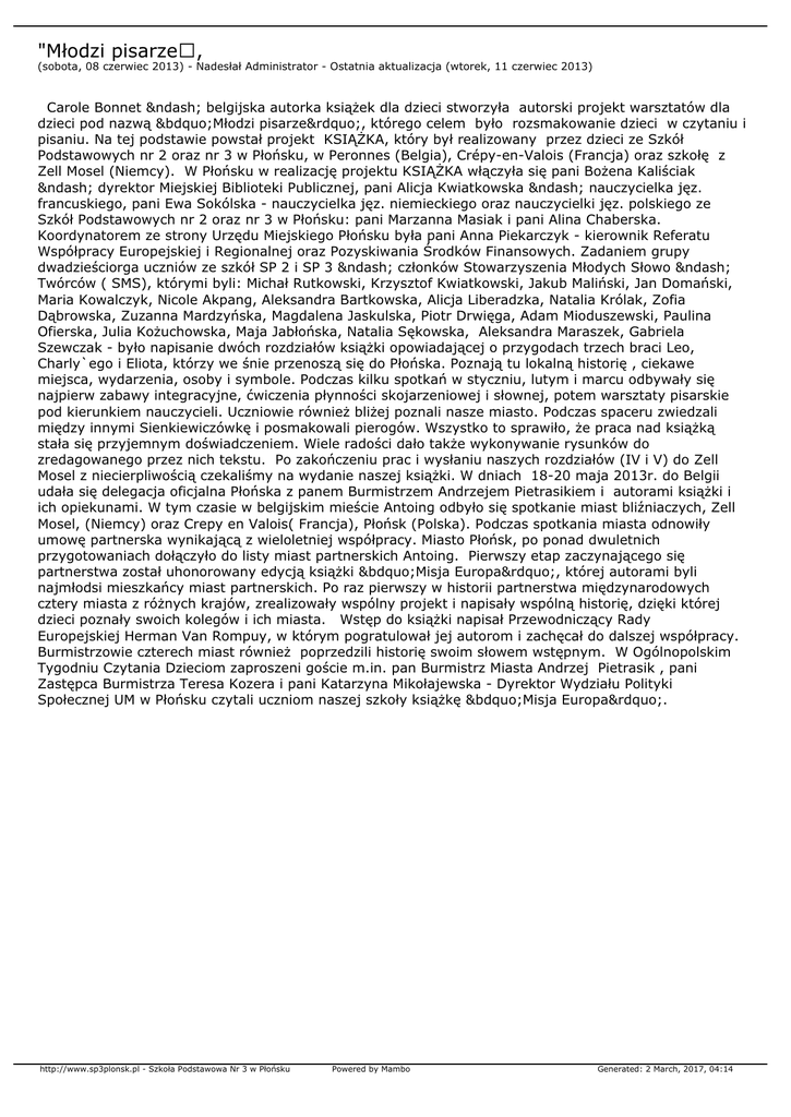 "Młodzi pisarze, (sobota, 08 czerwiec 2013) - Nadesłał Administrator - Ostatnia aktualizacja (wtorek, 11 czerwiec 2013) Carole Bonnet – belgijska autorka książek dla dzieci stworzyła autorski projekt warsztatów dla dzieci pod nazwą „Młodzi pisarze”, którego celem było rozsmakowanie dzieci w czytaniu i pisaniu. Na tej podstawie powstał projekt KSIĄŻKA, który był realizowany przez dzieci ze Szkół Podstawowych nr 2 oraz nr 3 w Płońsku, w Peronnes (Belgia), Crépy-en-Valois (Francja) oraz szkołę z Zell Mosel (Niemcy). W Płońsku w realizację projektu KSIĄŻKA włączyła się pani Bożena Kaliściak – dyrektor Miejskiej Biblioteki Publicznej, pani Alicja Kwiatkowska – nauczycielka jęz. francuskiego, pani Ewa Sokólska - nauczycielka jęz. niemieckiego oraz nauczycielki jęz. polskiego ze Szkół Podstawowych nr 2 oraz nr 3 w Płońsku: pani Marzanna Masiak i pani Alina Chaberska. Koordynatorem ze strony Urzędu Miejskiego Płońsku była pani Anna Piekarczyk - kierownik Referatu Współpracy Europejskiej i Regionalnej oraz Pozyskiwania Środków Finansowych. Zadaniem grupy dwadzieściorga uczniów ze szkół SP 2 i SP 3 – członków Stowarzyszenia Młodych Słowo – Twórców ( SMS), którymi byli: Michał Rutkowski, Krzysztof Kwiatkowski, Jakub Maliński, Jan Domański, Maria Kowalczyk, Nicole Akpang, Aleksandra Bartkowska, Alicja Liberadzka, Natalia Królak, Zofia Dąbrowska, Zuzanna Mardzyńska, Magdalena Jaskulska, Piotr Drwięga, Adam Mioduszewski, Paulina Ofierska, Julia Kożuchowska, Maja Jabłońska, Natalia Sękowska, Aleksandra Maraszek, Gabriela Szewczak - było napisanie dwóch rozdziałów książki opowiadającej o przygodach trzech braci Leo, Charly`ego i Eliota, którzy we śnie przenoszą się do Płońska. Poznają tu lokalną historię , ciekawe miejsca, wydarzenia, osoby i symbole. Podczas kilku spotkań w styczniu, lutym i marcu odbywały się najpierw zabawy integracyjne, ćwiczenia płynności skojarzeniowej i słownej, potem warsztaty pisarskie pod kierunkiem nauczycieli. Uczniowie również bliżej poznali nasze miasto. Podczas spaceru zwiedzali między innymi Sienkiewiczówkę i posmakowali pierogów. Wszystko to sprawiło, że praca nad książką stała się przyjemnym doświadczeniem. Wiele radości dało także wykonywanie rysunków do zredagowanego przez nich tekstu. Po zakończeniu prac i wysłaniu naszych rozdziałów (IV i V) do Zell Mosel z niecierpliwością czekaliśmy na wydanie naszej książki. W dniach 18-20 maja 2013r. do Belgii udała się delegacja oficjalna Płońska z panem Burmistrzem Andrzejem Pietrasikiem i autorami książki i ich opiekunami. W tym czasie w belgijskim mieście Antoing odbyło się spotkanie miast bliźniaczych, Zell Mosel, (Niemcy) oraz Crepy en Valois( Francja), Płońsk (Polska). Podczas spotkania miasta odnowiły umowę partnerska wynikającą z wieloletniej współpracy. Miasto Płońsk, po ponad dwuletnich przygotowaniach dołączyło do listy miast partnerskich Antoing. Pierwszy etap zaczynającego się partnerstwa został uhonorowany edycją książki „Misja Europa”, której autorami byli najmłodsi mieszkańcy miast partnerskich. Po raz pierwszy w historii partnerstwa międzynarodowych cztery miasta z różnych krajów, zrealizowały wspólny projekt i napisały wspólną historię, dzięki której dzieci poznały swoich kolegów i ich miasta. Wstęp do książki napisał Przewodniczący Rady Europejskiej Herman Van Rompuy, w którym pogratulował jej autorom i zachęcał do dalszej współpracy. Burmistrzowie czterech miast również poprzedzili historię swoim słowem wstępnym. W Ogólnopolskim Tygodniu Czytania Dzieciom zaproszeni goście m.in. pan Burmistrz Miasta Andrzej Pietrasik , pani Zastępca Burmistrza Teresa Kozera i pani Katarzyna Mikołajewska - Dyrektor Wydziału Polityki Społecznej UM w Płońsku czytali uczniom naszej szkoły książkę „Misja Europa”. http://www.sp3plonsk.pl - Szkoła Podstawowa Nr 3 w Płońsku Powered by Mambo Generated: 2 March, 2017, 04:14