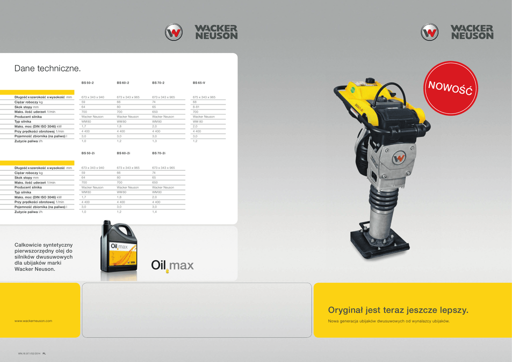 Dane techniczne. BS 50-2 BS 60-2 BS 70-2 BS 65-V Długość x szerokość x wysokość mm 673 x 343 x 940 673 x 343 x 965 673 x 343 x 965 675 x 343 x 965 Ciężar roboczy kg 59 66 74 68 Skok stopy mm 64 80 65 8-81 Maks. ilość uderzeń 1/min 700 700 650 700 Producent silnika Wacker Neuson Wacker Neuson Wacker Neuson Wacker Neuson Typ silnika WM 80 WM 80 WM 80 WM 80 Maks. moc (DIN ISO 3046) kW 1,7 1,8 2,0 2,0 Przy prędkości obrotowej 1/min 4 400 4 400 4 400 4 400 Pojemność zbiornika (na paliwo) l 3,0 3,0 3,0 3,0 Zużycie paliwa l/h 1,0 1,2 1,3 1,2 BS 50-2i BS 60-2i BS 70-2i Długość x szerokość x wysokość mm 673 x 343 x 940 673 x 343 x 965 673 x 343 x 965 Ciężar roboczy kg 59 66 74 Skok stopy mm 64 80 65 Maks. ilość uderzeń 1/min 700 700 650 Producent silnika Wacker Neuson Wacker Neuson Wacker Neuson Typ silnika WM 80 WM 80 WM 80 Maks. moc (DIN ISO 3046) kW 1,7 1,8 2,0 Przy prędkości obrotowej 1/min 4 400 4 400 4 400 Pojemność zbiornika (na paliwo) l 3,0 3,0 3,0 Zużycie paliwa l/h 1,0 1,2 1,4 N O WO ŚĆ Całkowicie syntetyczny pierwszorzędny olej do silników dwusuwowych dla ubijaków marki Wacker Neuson. Oryginał jest teraz jeszcze lepszy. www.wackerneuson.com WN.16.97.1/02/2014 PL Nowa generacja ubijaków dwusuwowych od wynalazcy ubijaków. www.wackerneuson.com/eco Nowe ubijaki dwusuwowe marki Wacker Neuson oferują jeszcze lepszą wydajność. Mistrz niskiego poziomu emisji spalin: silnik dwusuwowy WM 80. L e pi s ku te e j, czni e j, po p r ost Wa c k er Ne u u son ! Dopuszcz alne maksymalne wartości SILNIKÓW DWUSUWOW YCH 72 603 SILNIK DWUSUWOW Y w ubijaku Wacker Neuson Dopuszcz alne maksymalne wartości SILNIKI CZTEROSUWOWE WM 80 EMISJE OGÓ ŁEM w g /kWh CO Emisje zgodnie z dyrektywą UE 2011/88/WE 40 610 SILNIK CZTEROSUWOW Y w ubijaku Wacker Neuson Przegląd zalet nowej generacji ubijaków dwusuwowych: HC + NOx Silnik czterosuwowe 0 100 200 300 400 500 600 700 Lepszy filtr powietrza: zapewnia dłuższe odstępy międzyobsługowe. Nowe ergonomiczne pokrętło gazu z e stabilną osłoną blaszaną zapewniającą lepszą kontrolę nad maszyną i dłuższą wytrzymałość. Korzyści dla przedsiębiorców: Optymalna konstrukcja uchwytu zapewniająca wygodną obsługę. - - Wysoka produktywność dzięki wysokiej częstotliwości ubijania i silnemu skokowi. Duży zbiornik oleju we wszystkich ubijakach z oddzielnym smarowaniem olejowym. D o 100 godzin cyklu pracy przy jednym napełnieniu oleju. - - Niskie wibracje dłoń/ramię. Wyższe uchwyty transportowe: jeszcze bardziej ułatwiają transport. - - Łatwy do transportowania – dzięki dłuższemu uchwytowi transportowemu, który teraz jest jeszcze lepszy. - - Nie wymaga częstych konserwacji dzięki nowej technologii filtra powietrza i dużemu zbiornikowi oleju* . Korzyści dla operatorów: - - Ergonomiczne pokrętło gazu: zapewnia lepszą kontrolę nad maszyną. - - Niskie wibracje dłoń/ramię. - - Optymalna konstrukcja uchwytu zapewniająca wygodną obsługę. Lepsze ergonomiczne pokrętło gazu: lepsza chwytliwość zapewniająca lepszą kontrolę nad maszyną. Wyższe uchwyty transportowe oferują więcej miejsca np. dla zawiesi okrągłych (poślizg). - - Wydłużone odstępy międzyobsługowe dzięki nowej technologii filtra powietrza i dużemu zbiornikowi oleju*. Korzyści dla podmiotów wynajmujących: - - Dłuższe odstępy międzyobsługowe. - - Brak konieczności konserwacji dzięki nowej technologii filtra powietrza i dużemu zbiornikowi oleju*. - - Łatwy do transportowania – dzięki dłuższemu uchwytowi transportowemu, który teraz jest jeszcze lepszy. - - Oszczędność miejsca przy magazynowaniu. ** Dotyczy wyłącznie modeli z oddzielnym smarowaniem olejowym. 2 _3