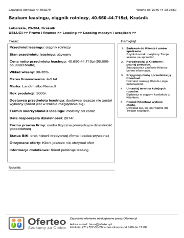 Zapytanie ofertowe nr: 963279 Ważne do: 2016-11-28 23:59 Szukam leasingu, ciągnik rolniczy, 40.650-44.715zł, Kraśnik Lubelskie, 23-204, Kraśnik USŁUGI >> Prawo i finanse >> Leasing >> Leasing maszyn i urządzeń >> Treść: Pamiętaj! Przedmiot leasingu: ciągnik rolniczy 1. Zadzwoń do Klienta i umów spotkanie. Szybki kontakt zwiększy Twoje szanse na sprzedaż. Stan przedmiotu leasingu: używany Cena netto przedmiotu leasingu: 40.650-44.715zł (50.00055.000zł brutto) Wkład własny: 30-35% 2. Porozmawiaj z Klientem i poznaj potrzeby. Zdobędziesz zaufanie Klienta i cenne informacje. 3. Przygotuj ofertę i przedstaw ją Klientowi. Poznasz reakcję Klienta i jego oczekiwania. Okres finansowania: 4-5 lat Marka: Landini albo Renault 4. Umawiaj terminy kolejnych rozmów. Będziesz w ciągłym kontakcie z Klientem. 5. Pomóż Klientowi wybrać ofertę. Dowiesz się, co jest ważne dla Twoich Klientów. Rok produkcji: 2000r. Dostawca przedmiotu leasingu: dostawca jeszcze nie został wybrany (Klient jest w trakcie rozglądania się) Termin skorzystania z leasingu: możliwy od zaraz Data rozpoczęcia działalności: 2014r. Forma prawna firmy: osoba fizyczna prowadząca działalność gospodarczą Status BIK: brak historii kredytowej (firma i osoba prywatna) Otrzymane oferty: Klient jeszcze nie otrzymał ofert Informacje dodatkowe: Klient preferuje leasing Notatki: Zapytanie ofertowe obsługiwane przez Oferteo.pl Adres e-mail: [email protected] Infolinia: (71) 722-33-28 w dni robocze od 9:00 do 17:00